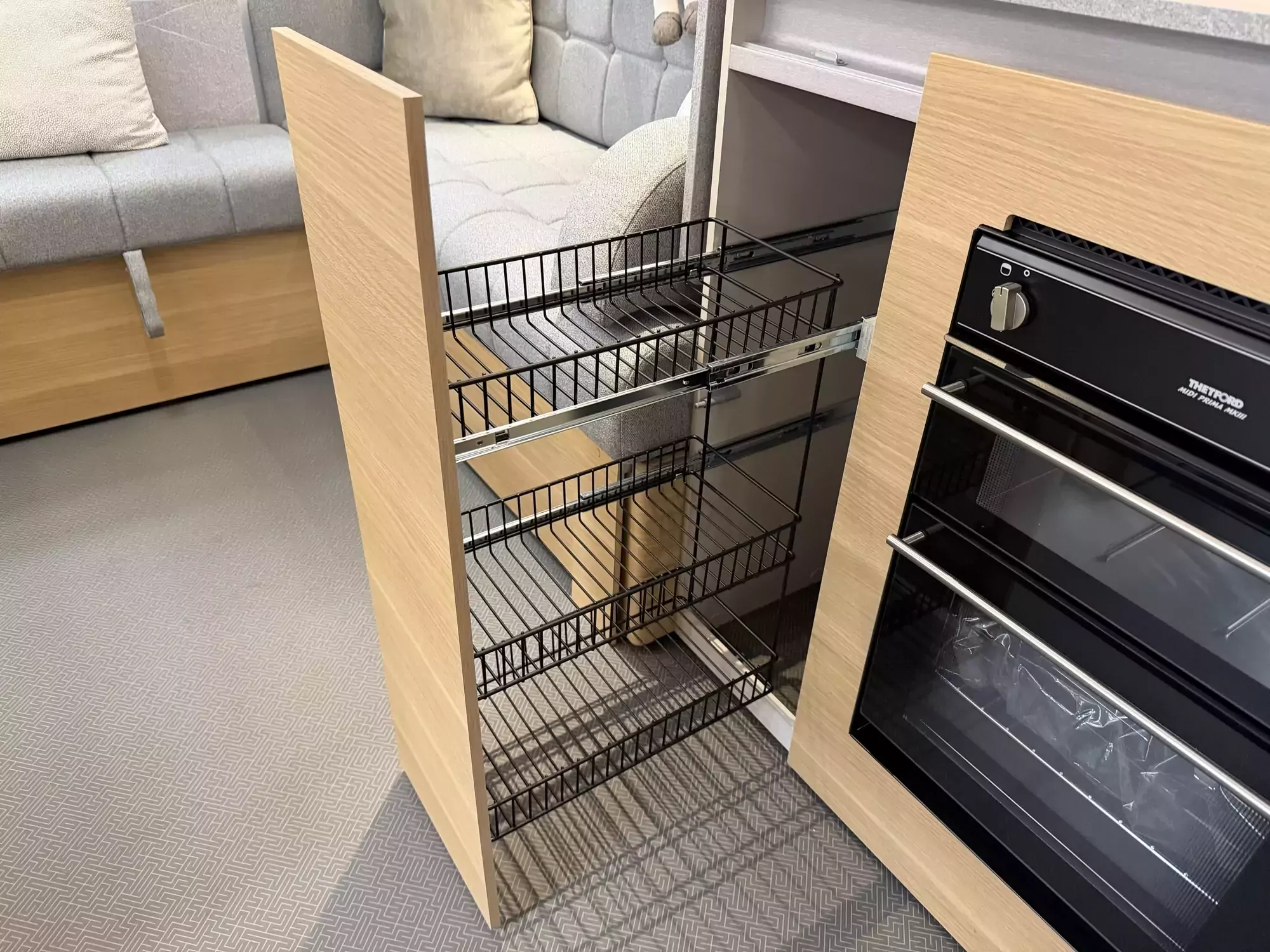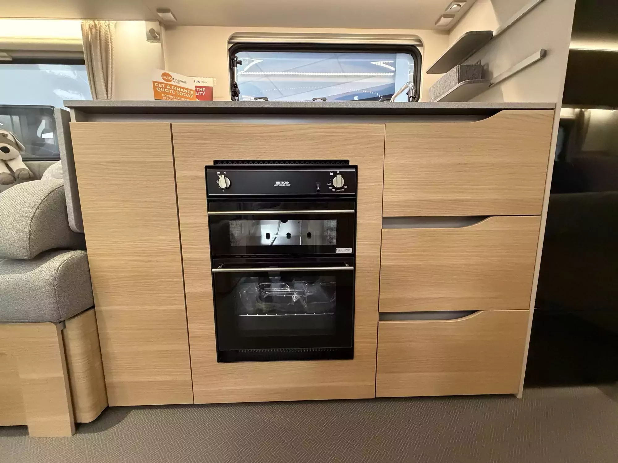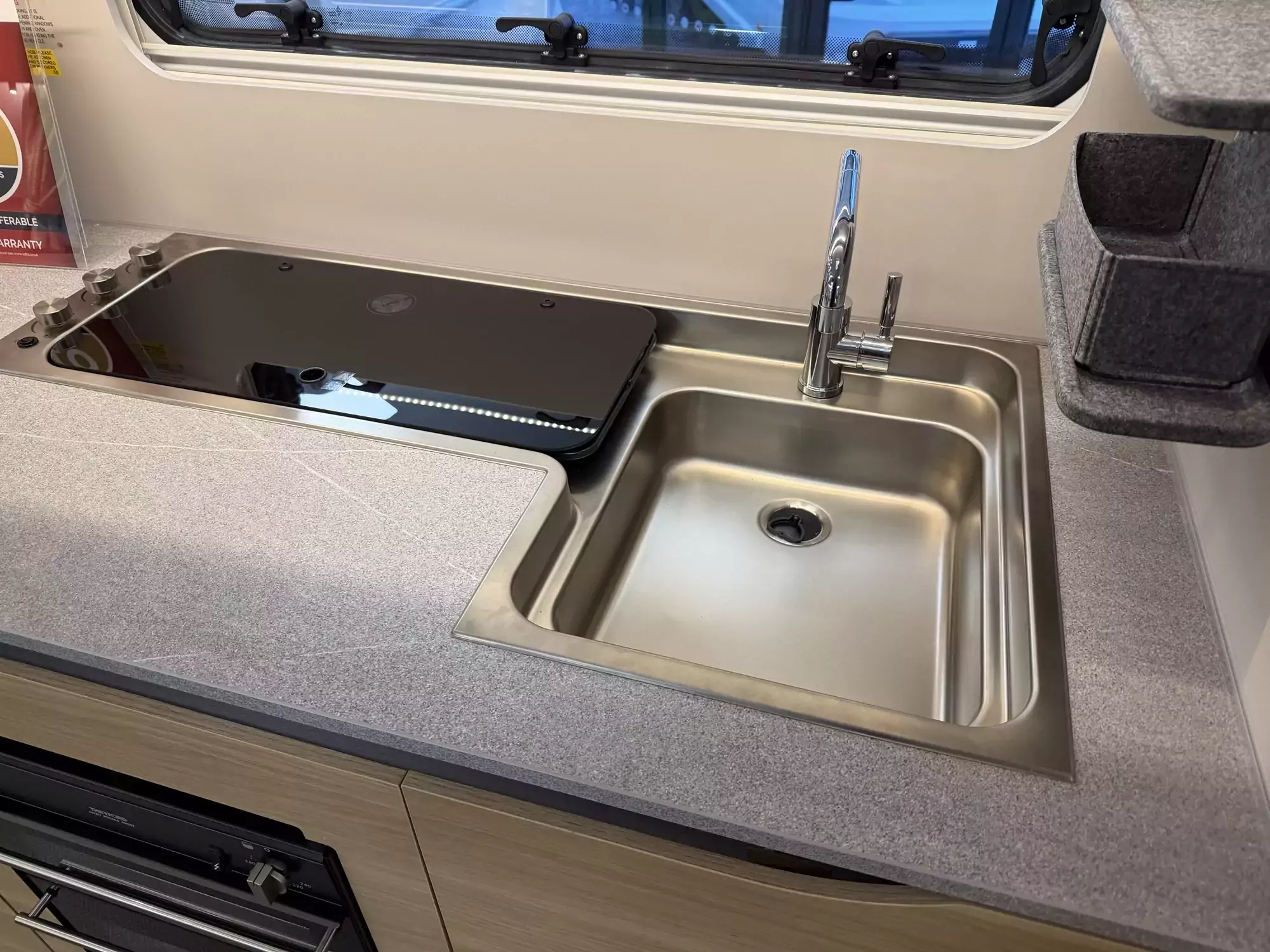 The centre kitchen comprises all mod-cons, a 3-burner hob, grill and oven and 140litre larder fridge and a microwave is available in the optional all-inclusive pack giving the feeling of an open plan kitchen diner separate from the rest of the caravan.