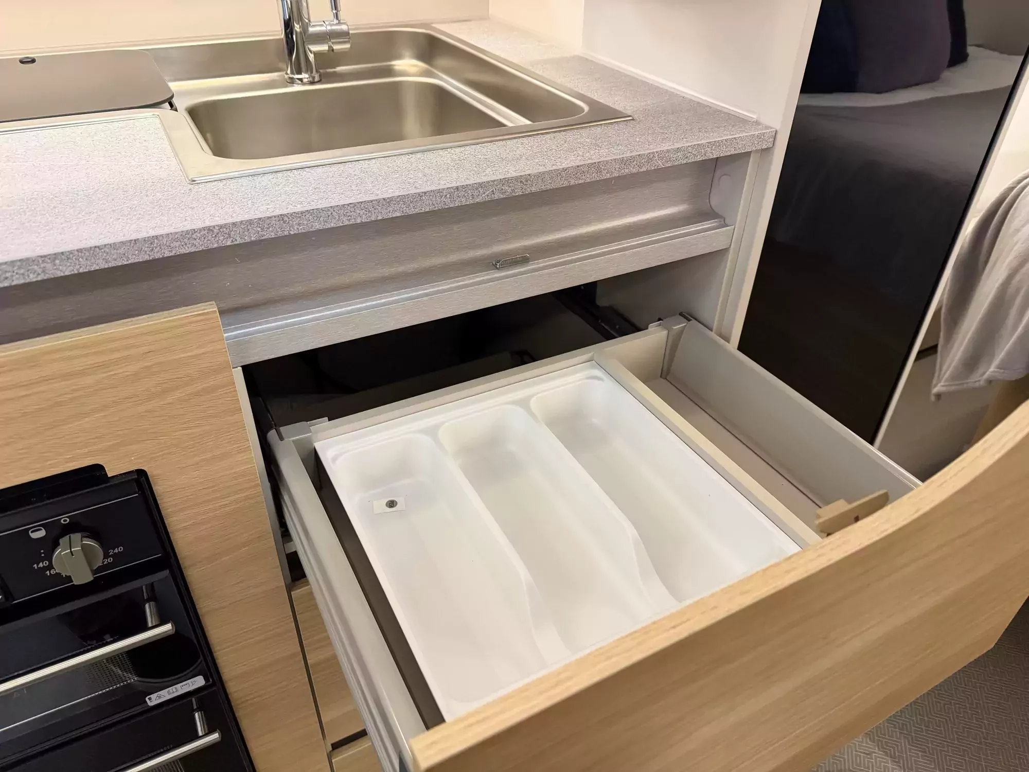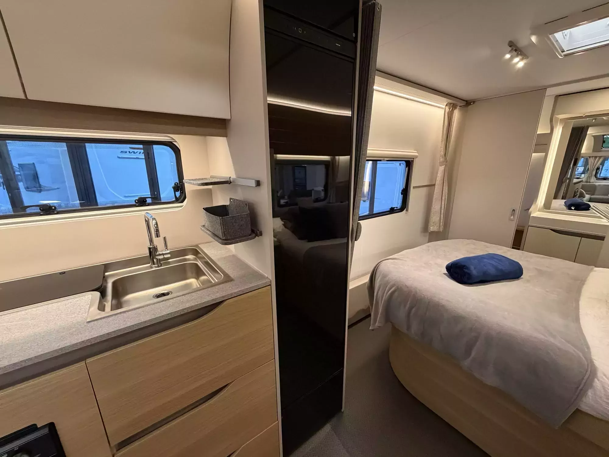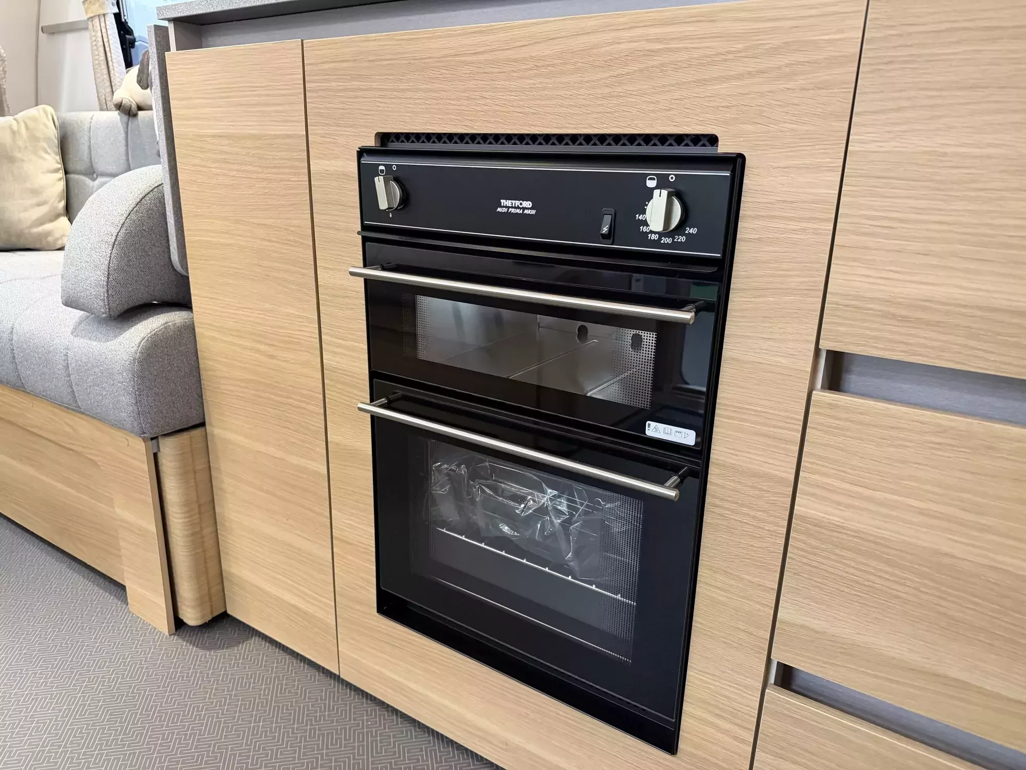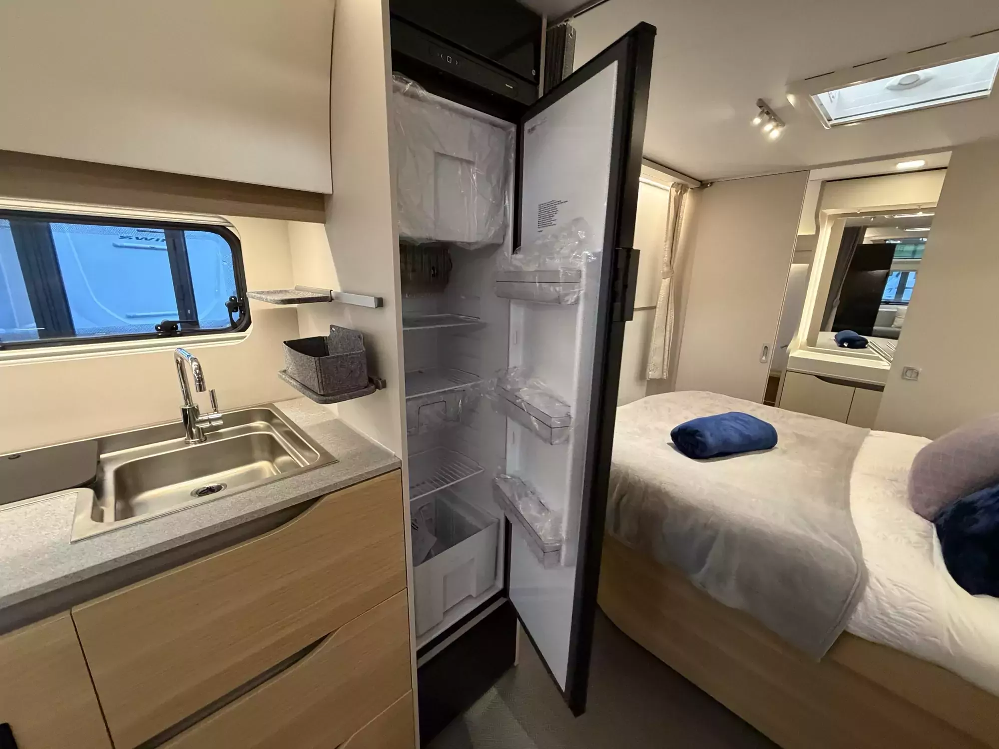 The centre kitchen comprises all mod-cons, a 3-burner hob, grill and oven and 140litre larder fridge and a microwave is available in the optional all-inclusive pack giving the feeling of an open plan kitchen diner separate from the rest of the caravan.