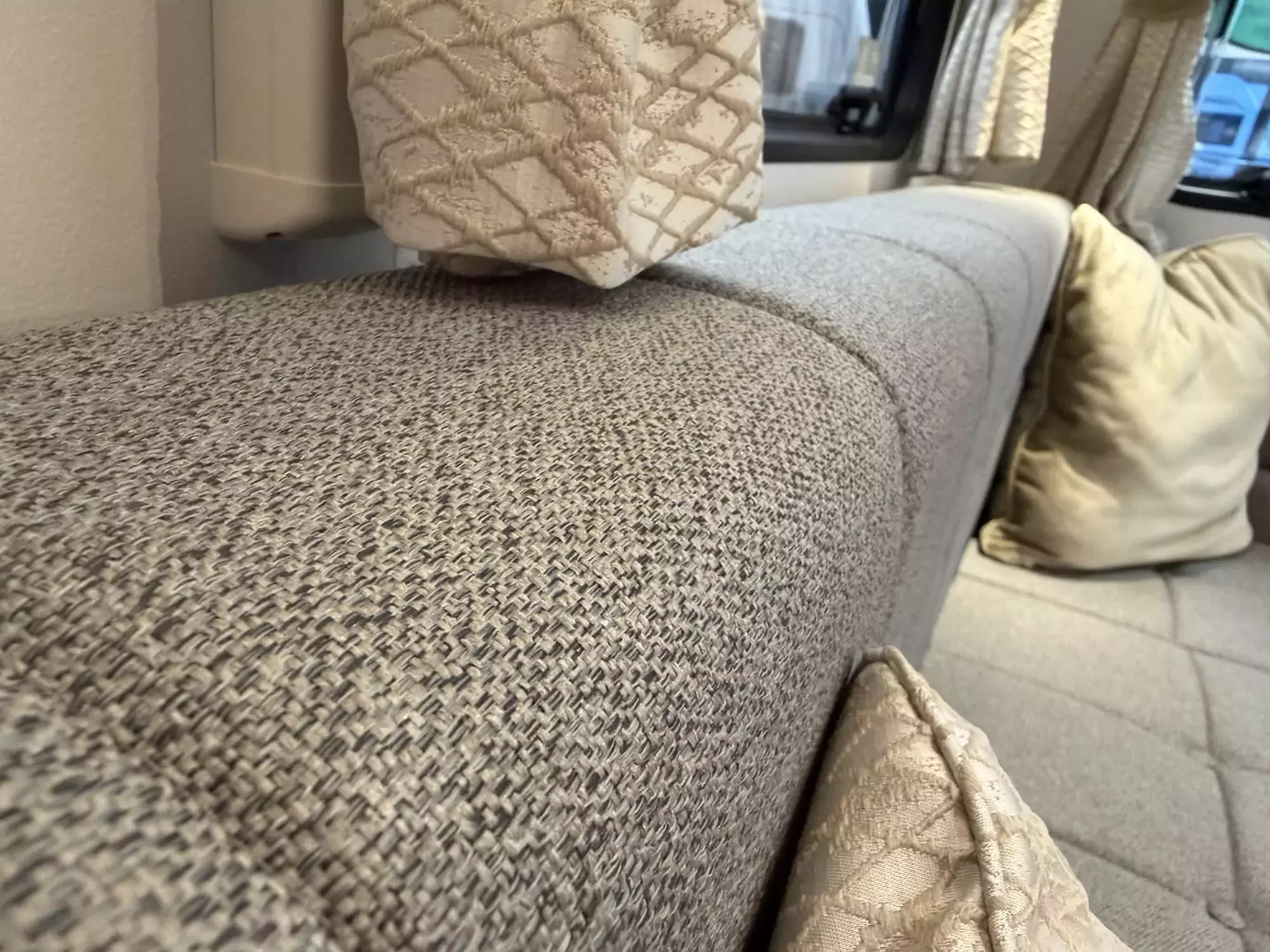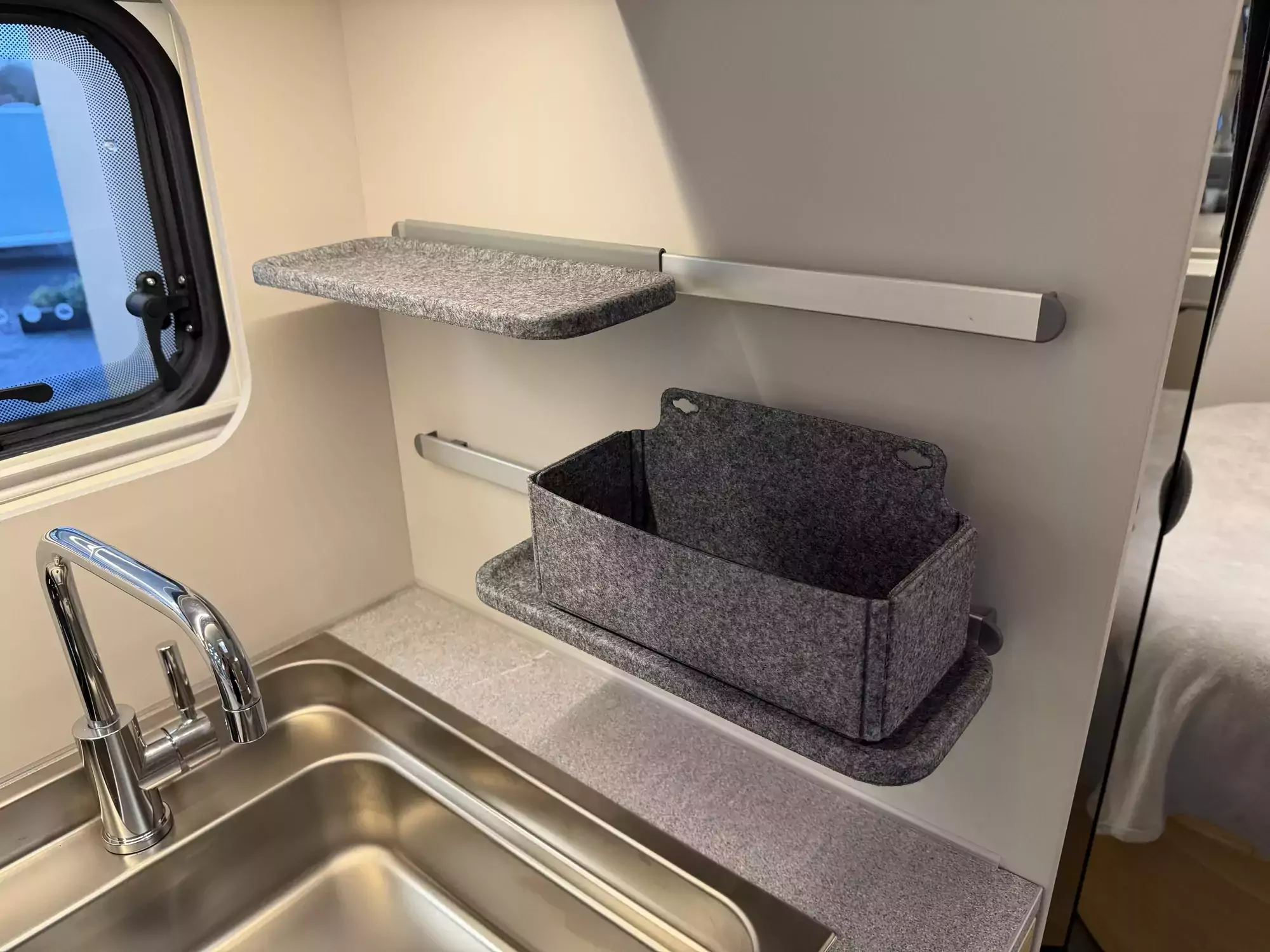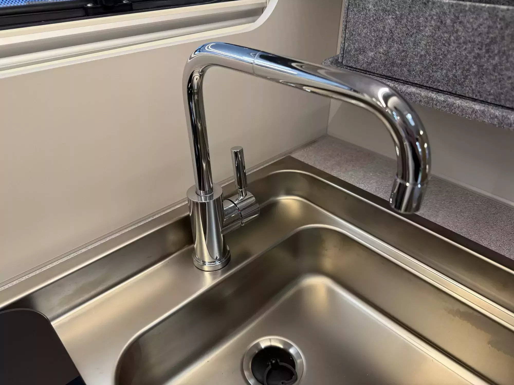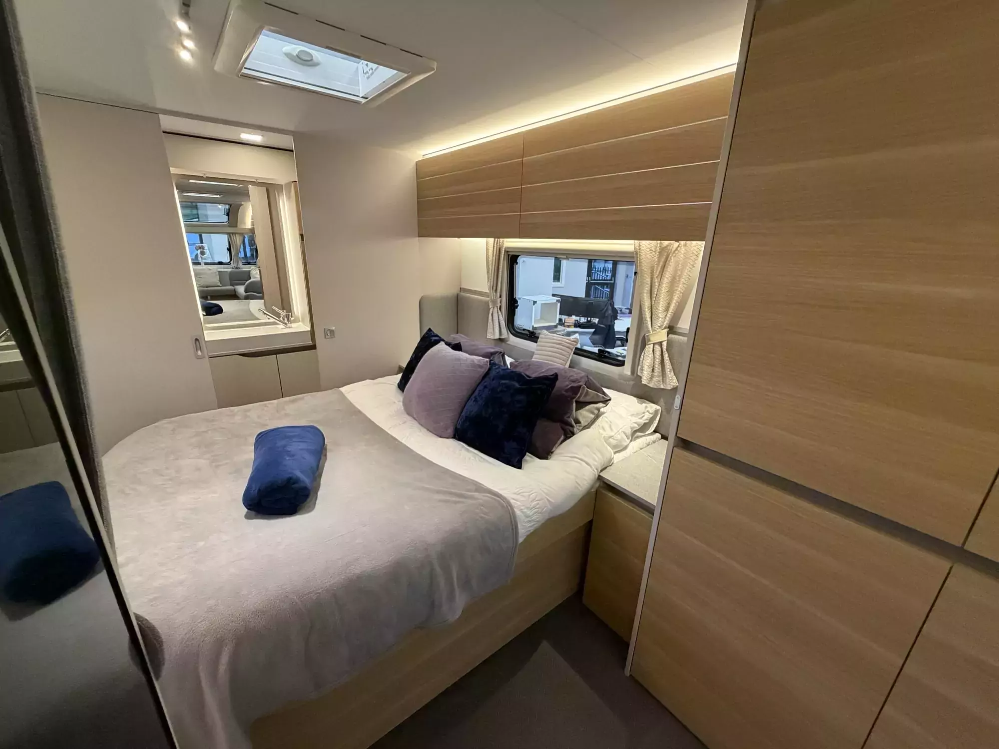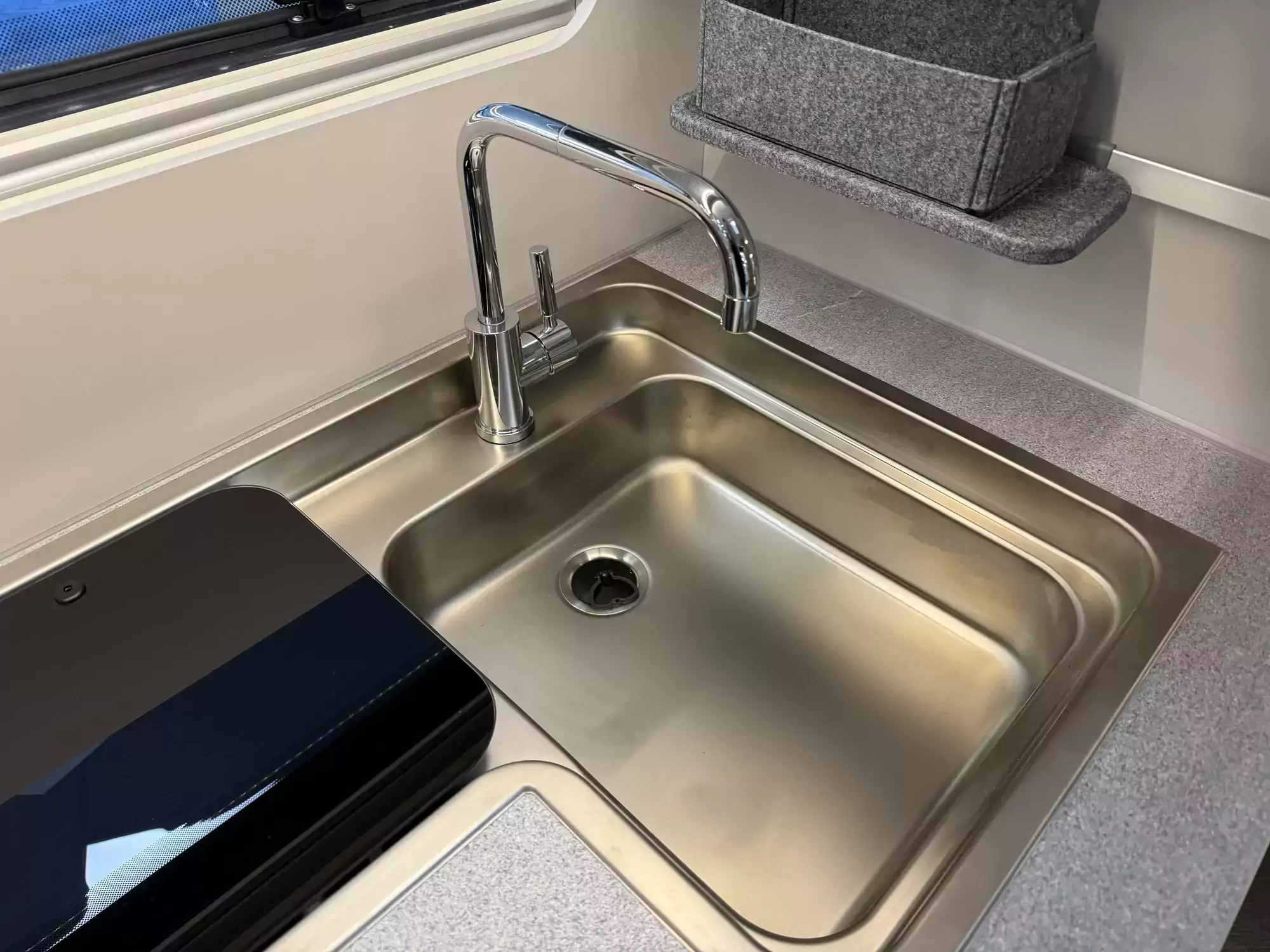 With Truma adjustable heating throughout and a Bluetooth sound system, you can kick back and relax in the comfortable living space, where the parallel benches easily convert to a generous sized double bed if needed or keep as your lounge area for relaxing and dining using the conveniently tucked away freestanding table.