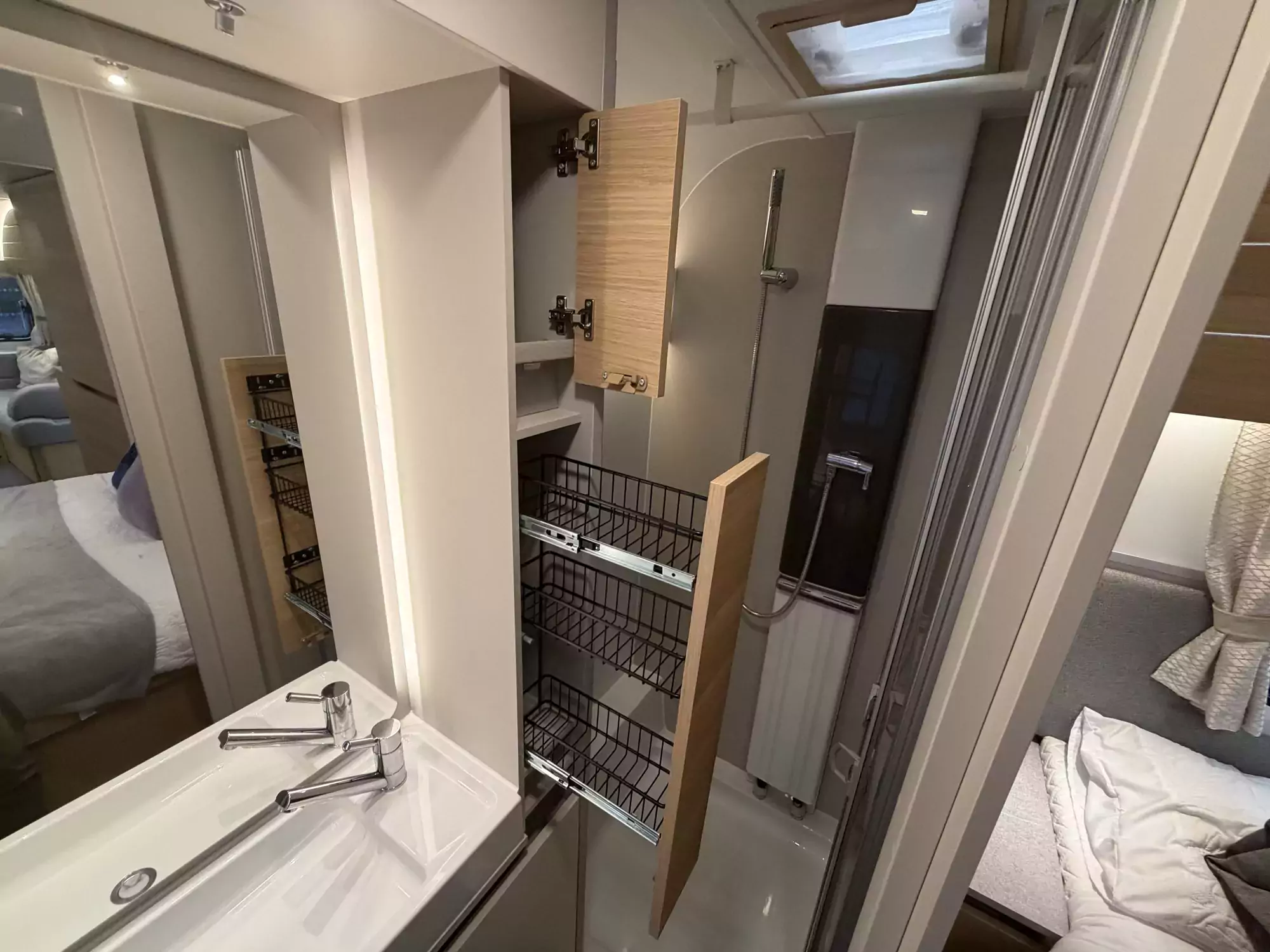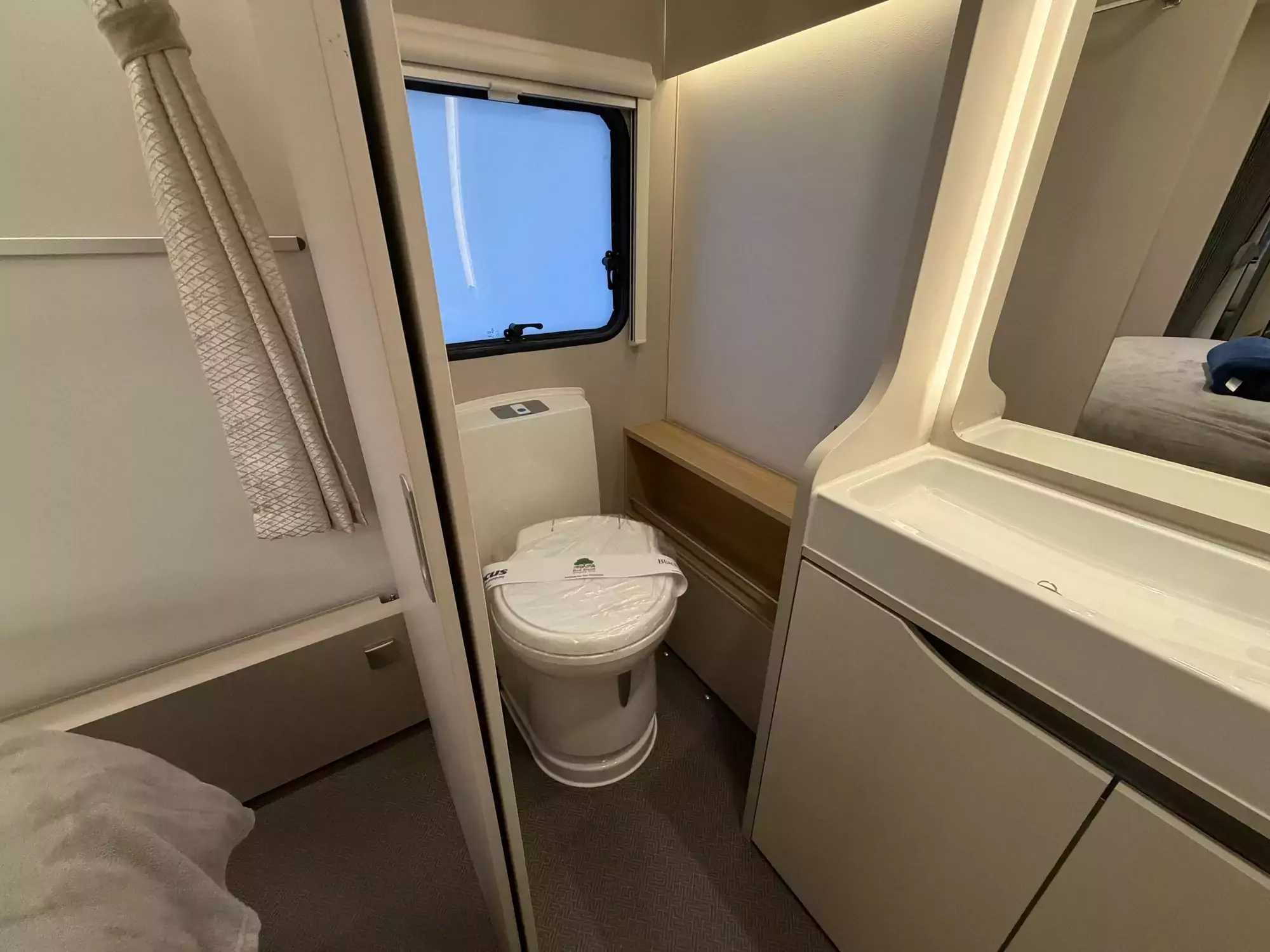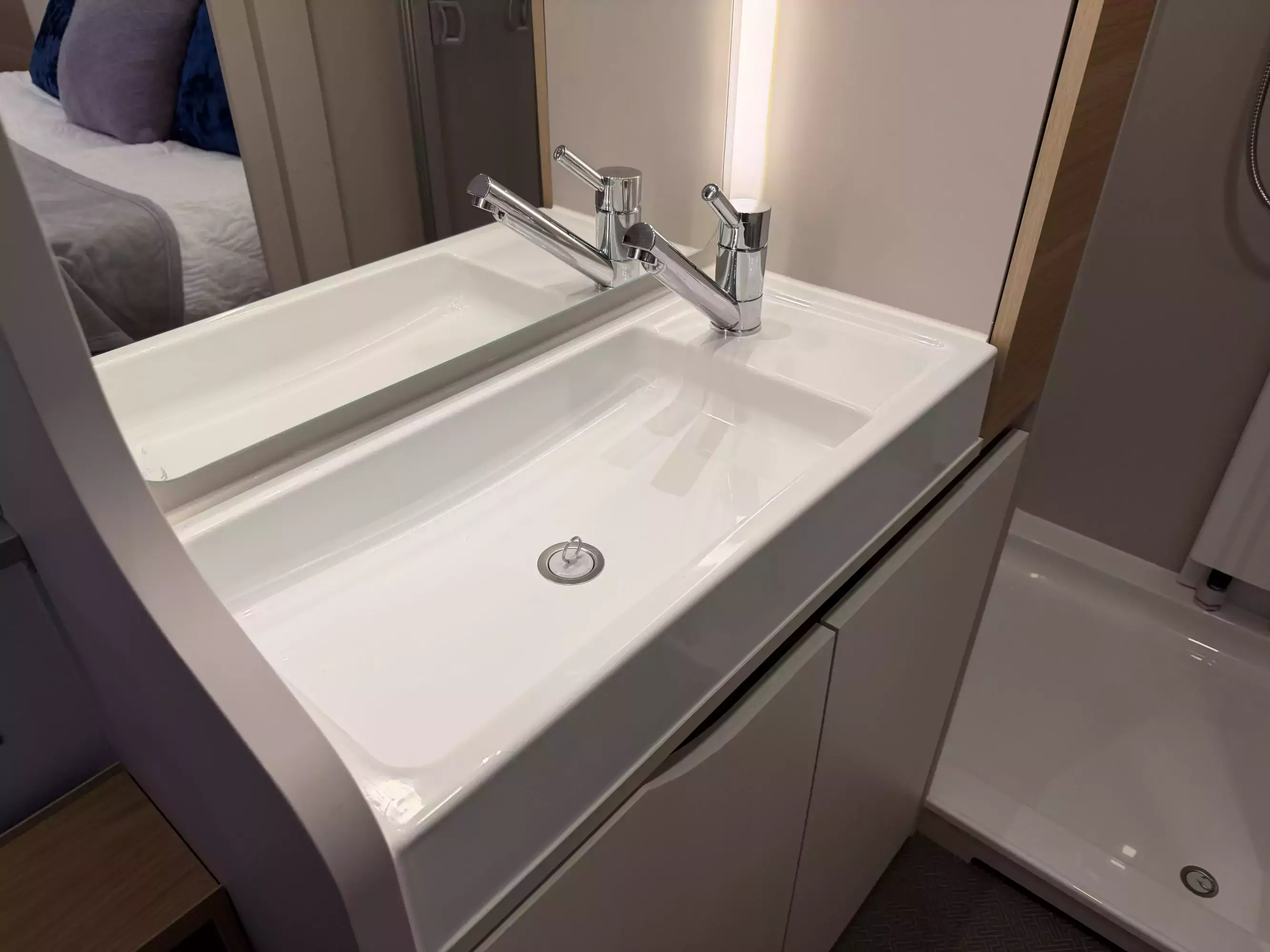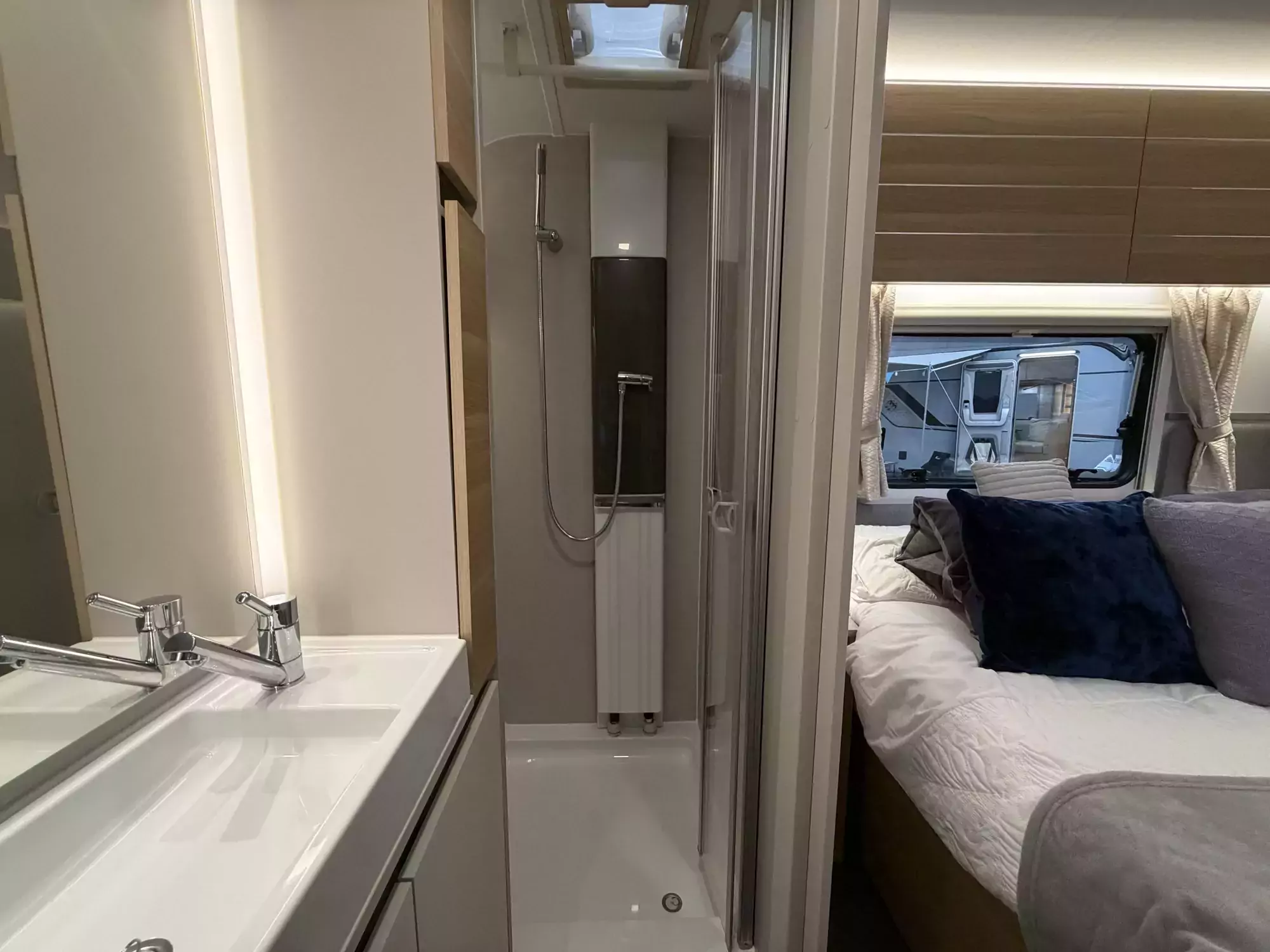For comfort sleeping there is a transverse island bed that sit in front of a good size bathroom which houses a cassette toilet, sink with vanity and separate shower cubicle.