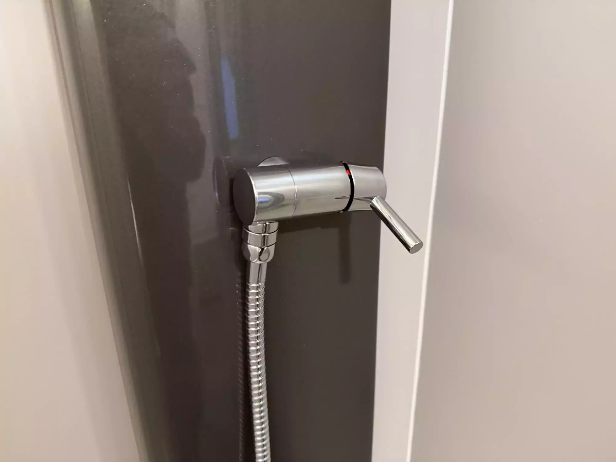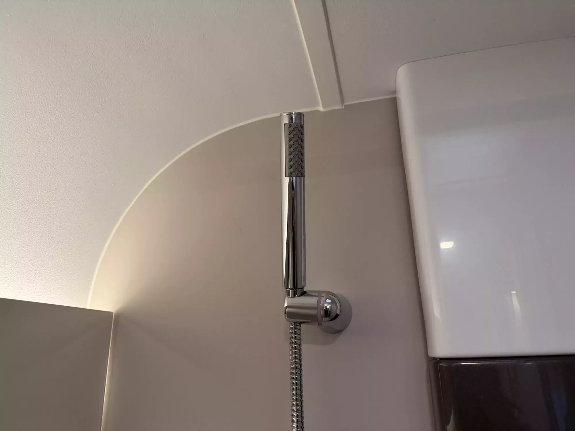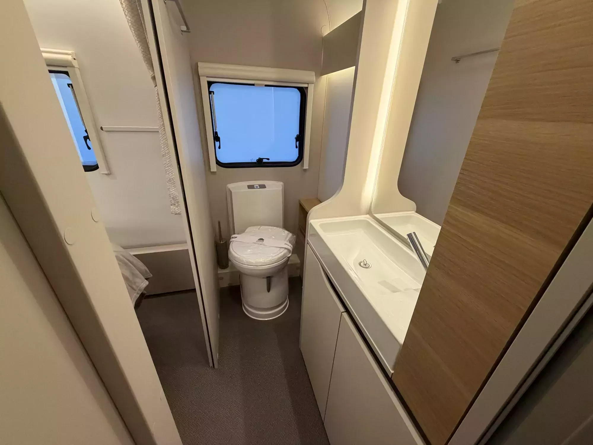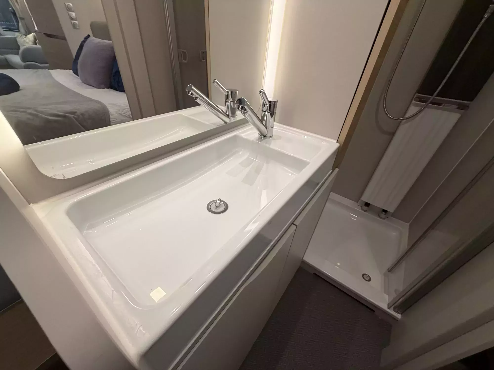 For comfort sleeping there is a transverse island bed that sit in front of a good size bathroom which houses a cassette toilet, sink with vanity and separate shower cubicle.