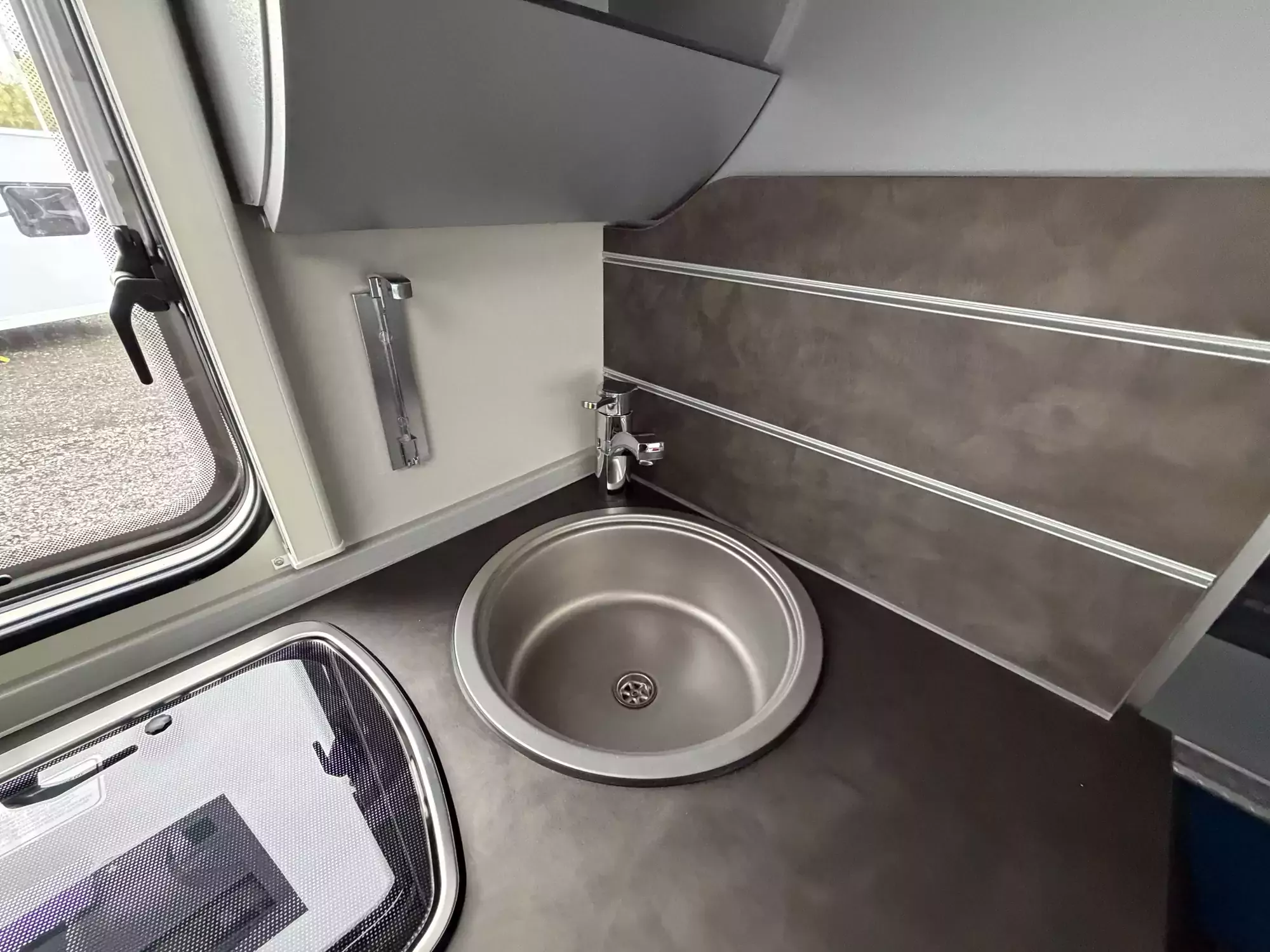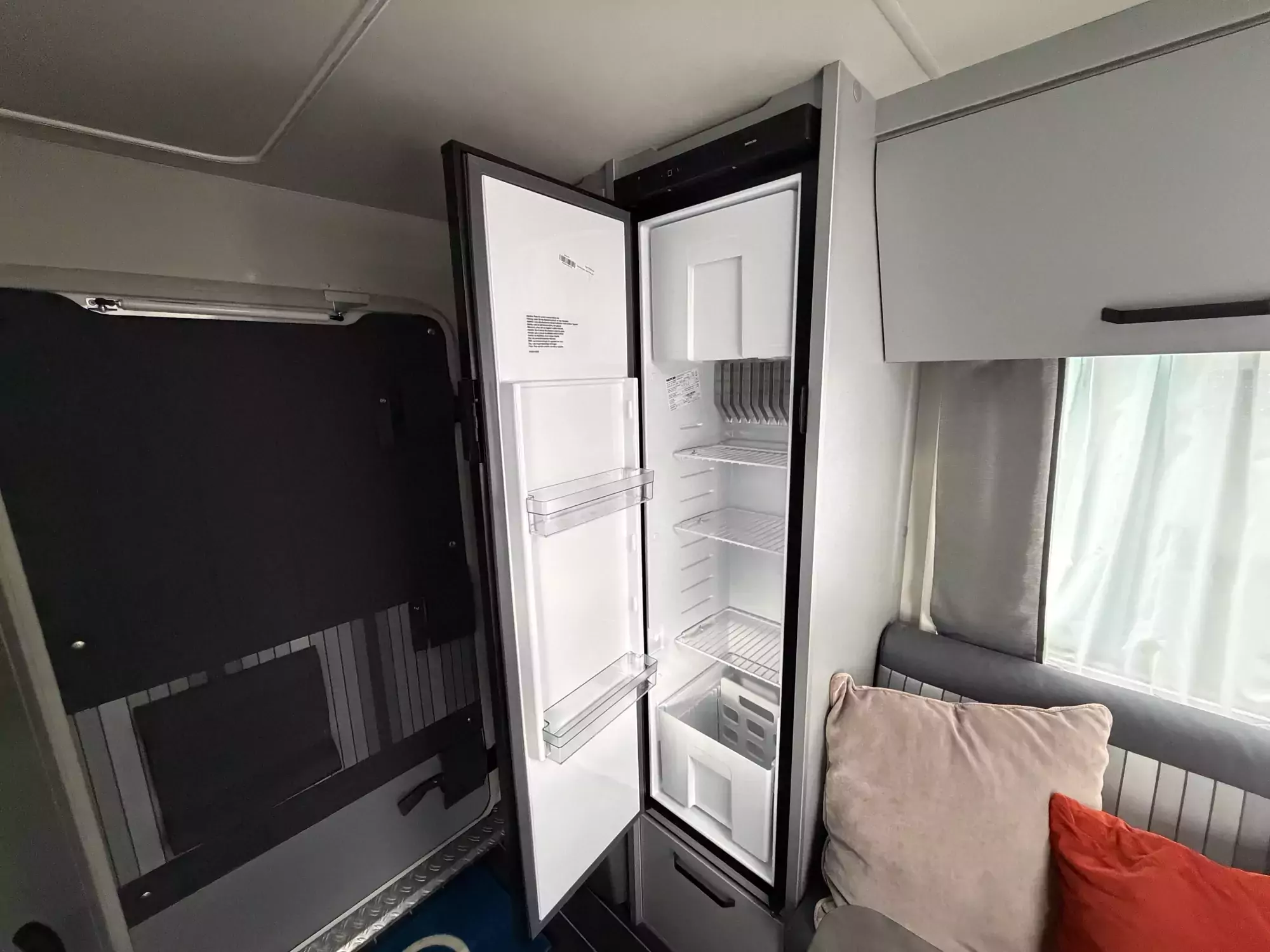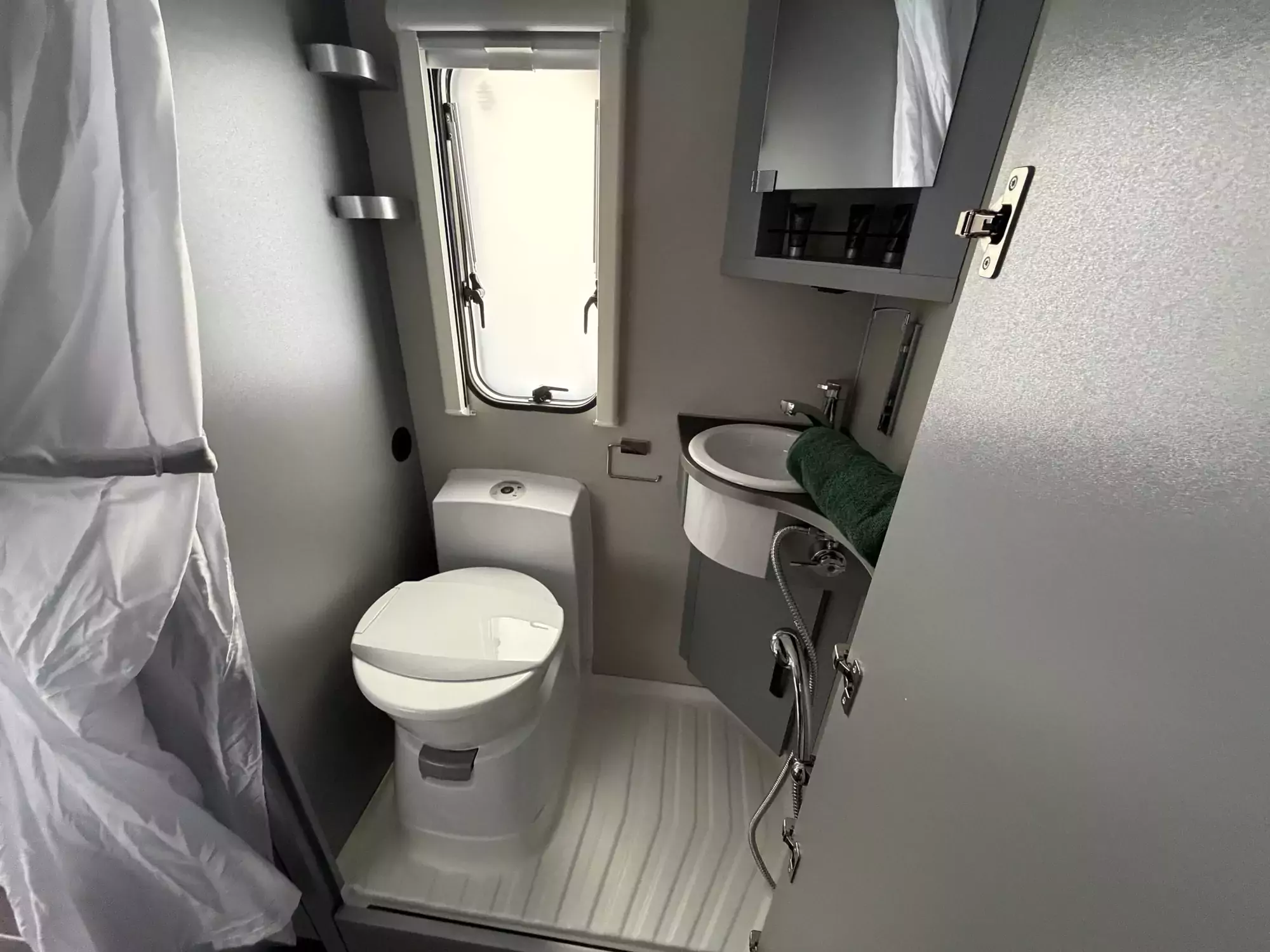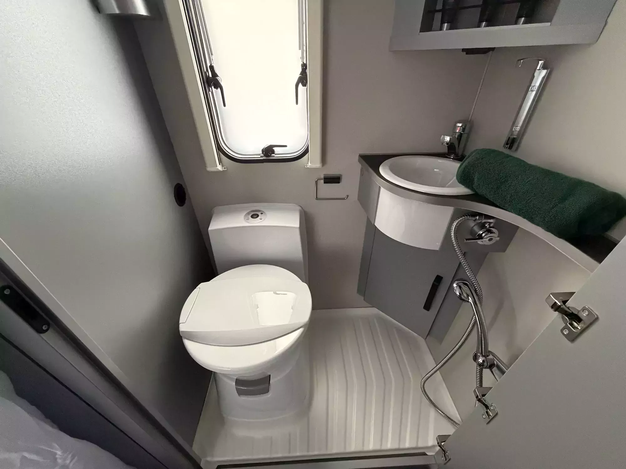 The well-equipped kitchenette includes a gas hob, sink, and refrigerator, ensuring everything you need is on hand for life on the road. The compact washroom provides a cassette toilet, wash basin, and shower, offering all the essentials for off-grid comfort.