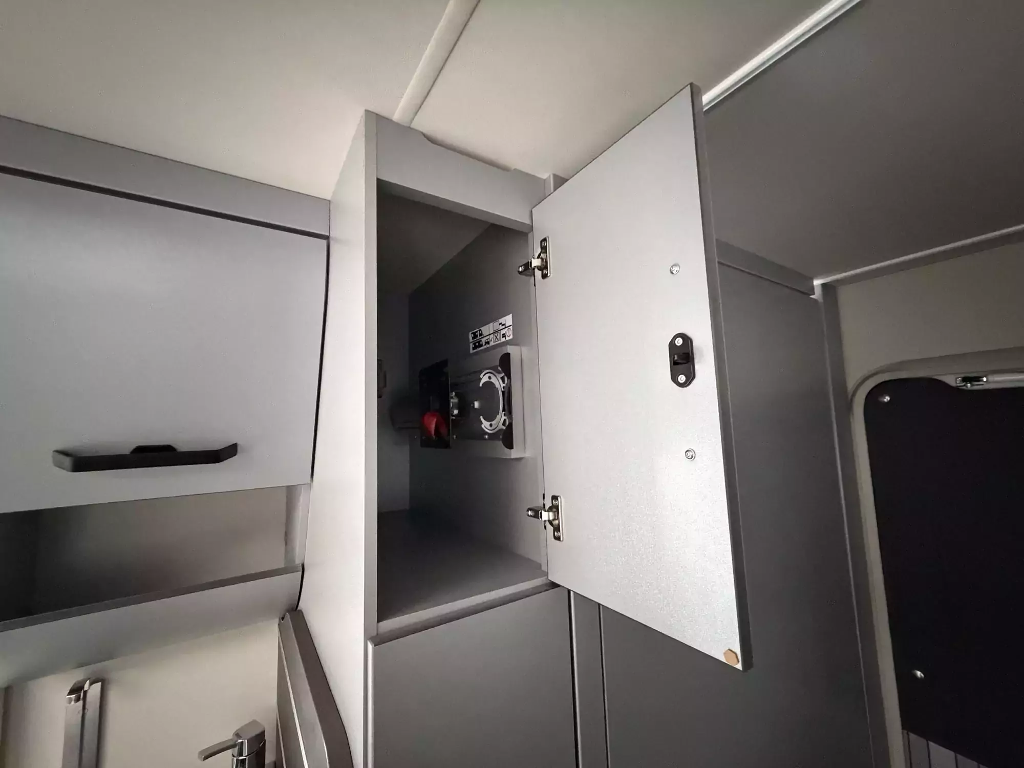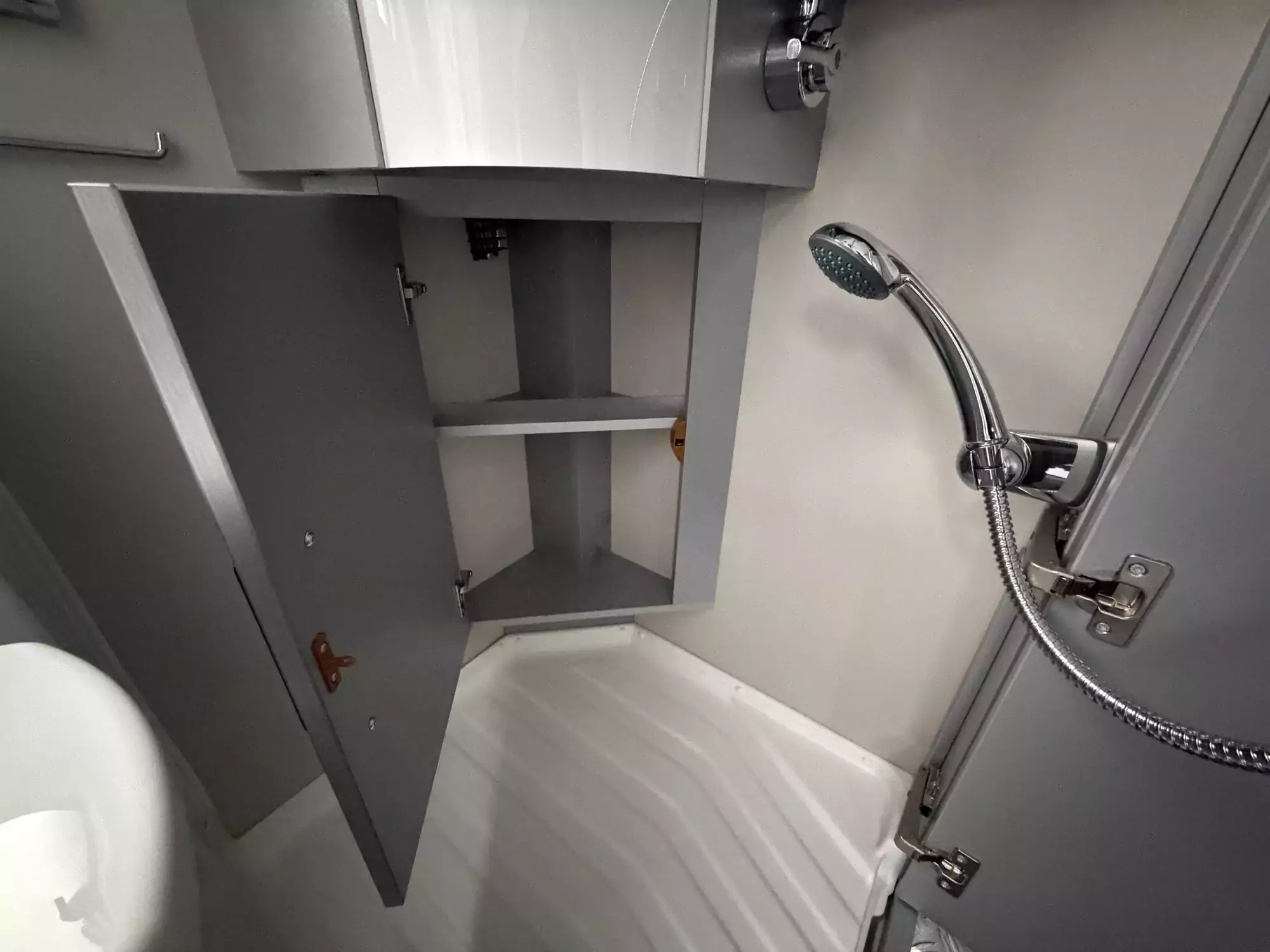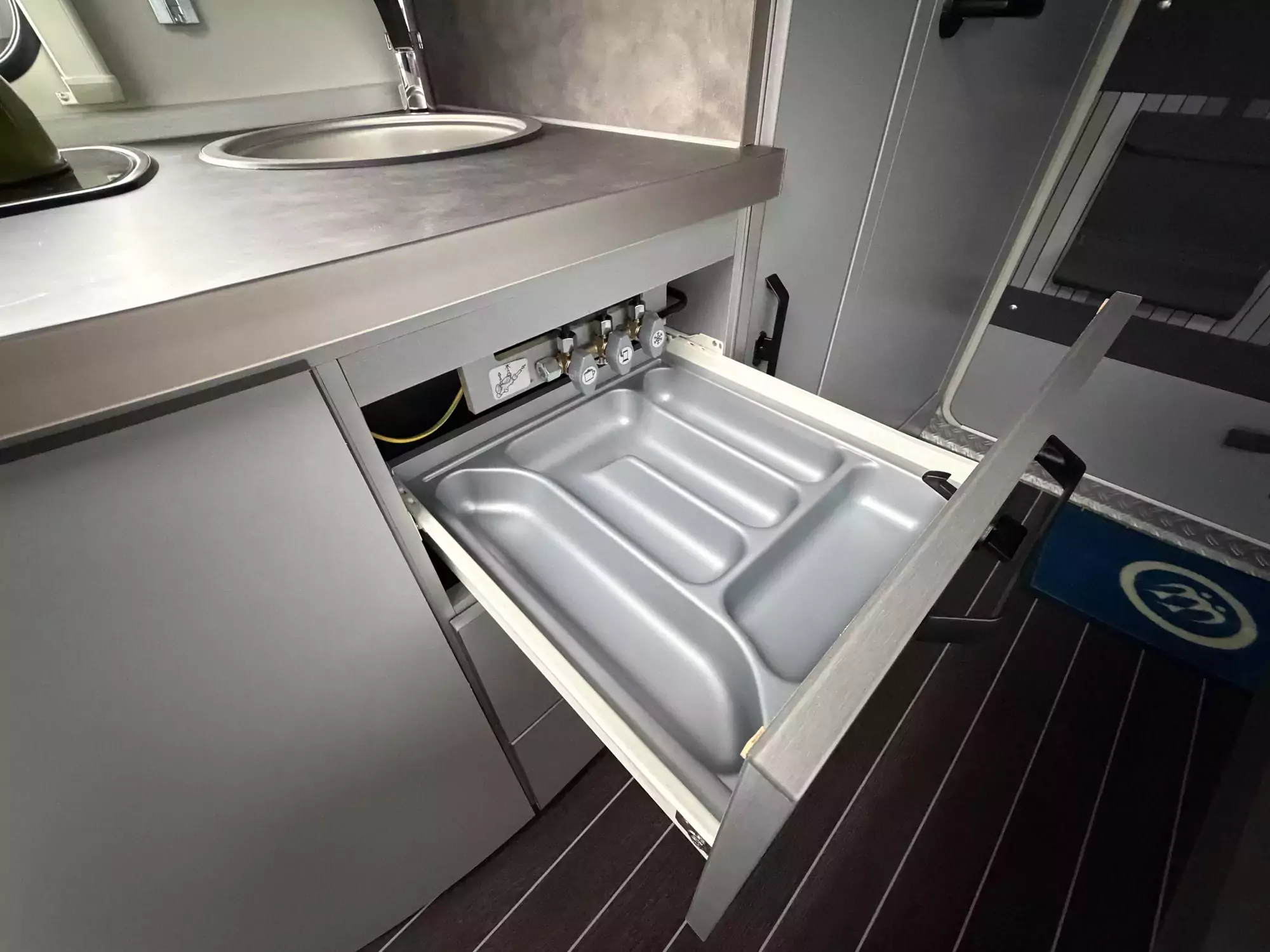The well-equipped kitchenette includes a gas hob, sink, and refrigerator, ensuring everything you need is on hand for life on the road. The compact washroom provides a cassette toilet, wash basin, and shower, offering all the essentials for off-grid comfort.