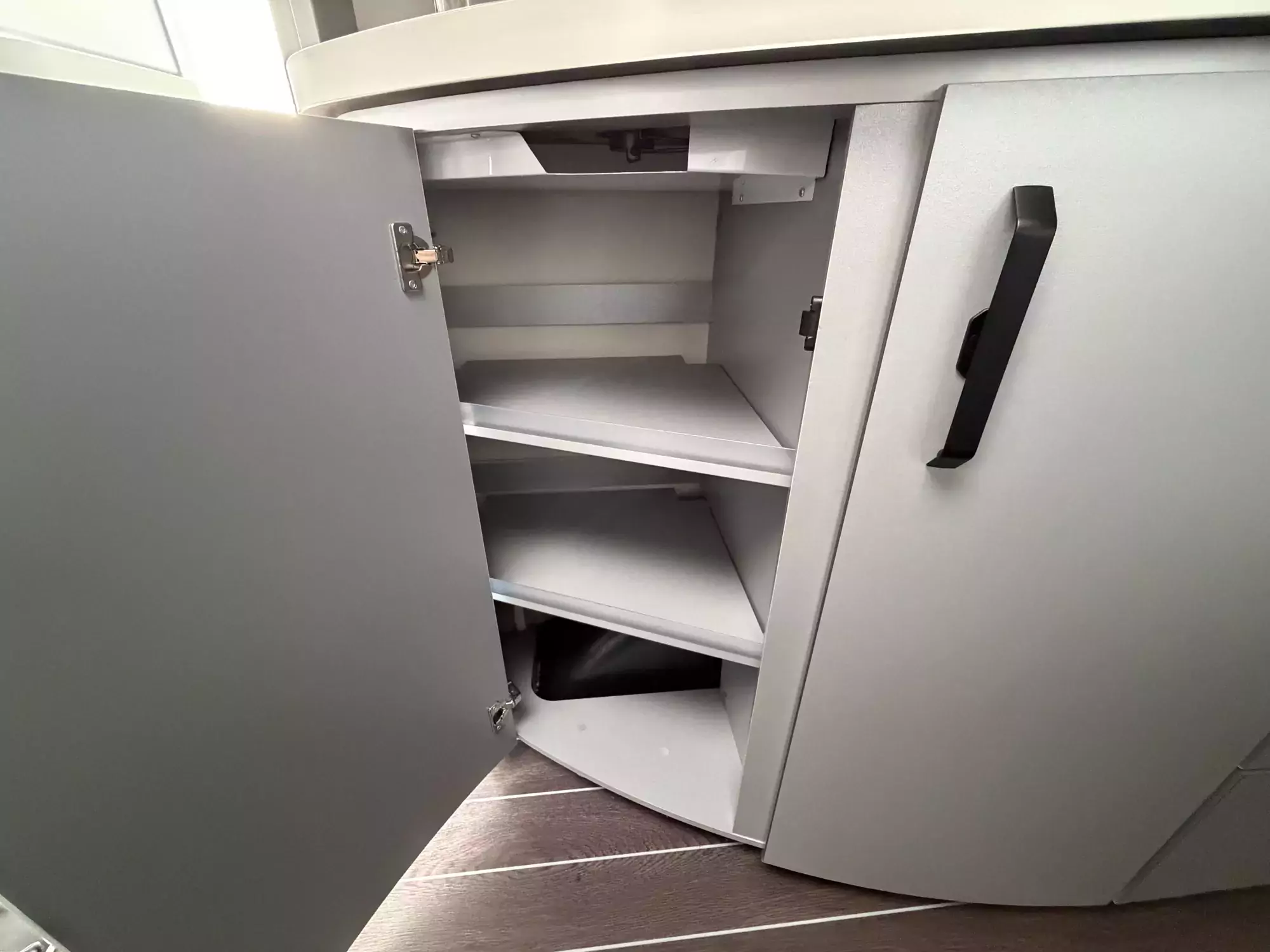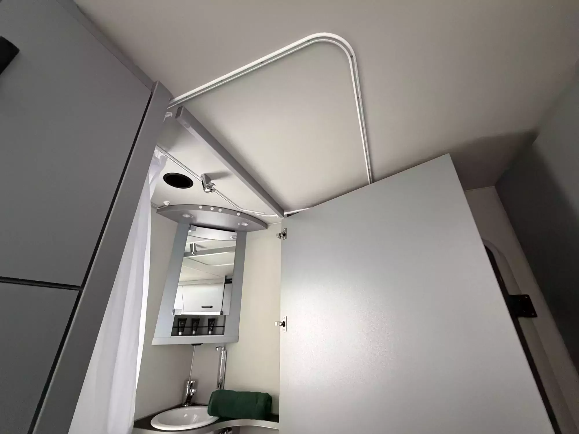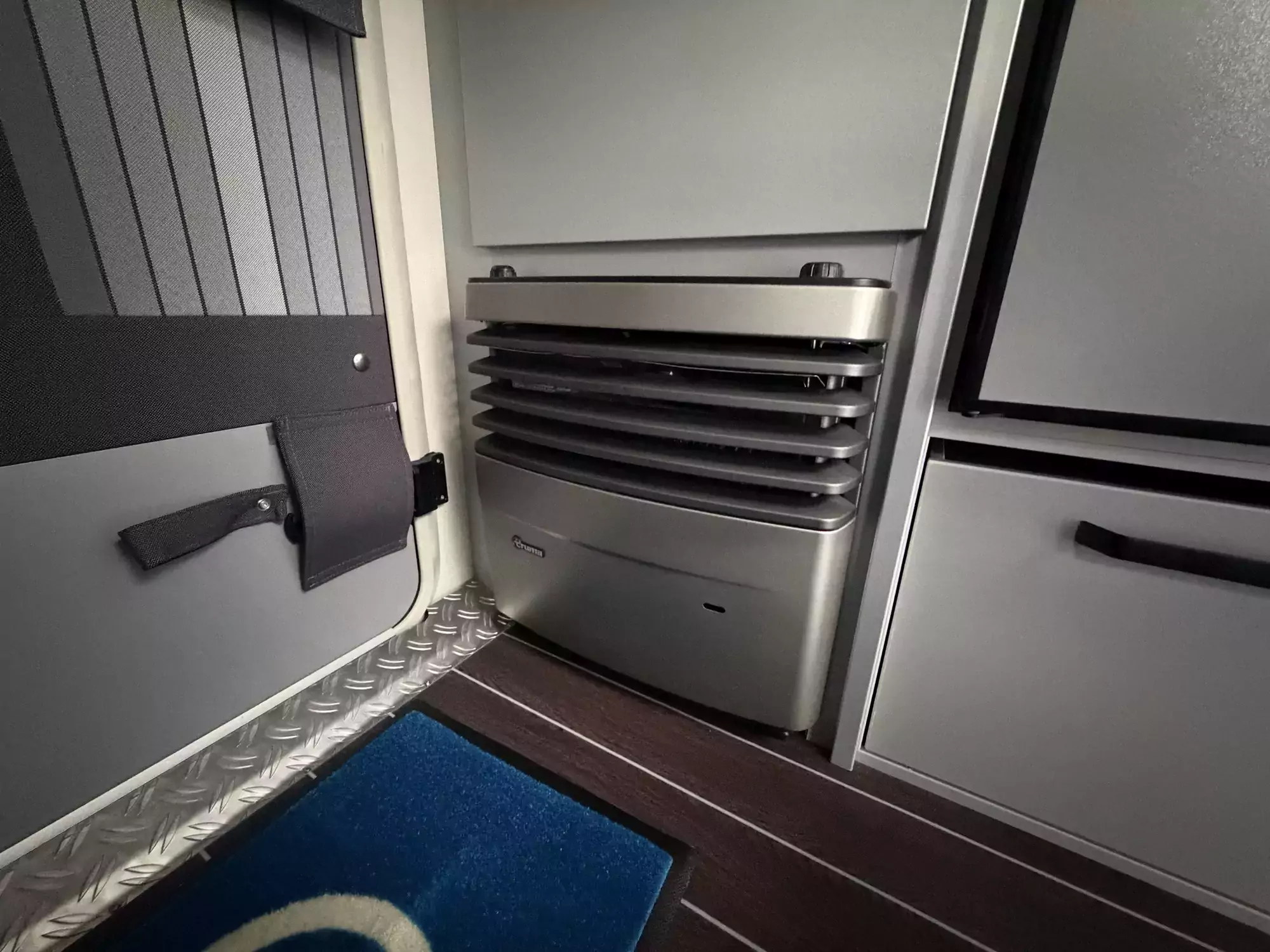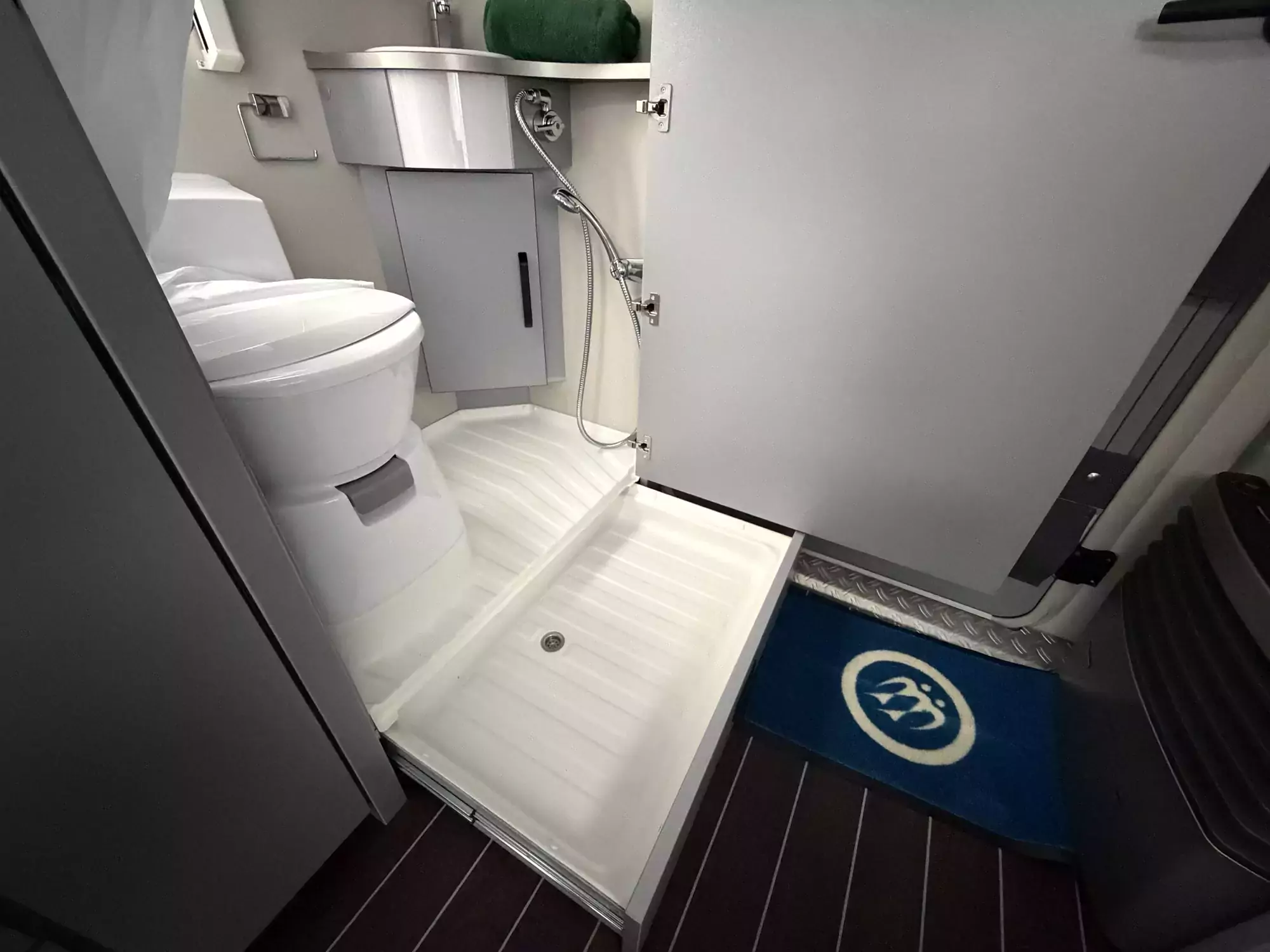 The well-equipped kitchenette includes a gas hob, sink, and refrigerator, ensuring everything you need is on hand for life on the road. The compact washroom provides a cassette toilet, wash basin, and shower, offering all the essentials for off-grid comfort.