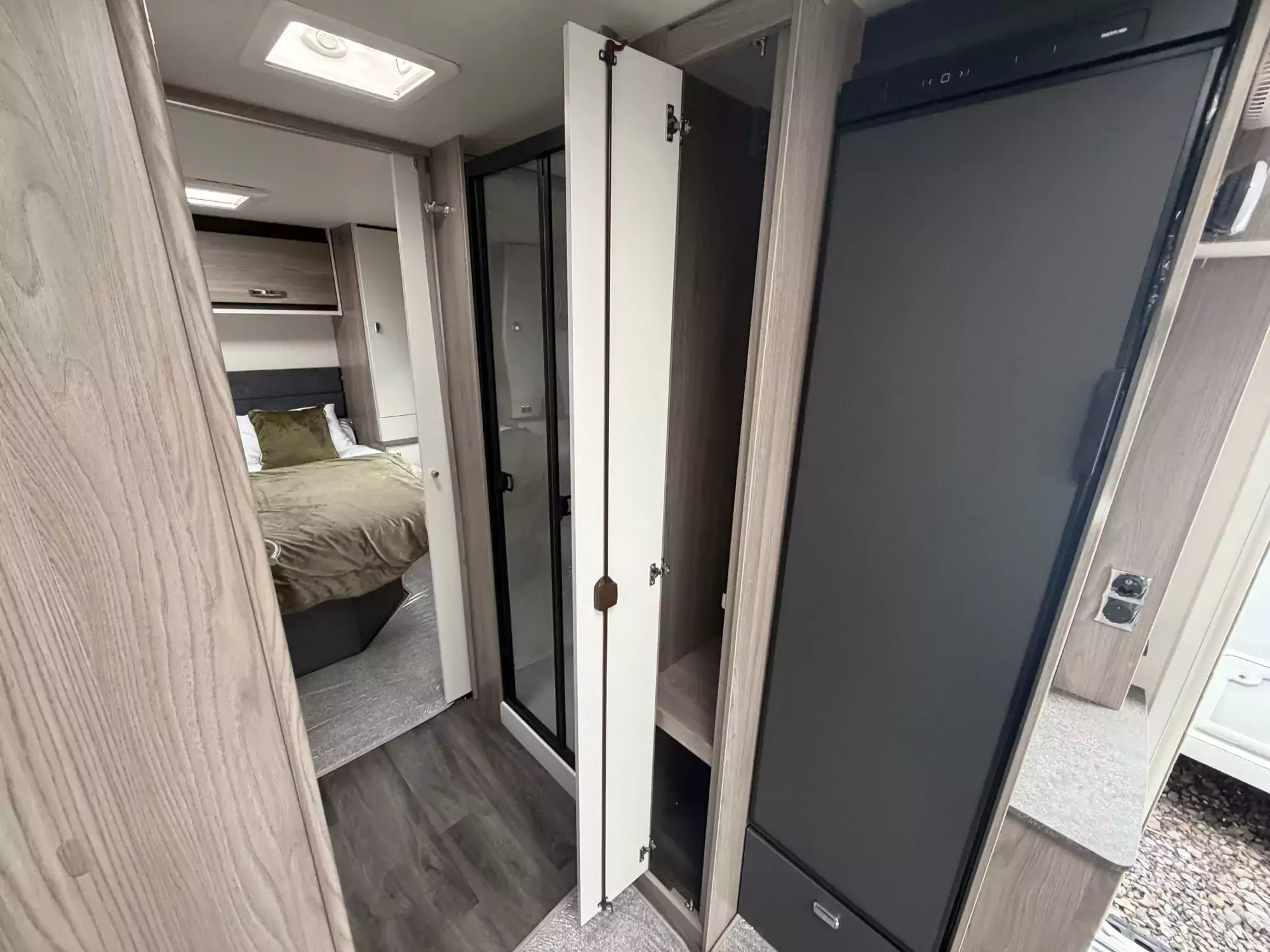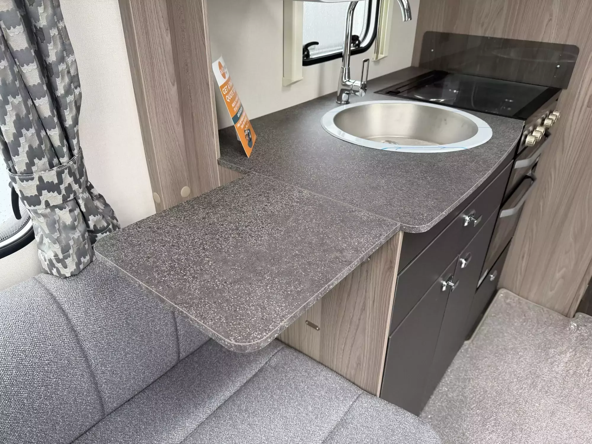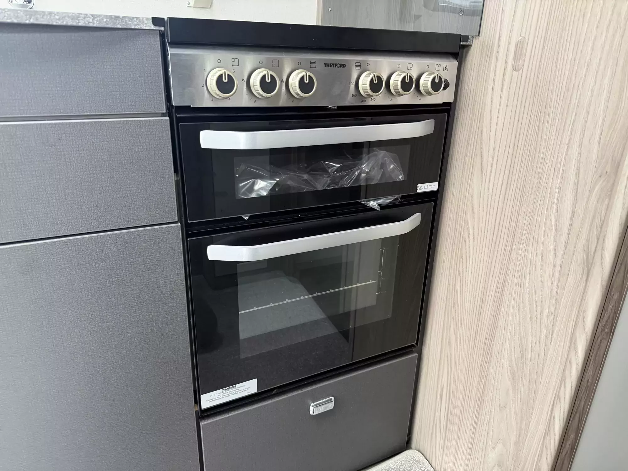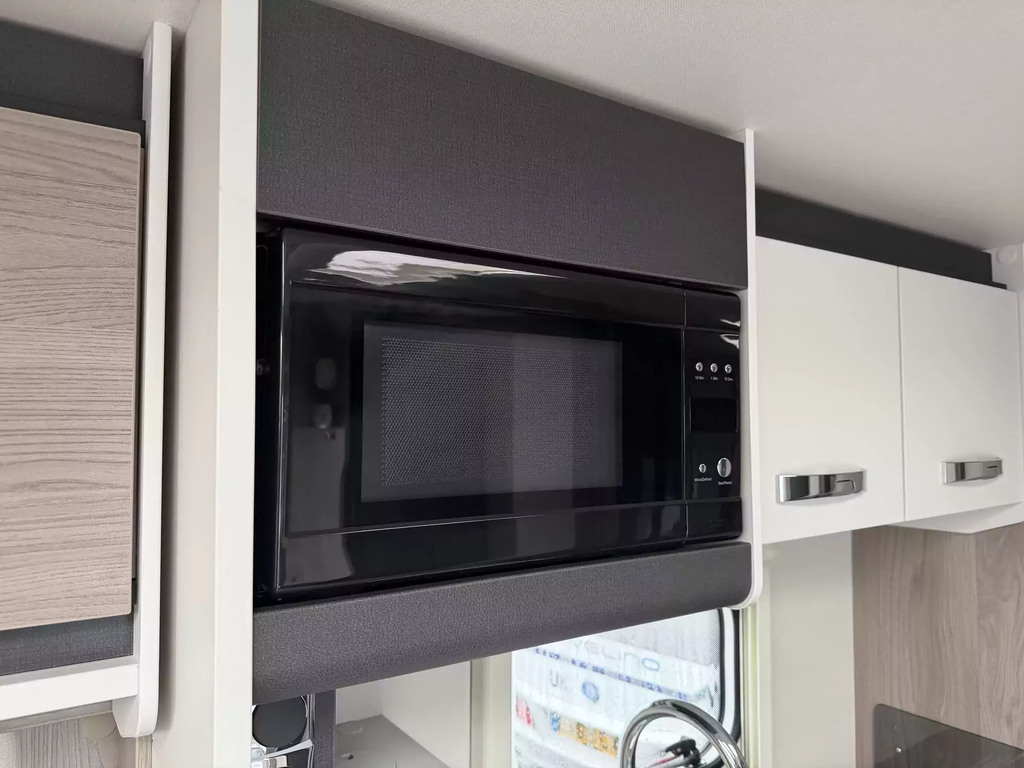 The well-appointed kitchen includes a 4-burner hob, oven and grill, microwave, stainless steel sink, and large fridge freezer, making it easy to cook proper meals on the move. Quality worktops, soft-close cabinetry, and smart LED lighting add a premium finish throughout.