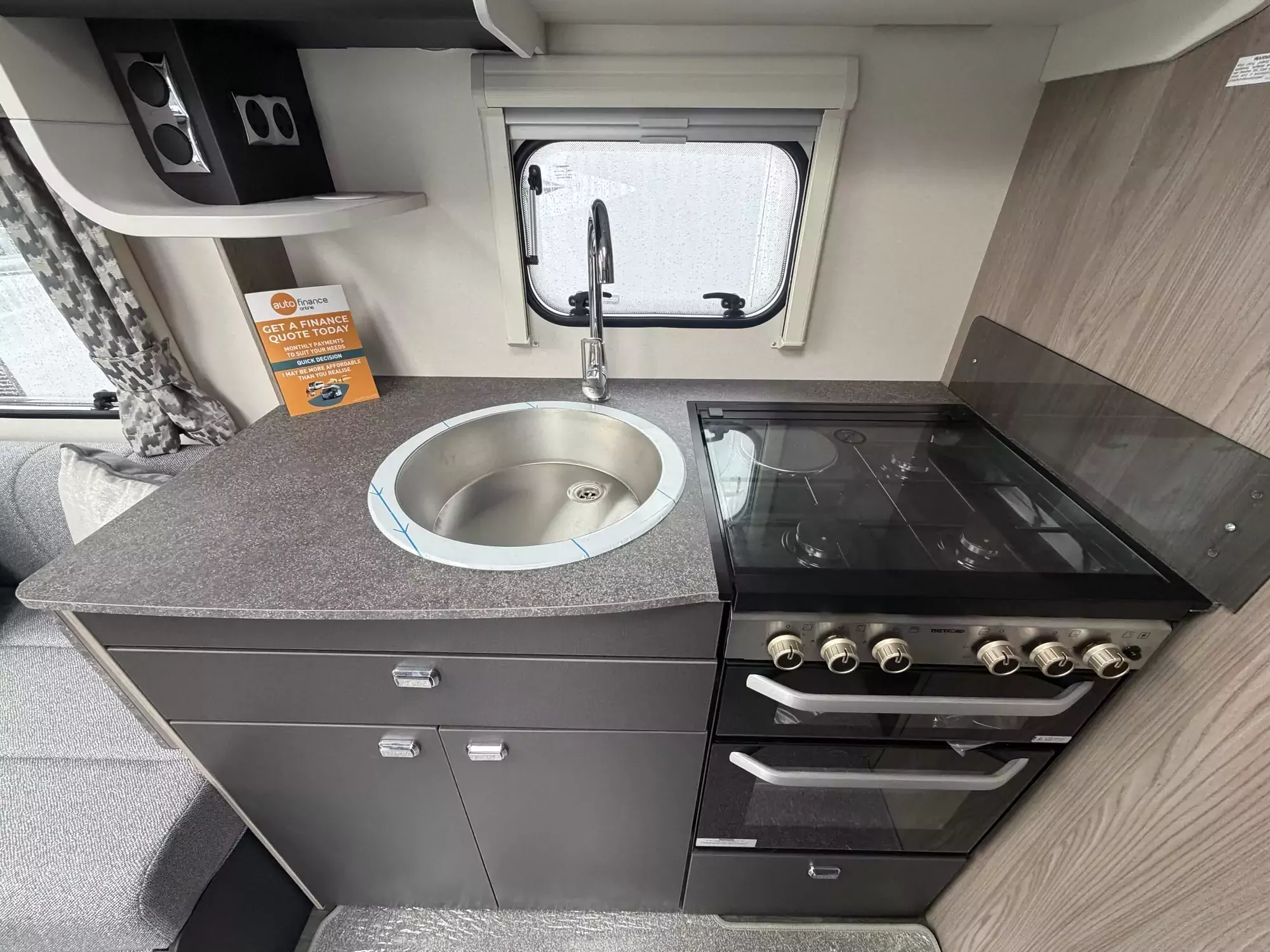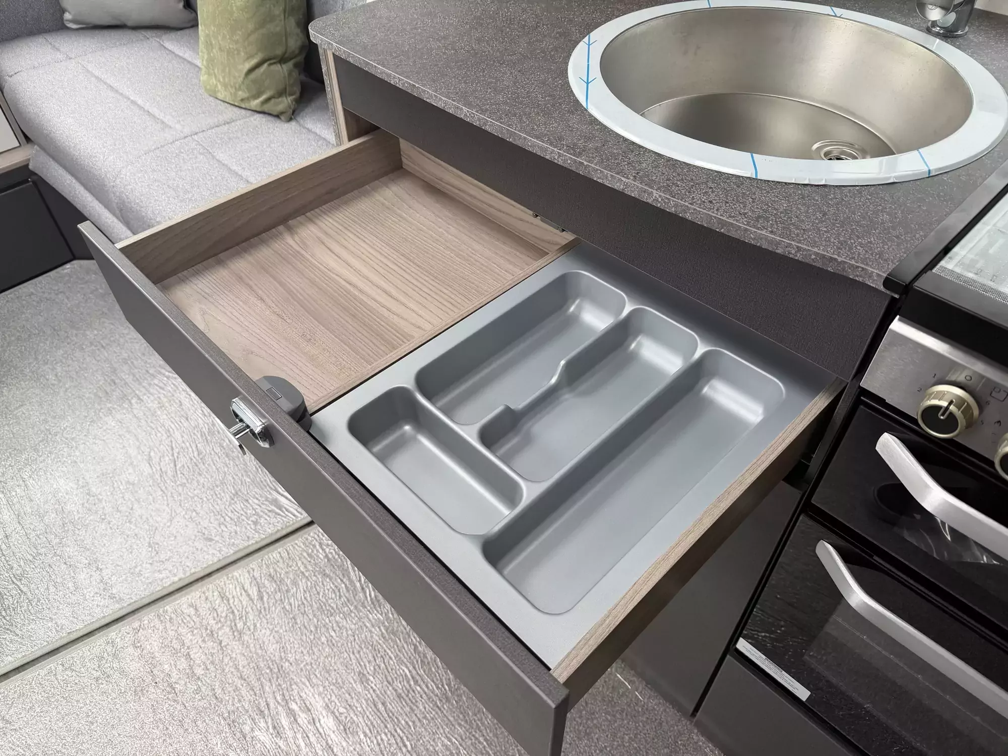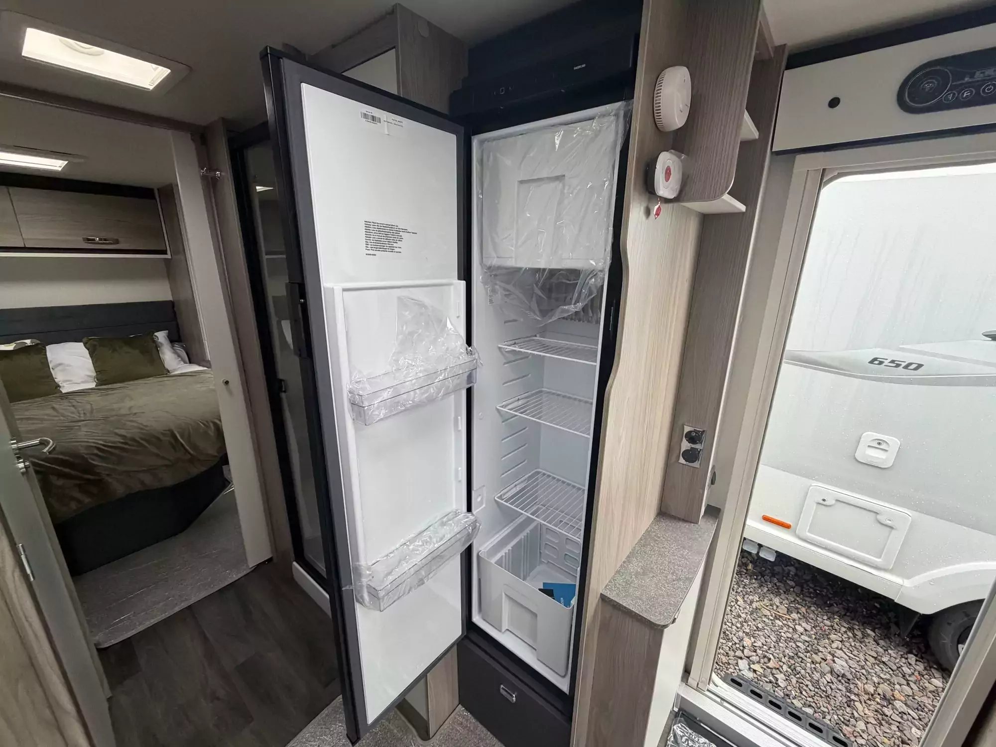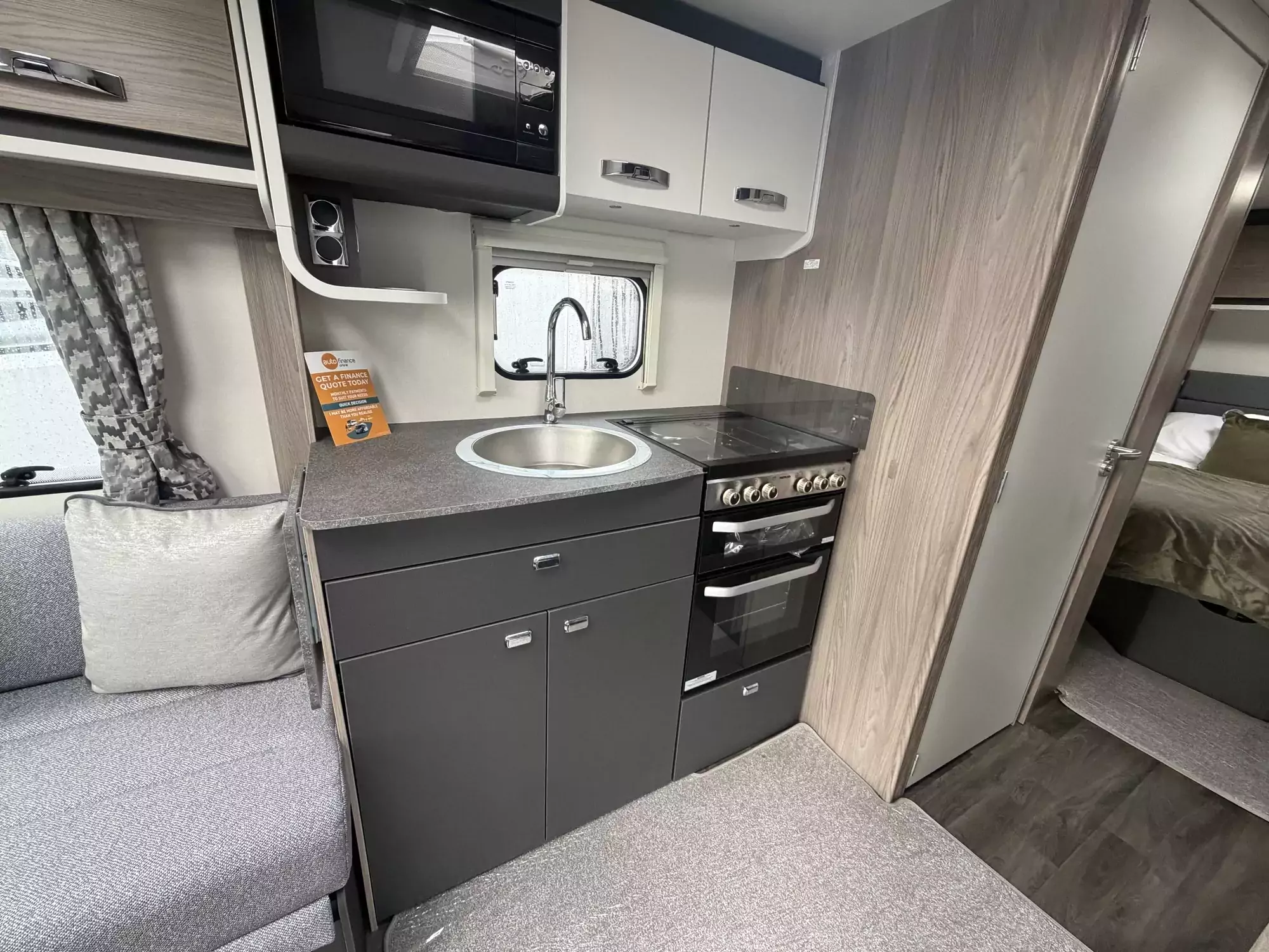 The well-appointed kitchen includes a 4-burner hob, oven and grill, microwave, stainless steel sink, and large fridge freezer, making it easy to cook proper meals on the move. Quality worktops, soft-close cabinetry, and smart LED lighting add a premium finish throughout.