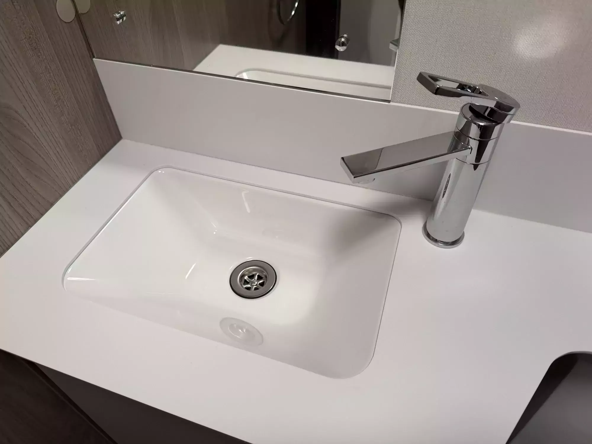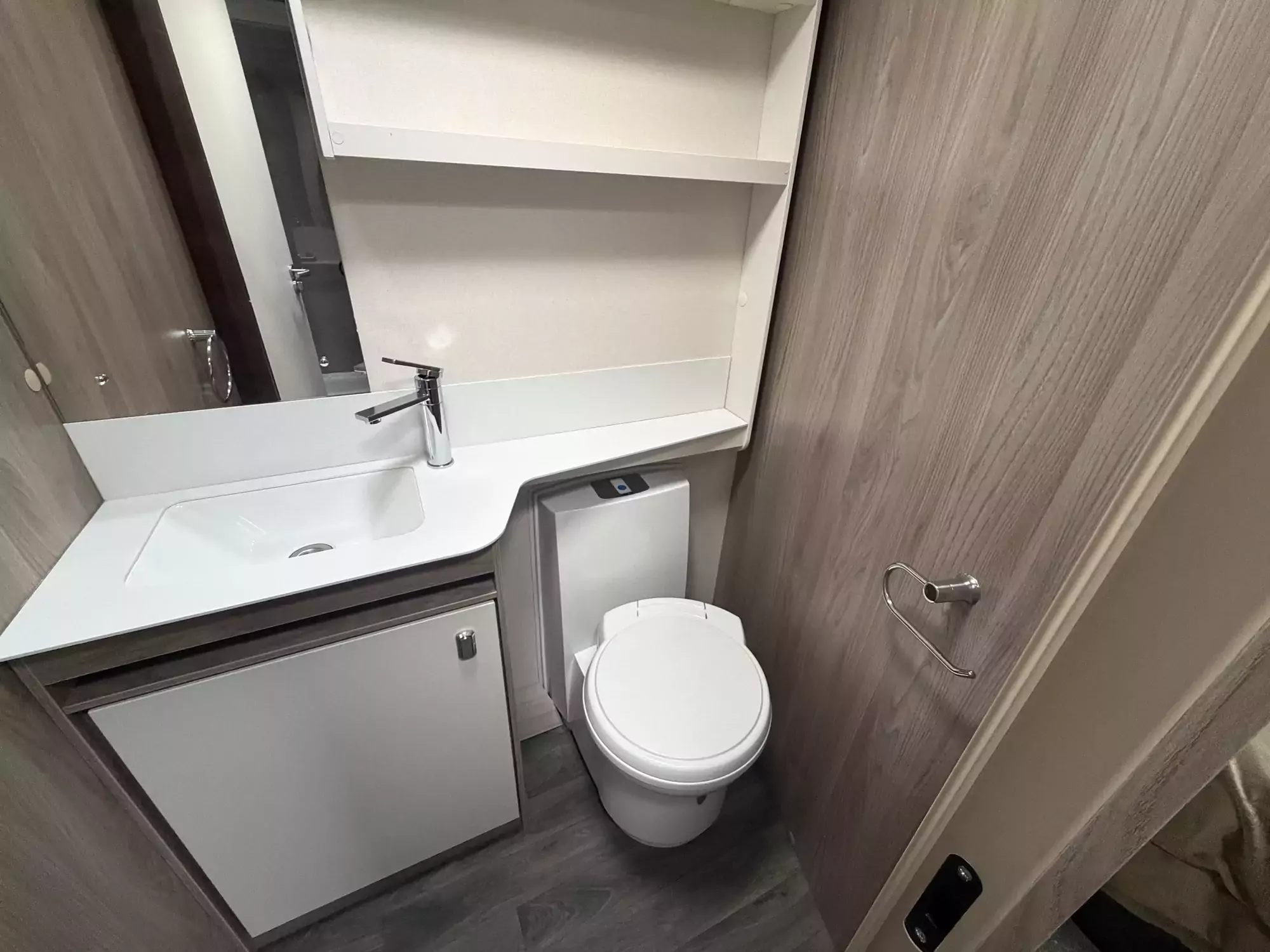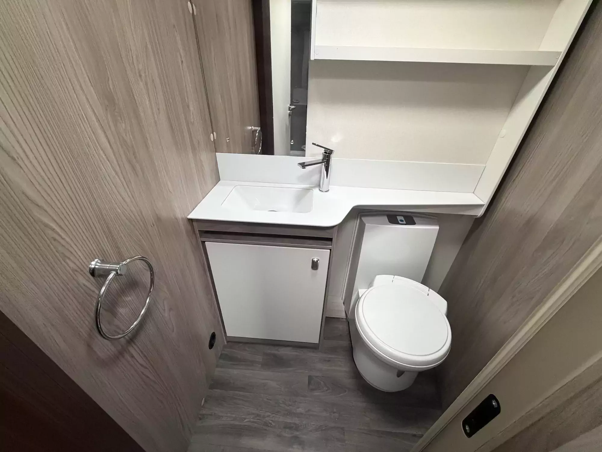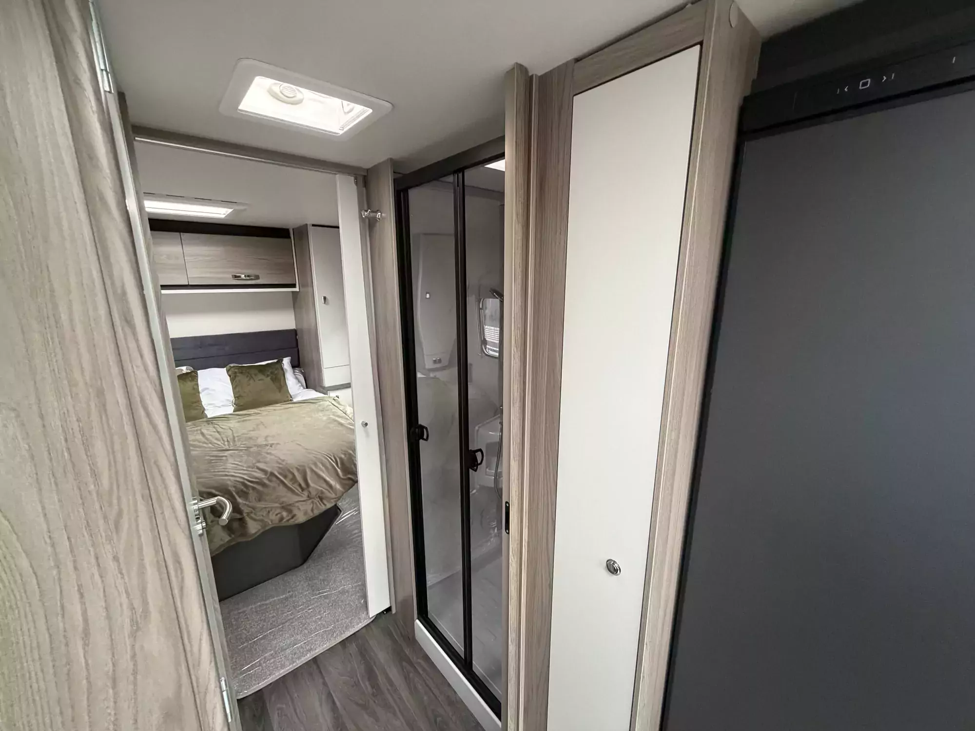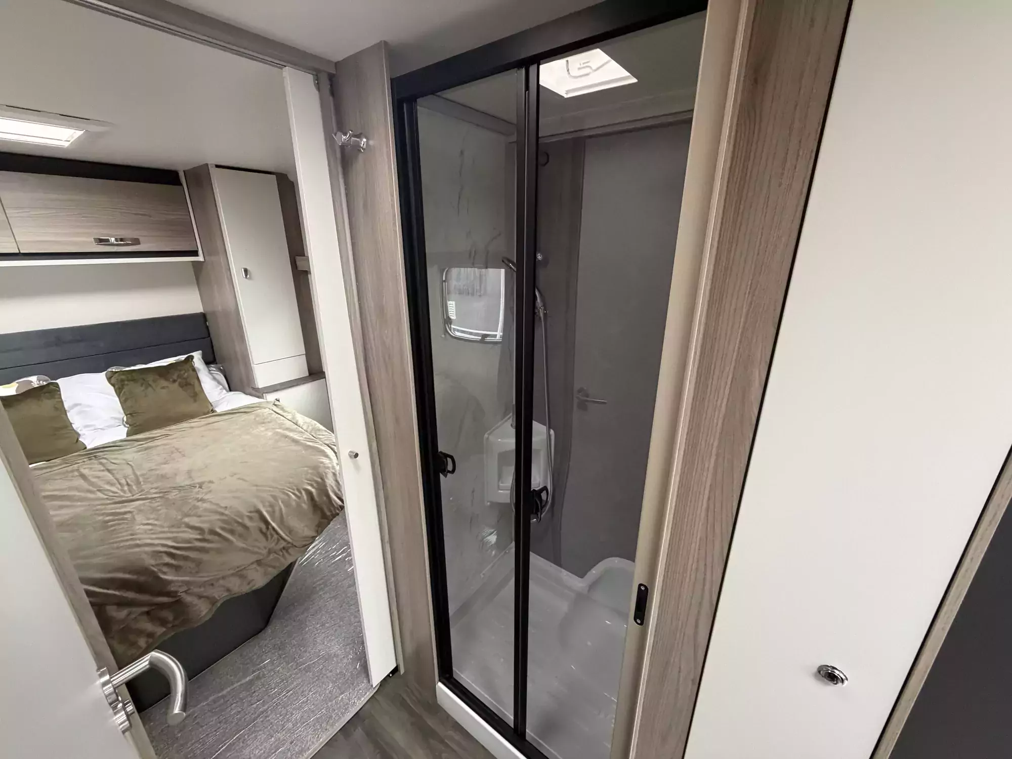 The central washroom provides a private en-suite feel, with a separate shower cubicle, modern vanity unit, and cassette toilet – perfectly positioned to serve both the bedroom and living areas.