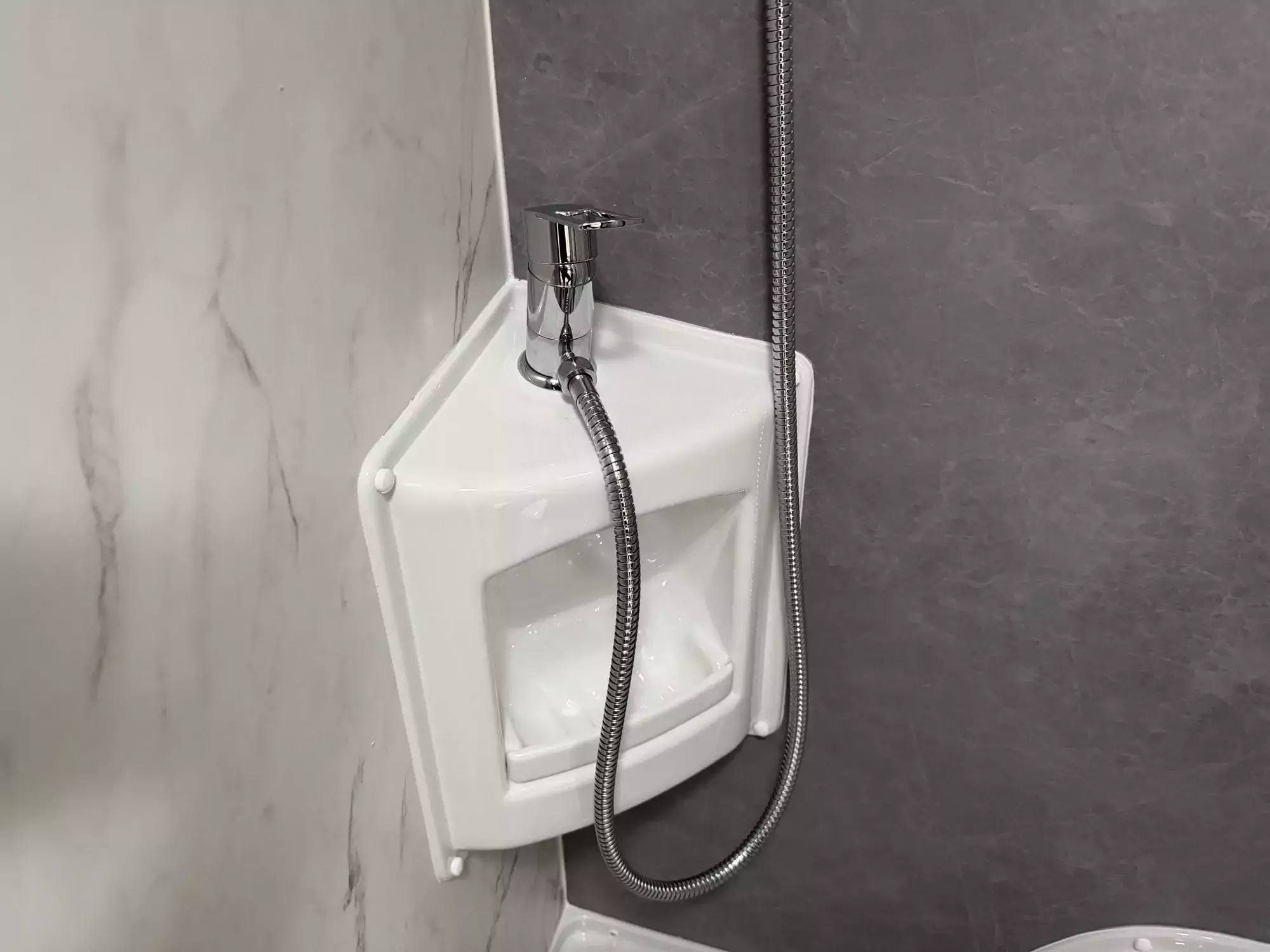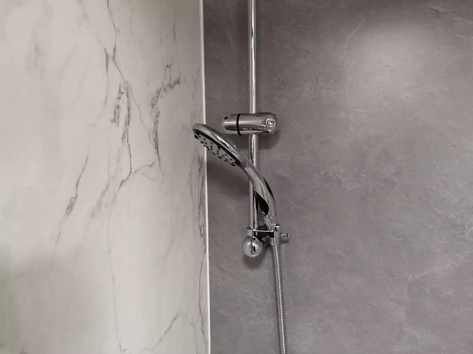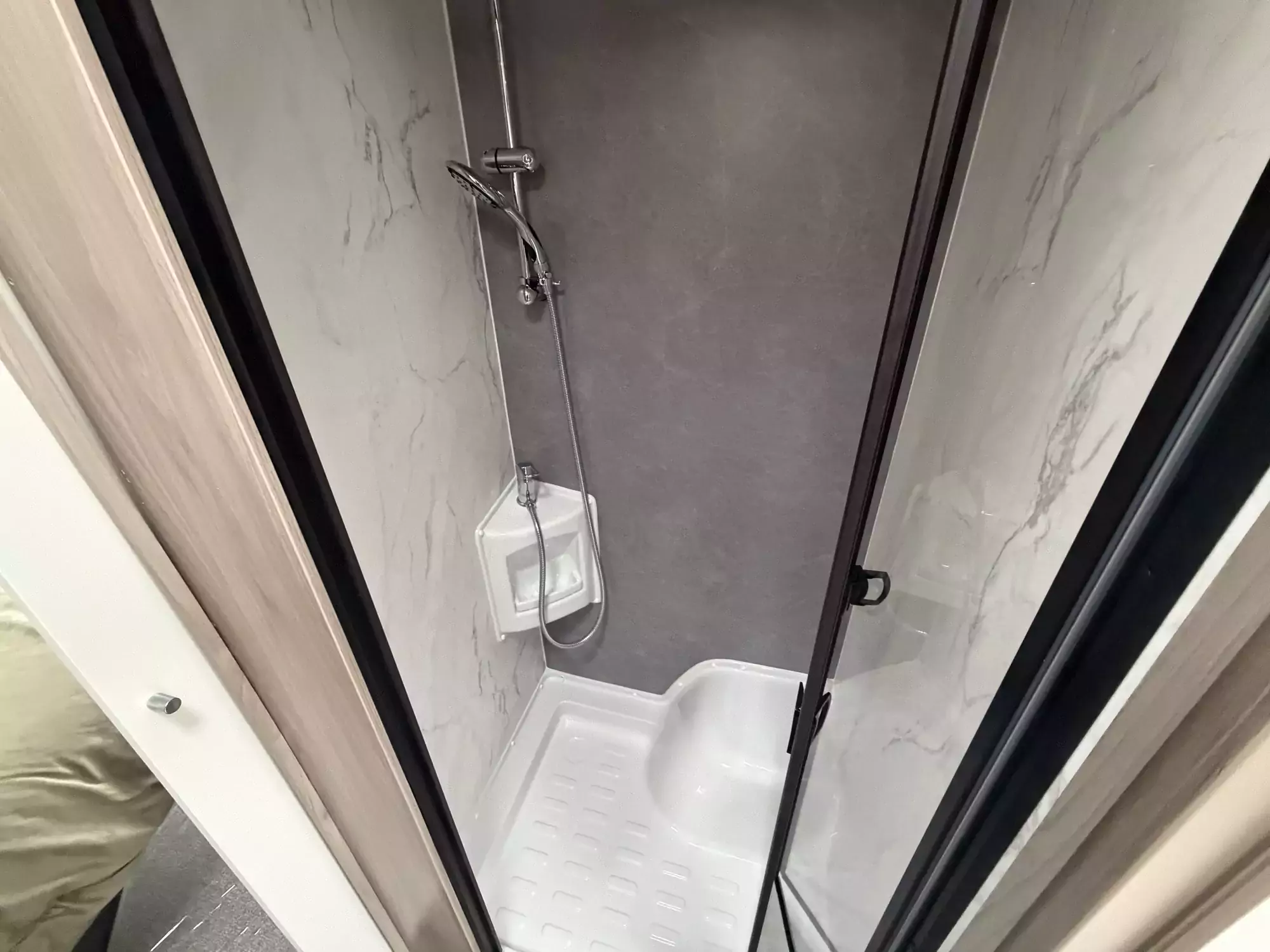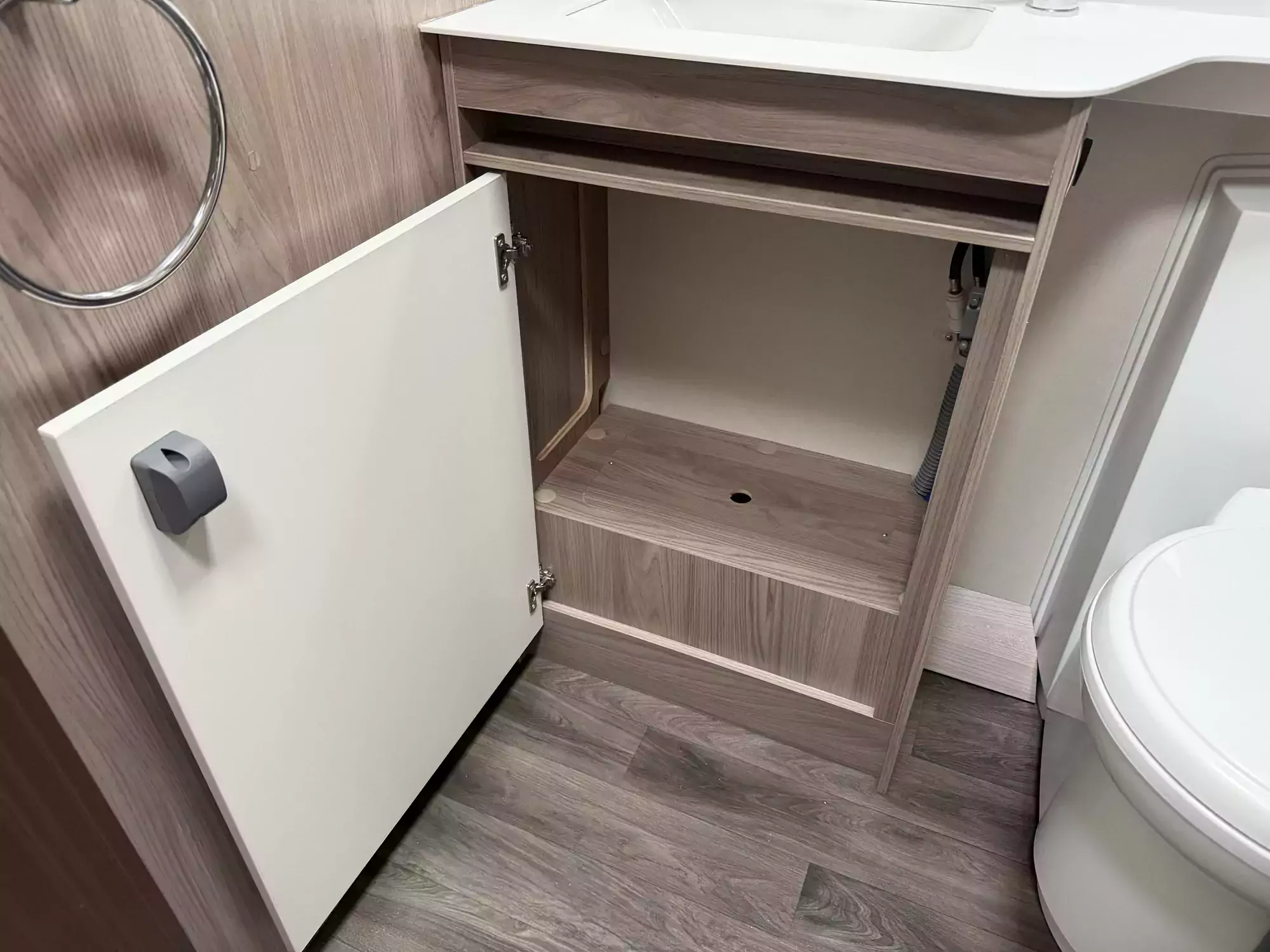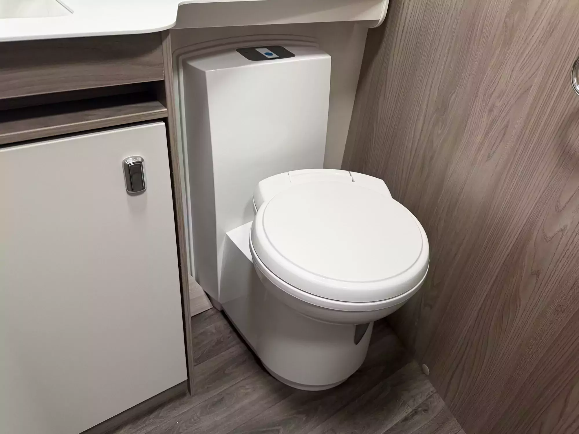 The central washroom provides a private en-suite feel, with a separate shower cubicle, modern vanity unit, and cassette toilet – perfectly positioned to serve both the bedroom and living areas.