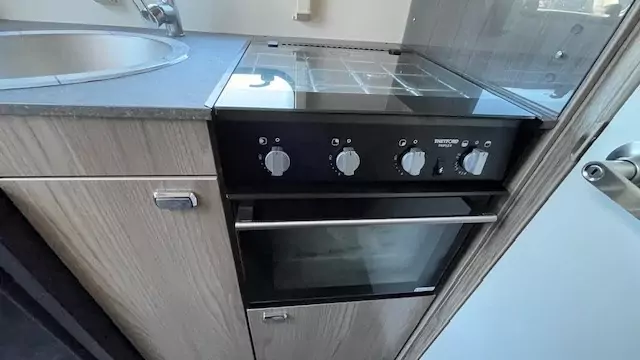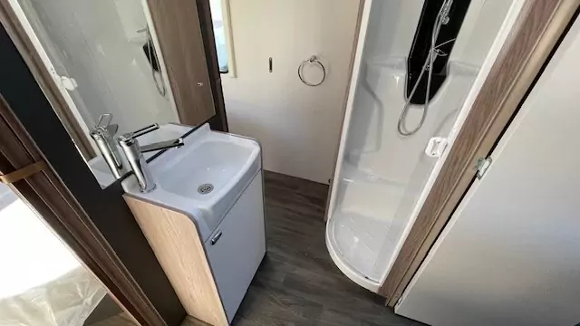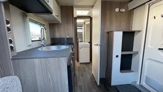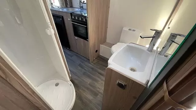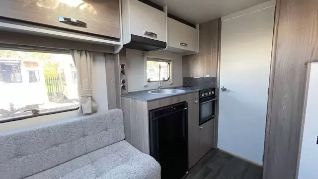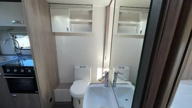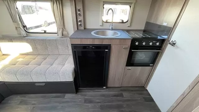 The well equipped kitchen comprises hob and oven, stainless steel sink with mixer and 98l under-counter fridge with freezer compartment, and the centre bathroom completes the offering with flushable cassette toilet, washbasin with vanity area and separate domestic style shower cubical.