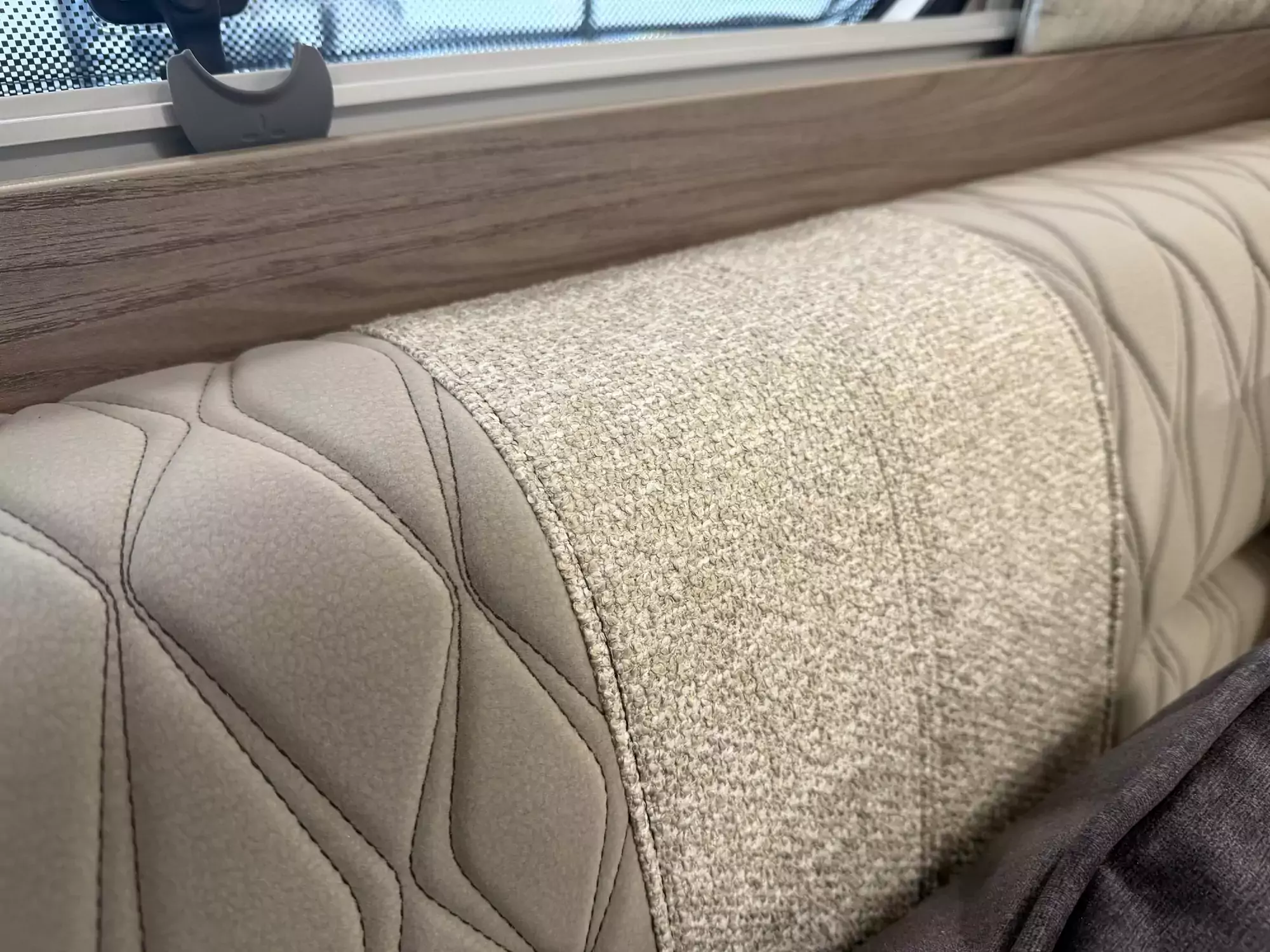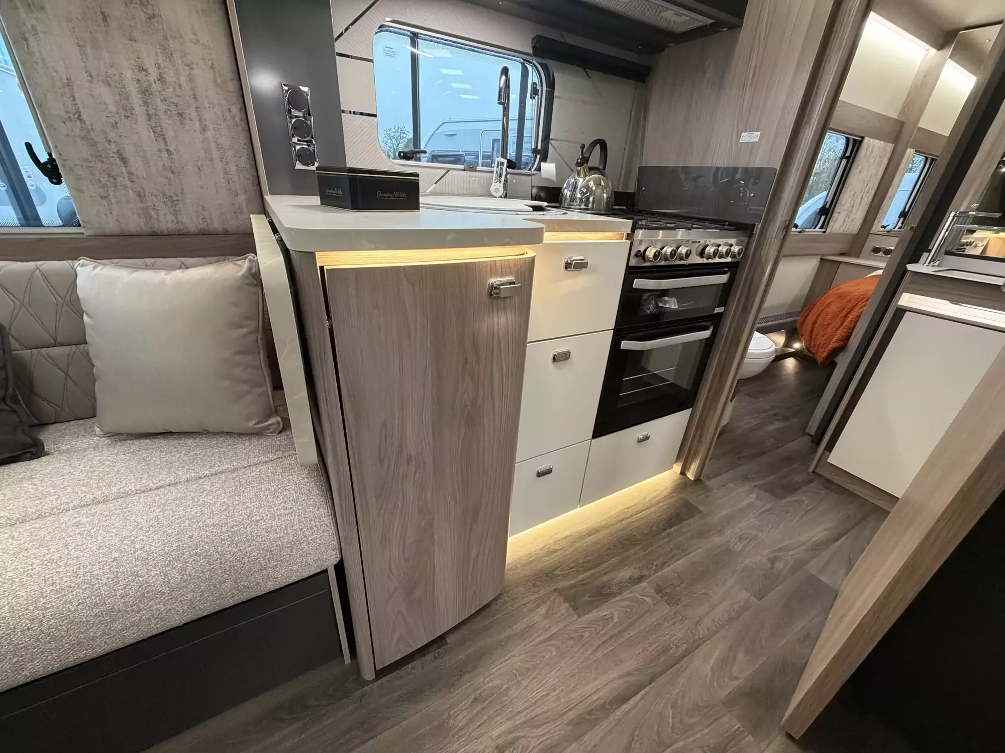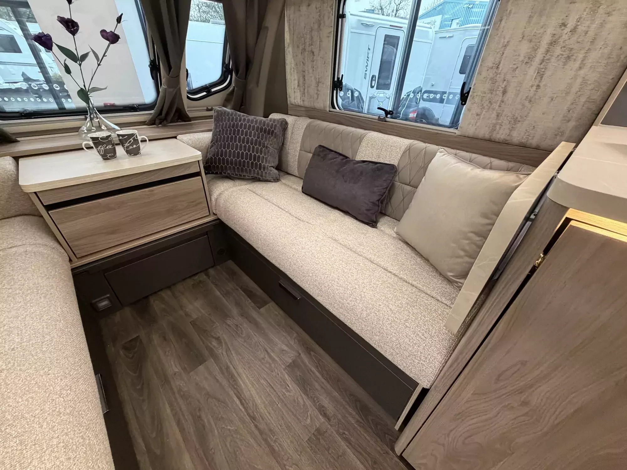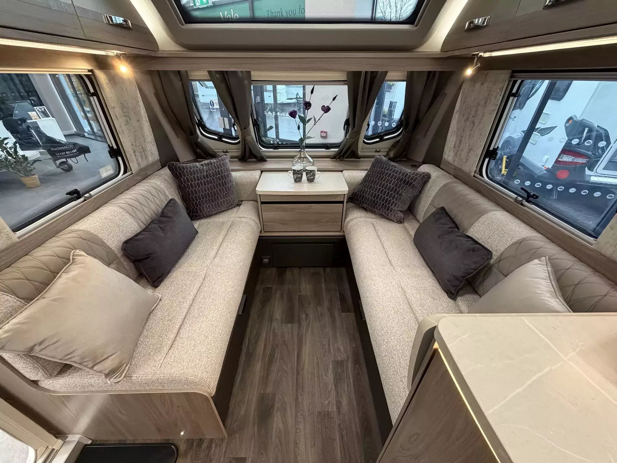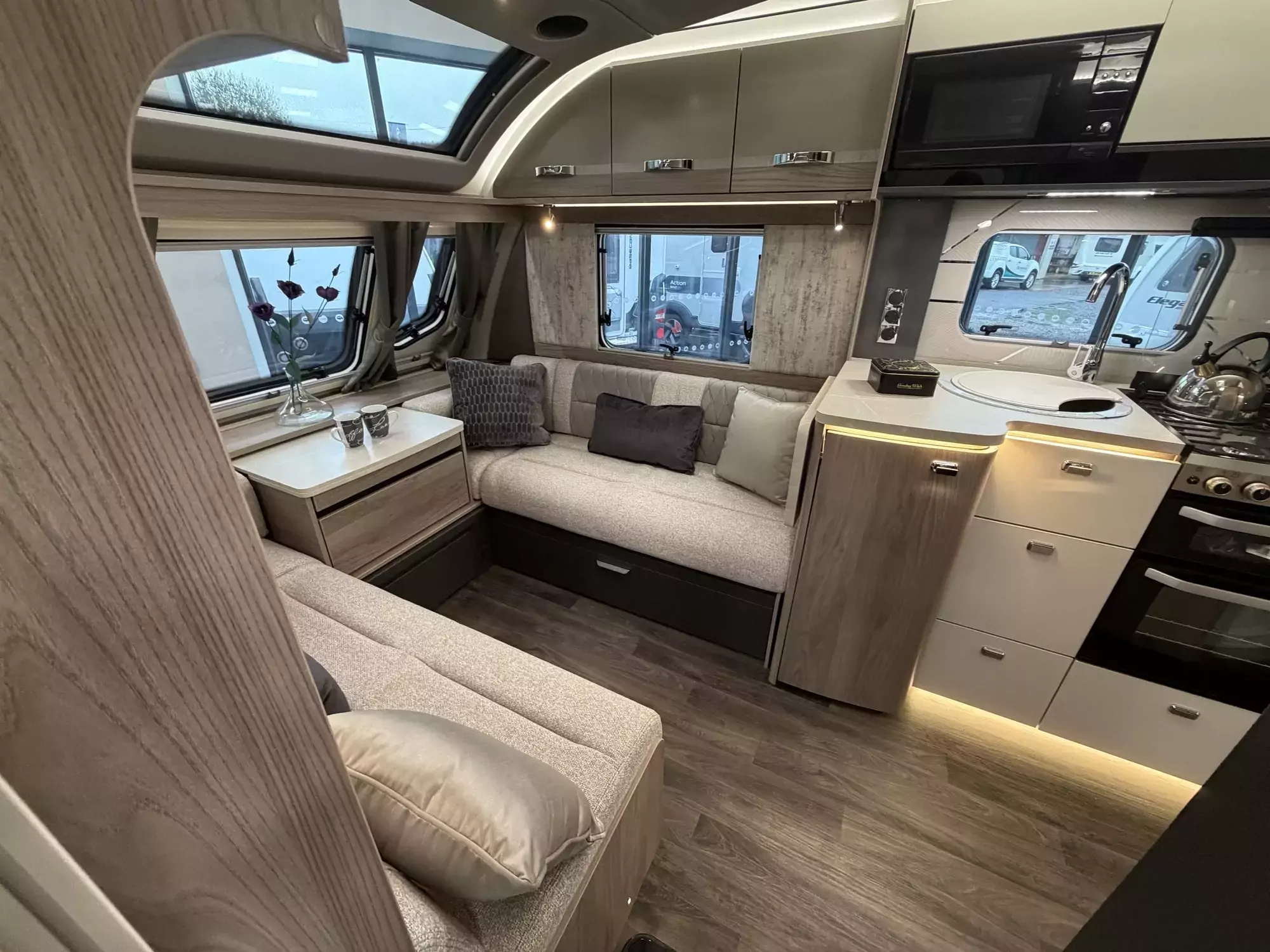 At the front of the caravan, the spacious lounge features parallel seating that can be converted into a second double bed, offering a flexible area for socializing or sleeping. Large windows allow for plenty of natural light, creating a bright and airy living space, while the plush upholstery and contemporary furnishings add a touch of luxury.