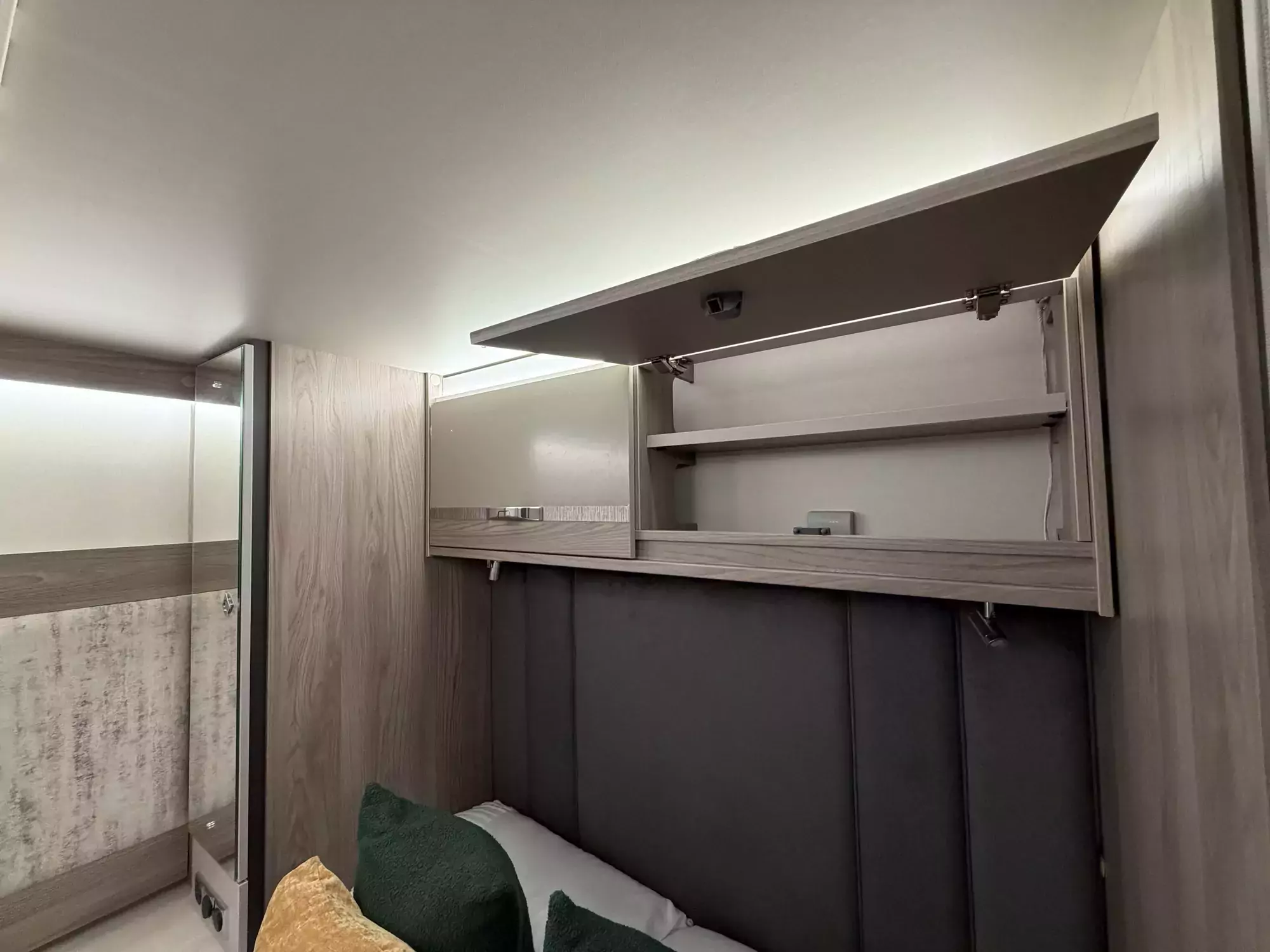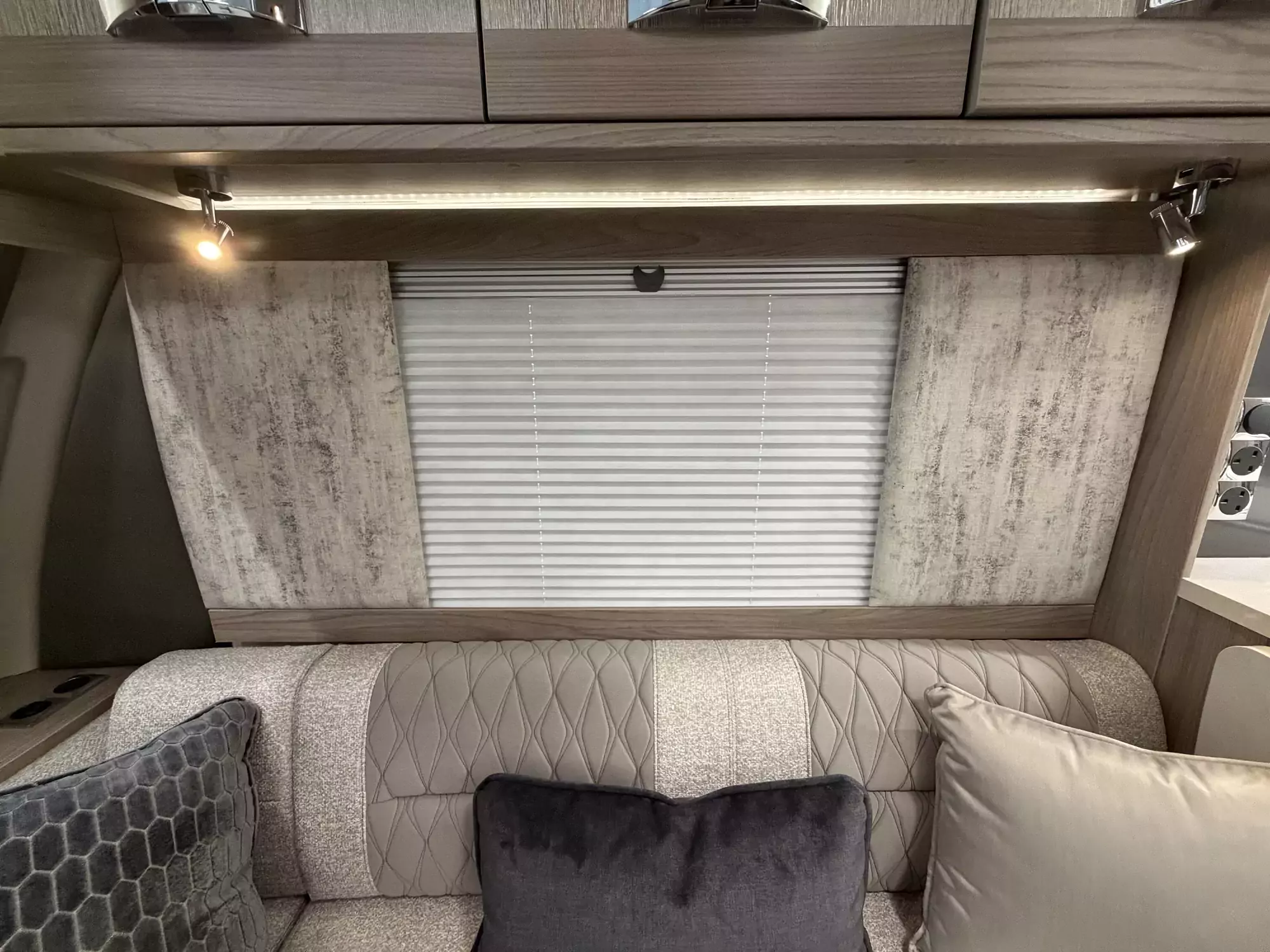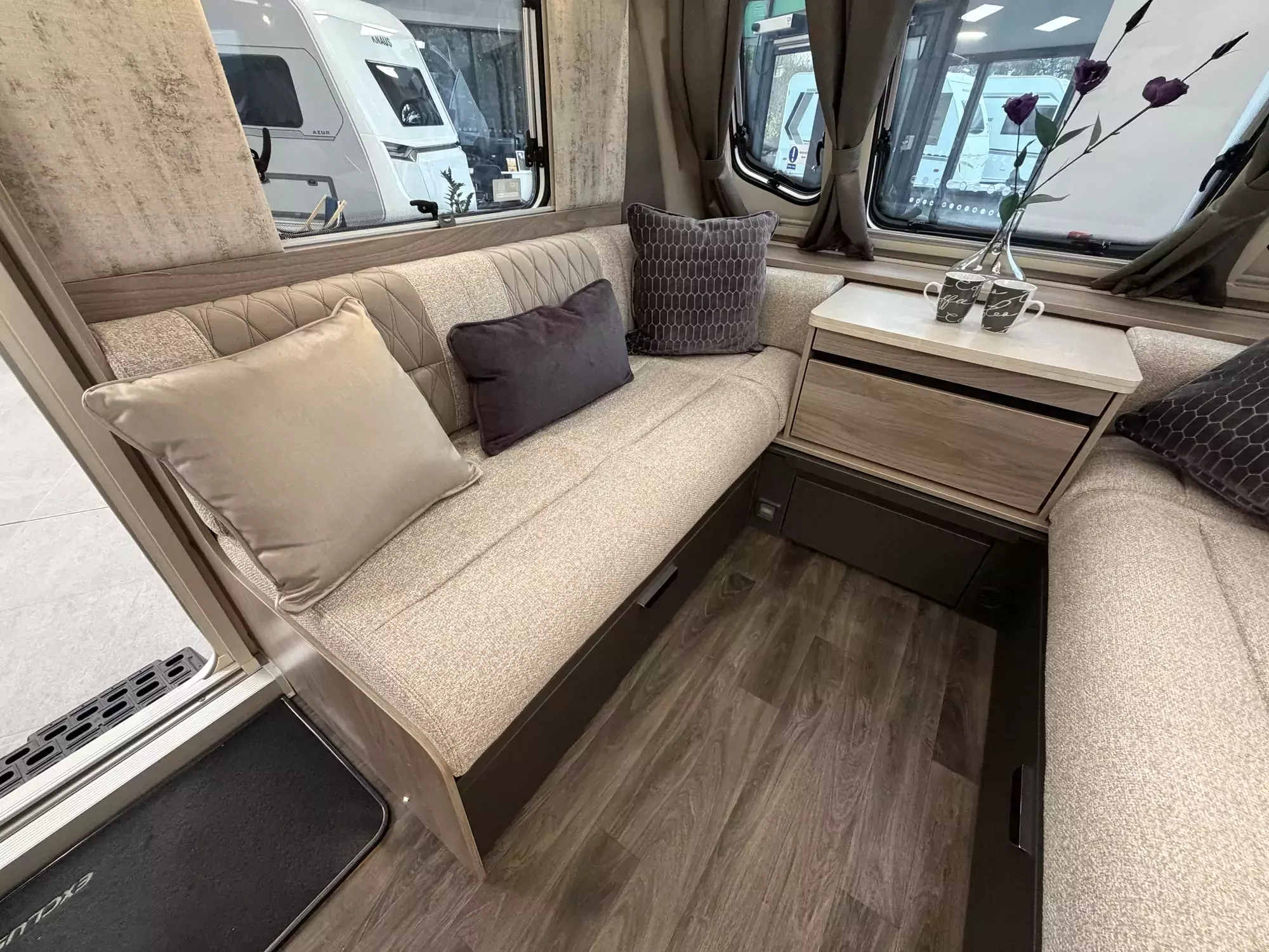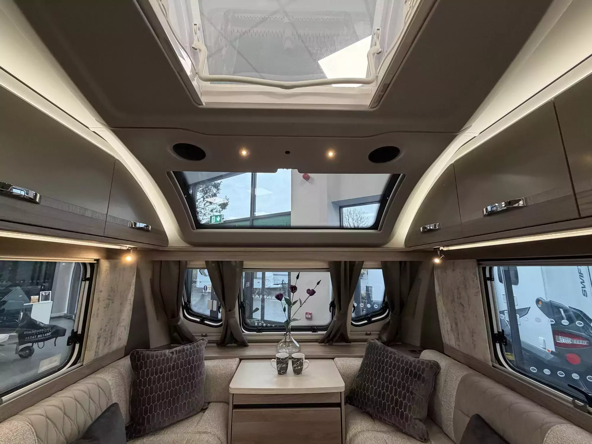 At the front of the caravan, the spacious lounge features parallel seating that can be converted into a second double bed, offering a flexible area for socializing or sleeping. Large windows allow for plenty of natural light, creating a bright and airy living space, while the plush upholstery and contemporary furnishings add a touch of luxury.