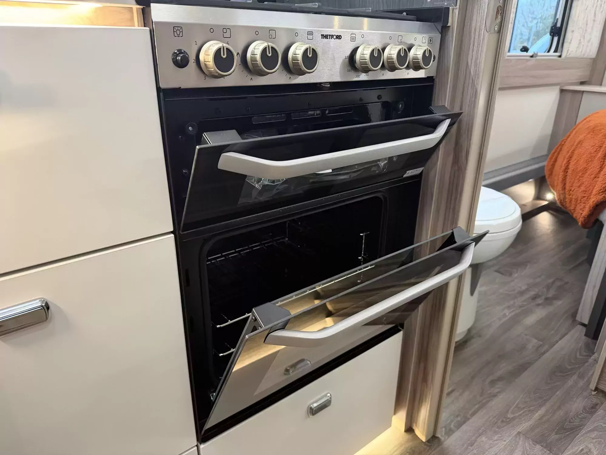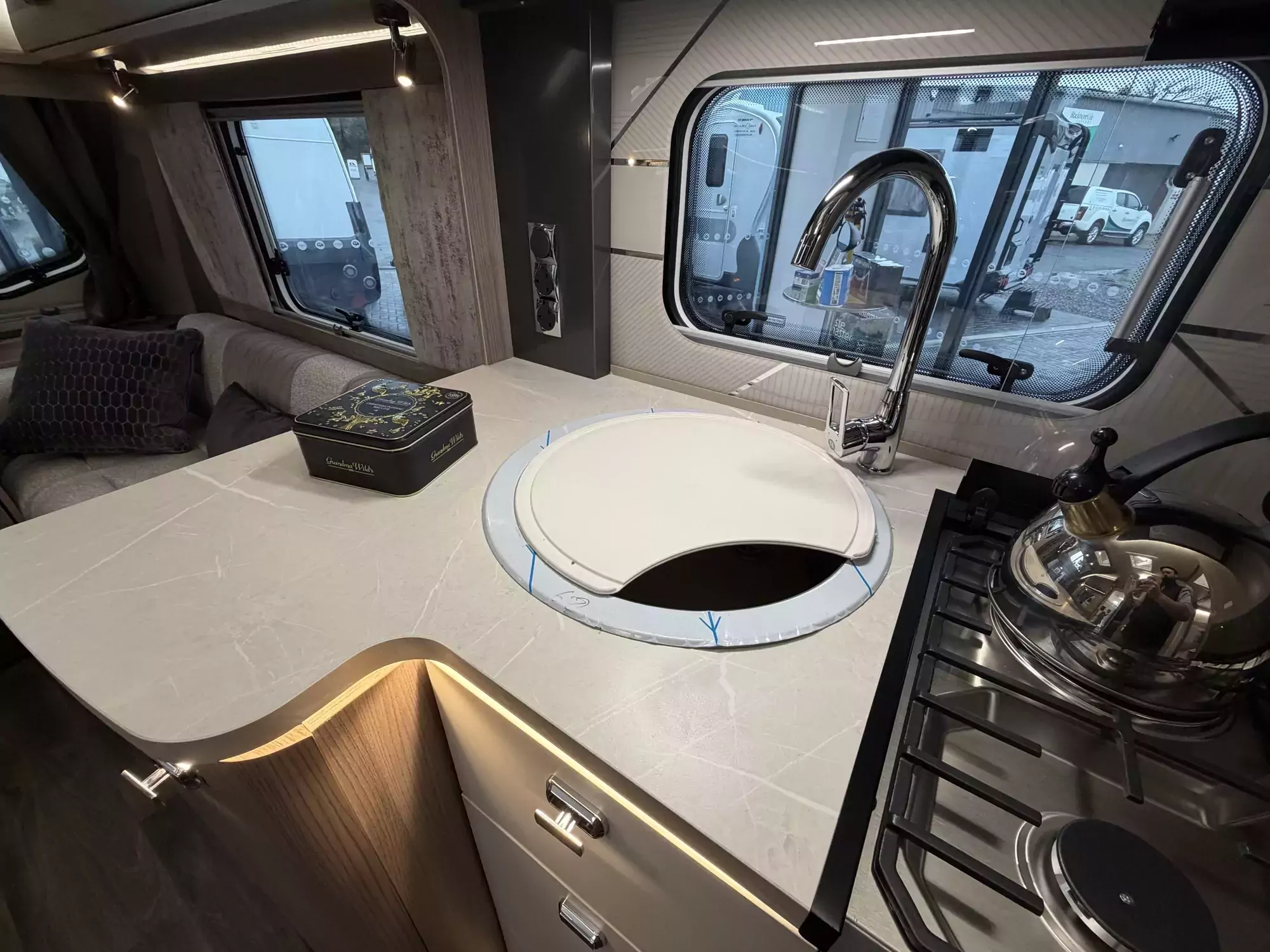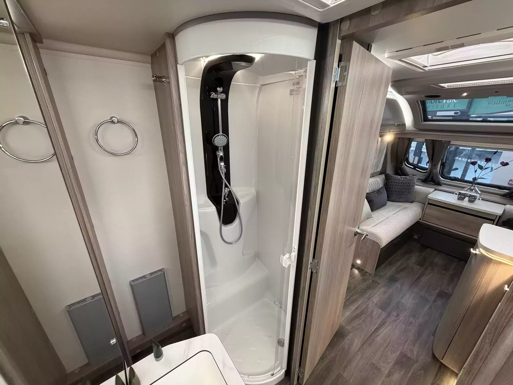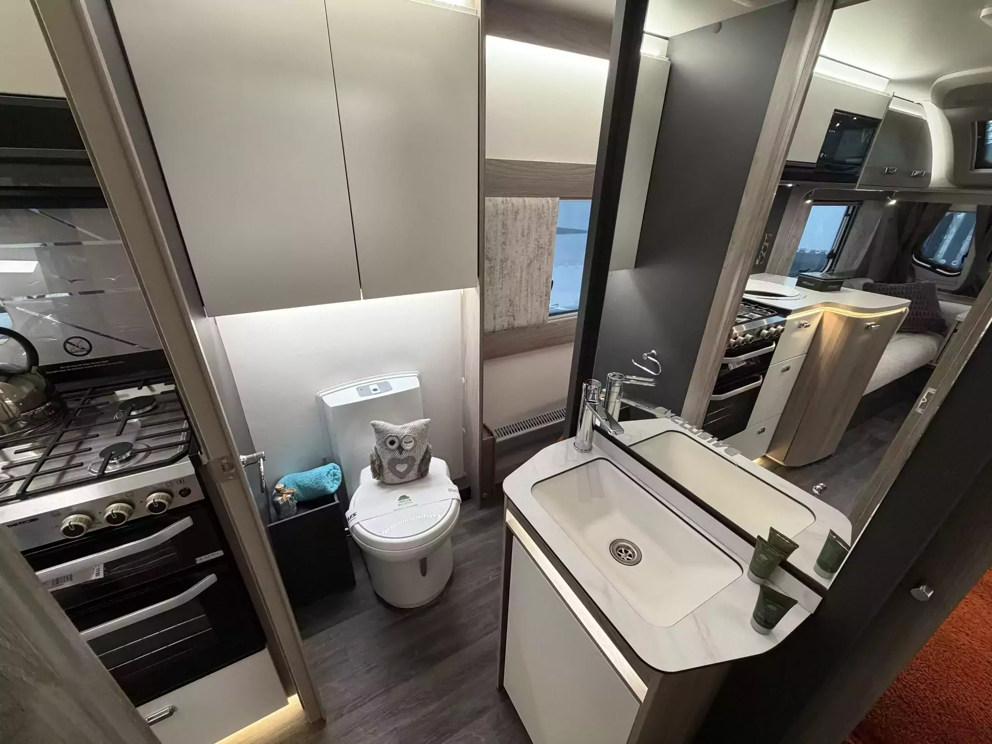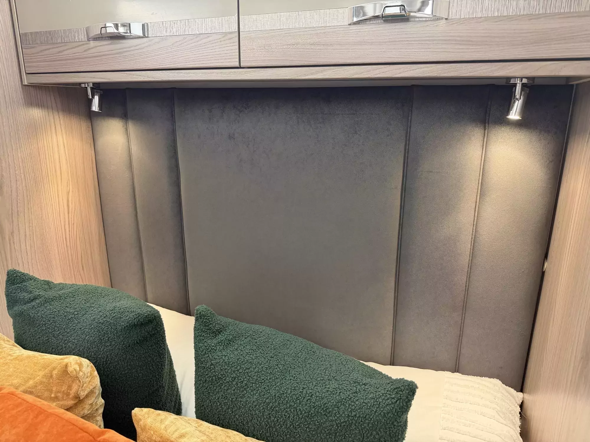 At the front of the caravan, the spacious lounge features parallel seating that can be converted into a second double bed, offering a flexible area for socializing or sleeping. Large windows allow for plenty of natural light, creating a bright and airy living space, while the plush upholstery and contemporary furnishings add a touch of luxury.