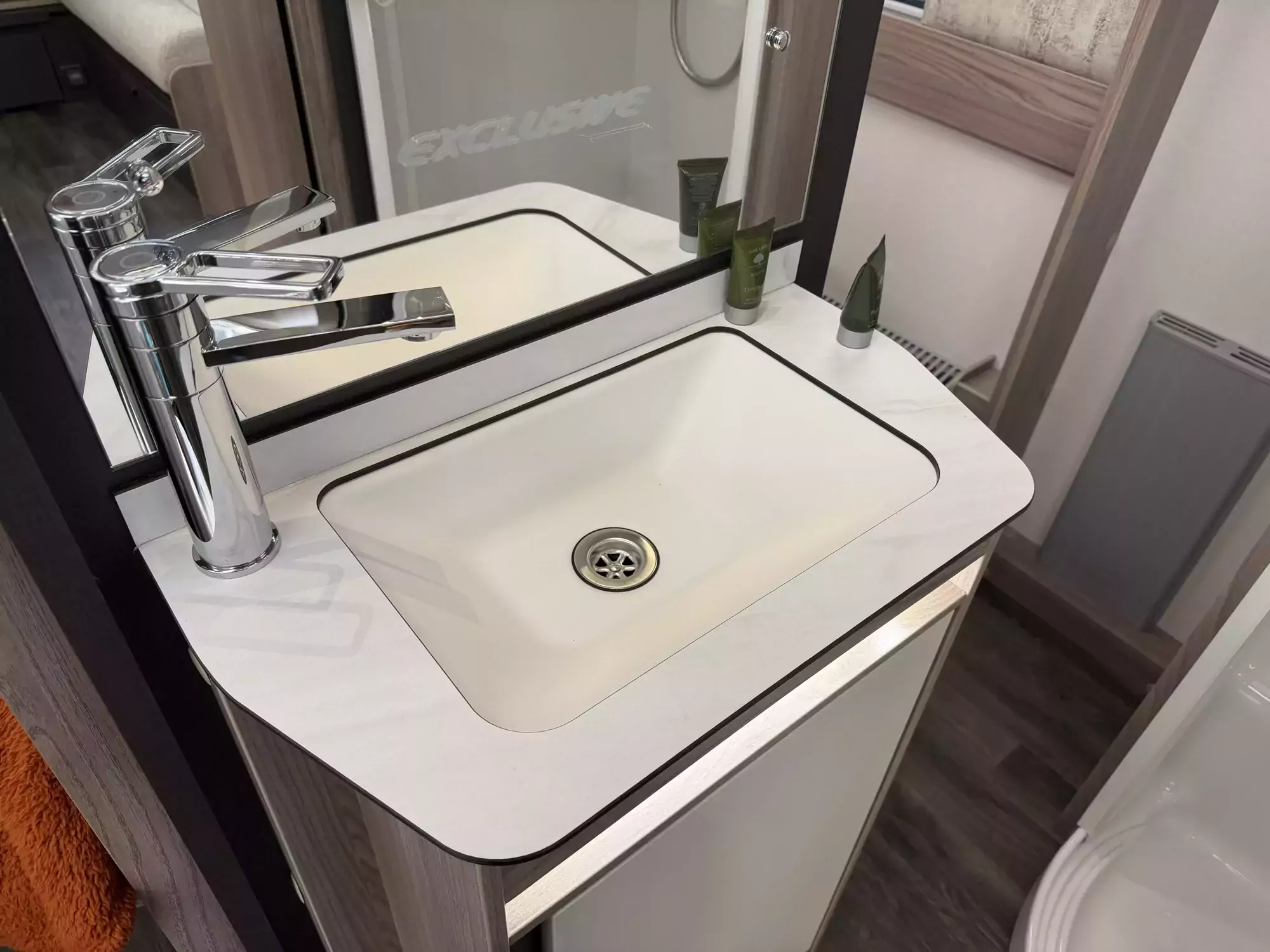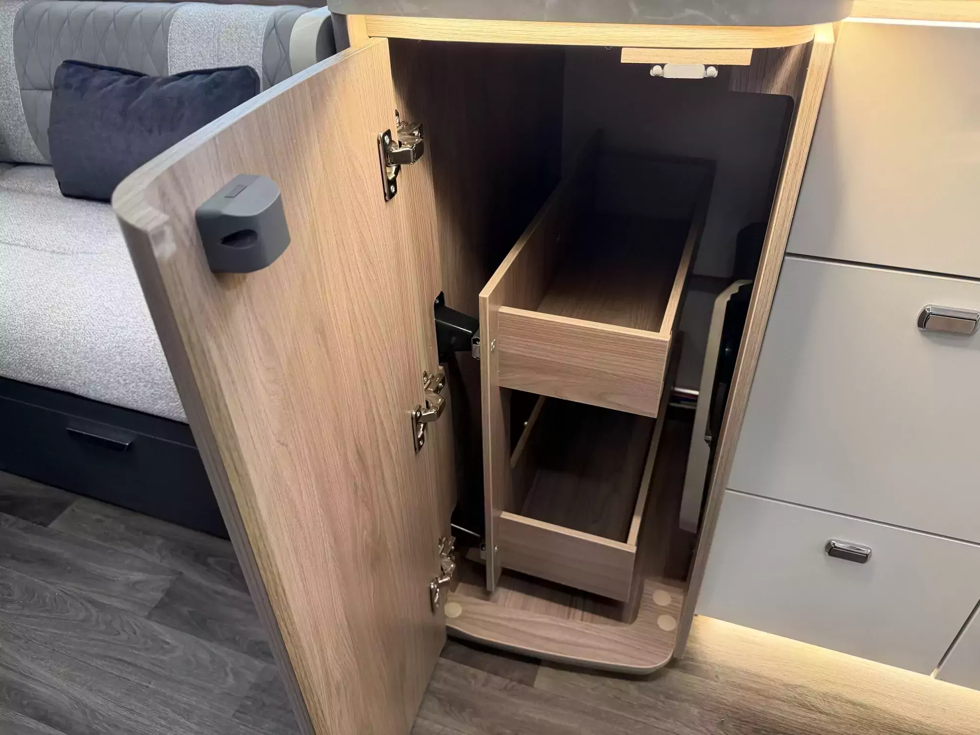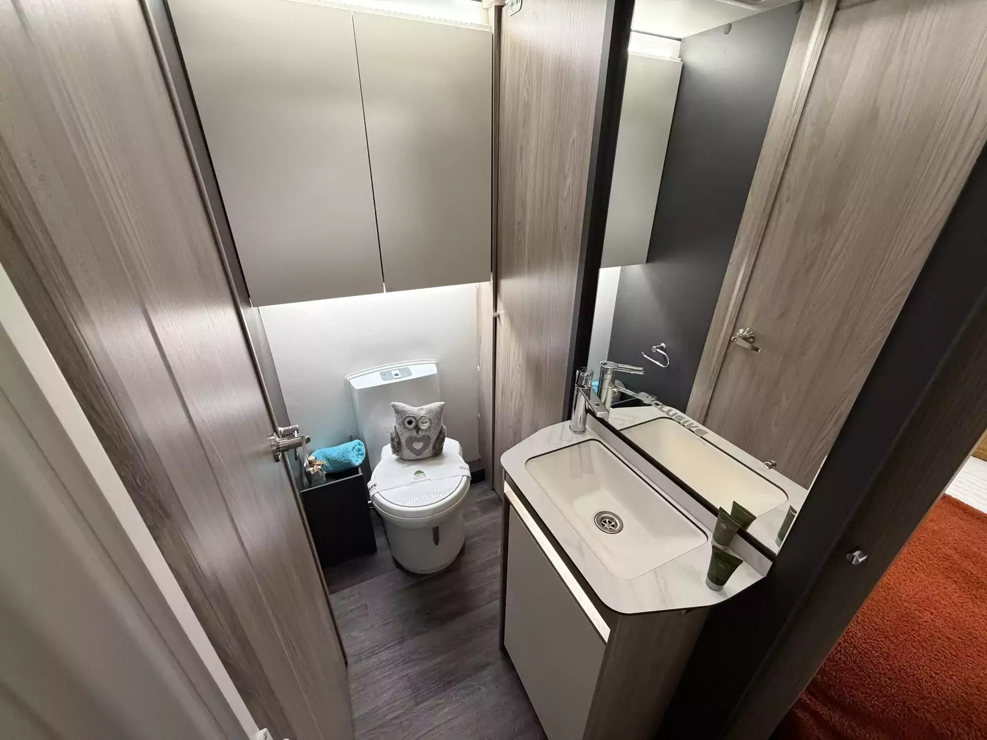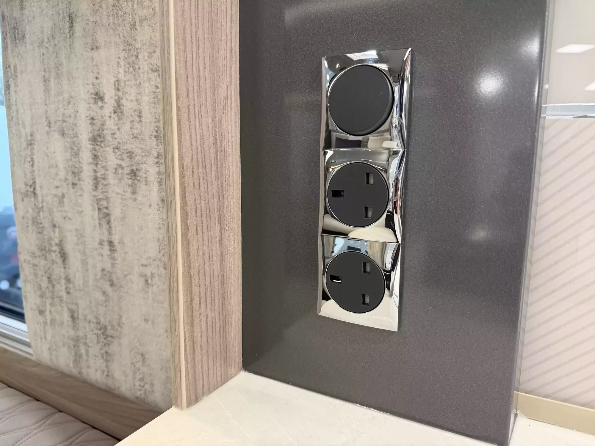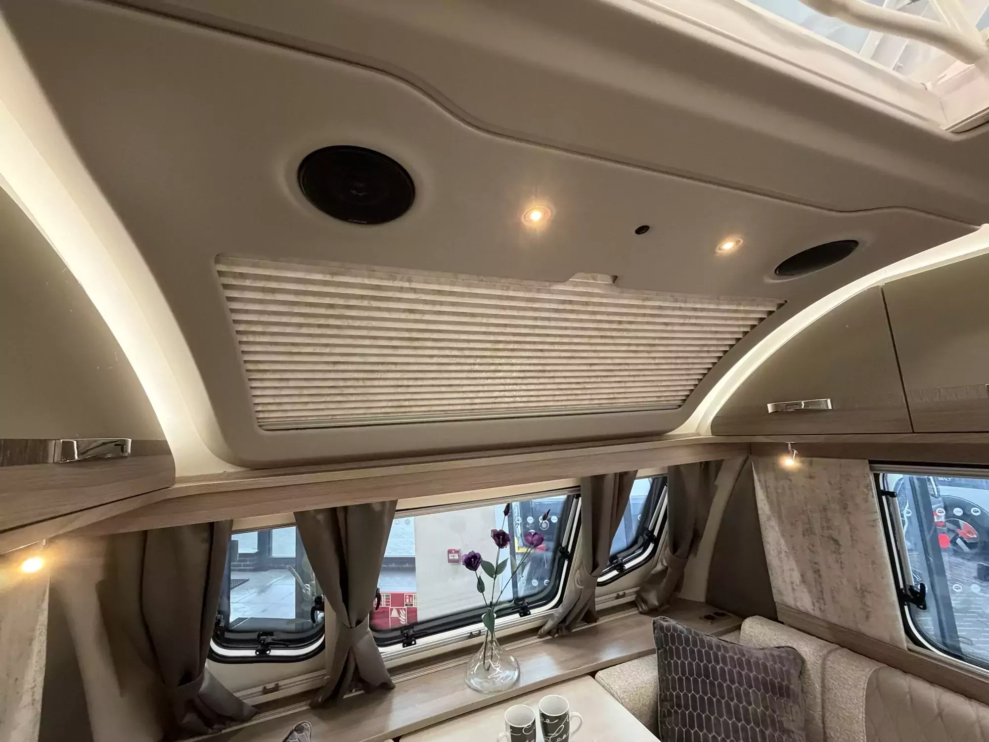 At the front of the caravan, the spacious lounge features parallel seating that can be converted into a second double bed, offering a flexible area for socializing or sleeping. Large windows allow for plenty of natural light, creating a bright and airy living space, while the plush upholstery and contemporary furnishings add a touch of luxury.