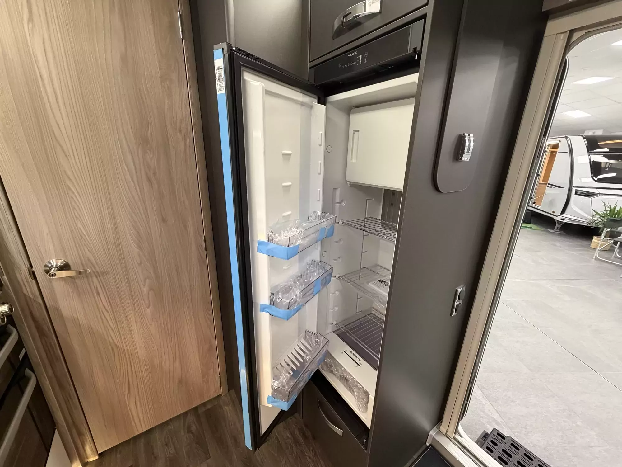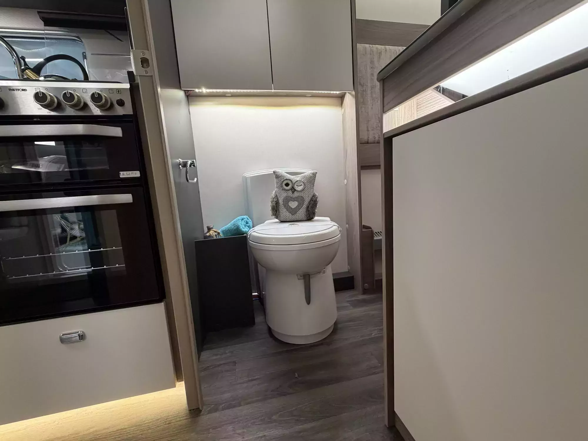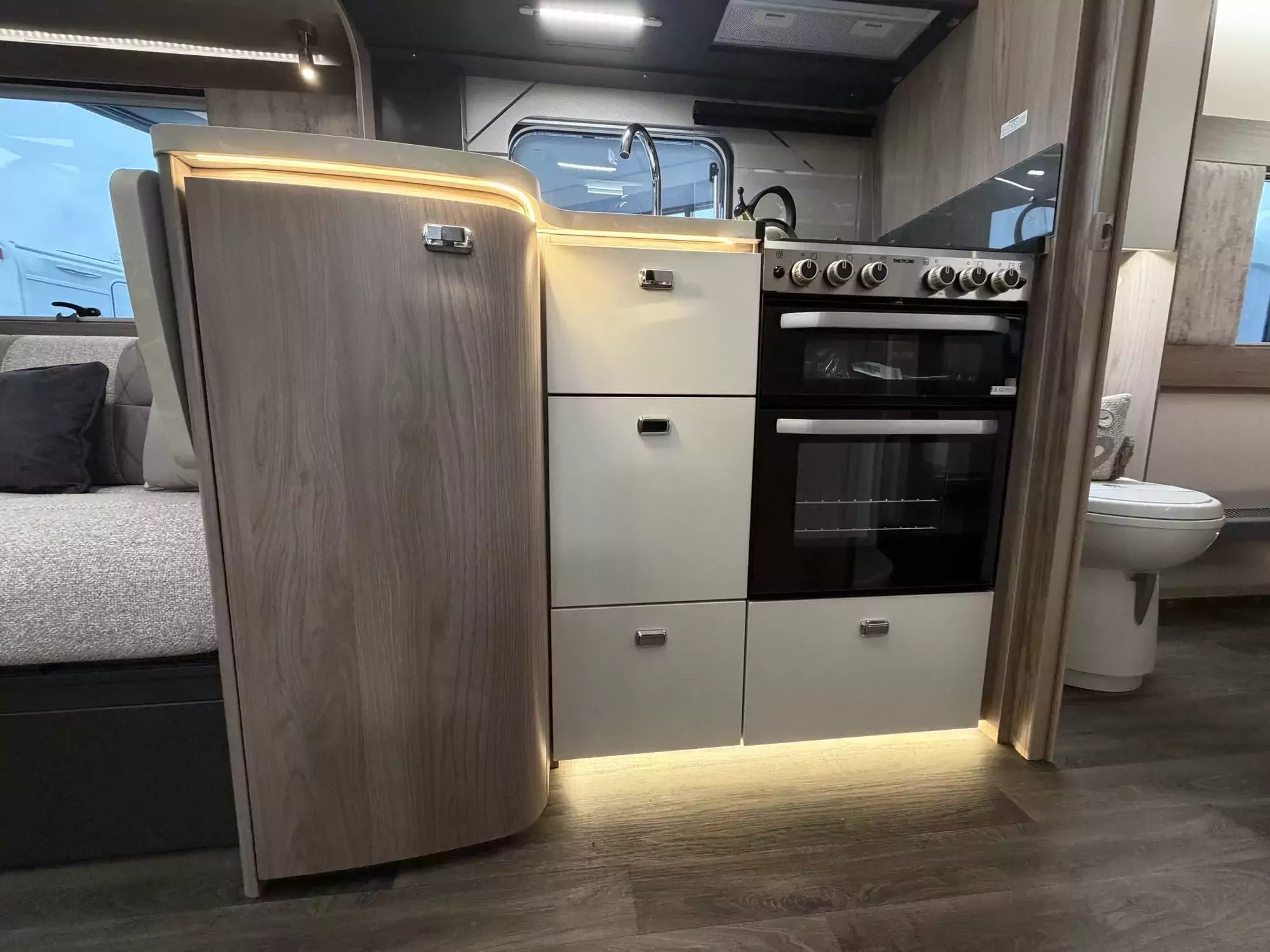 The well-equipped kitchen is located in the middle of the caravan and includes a hob, oven, microwave, and a large fridge/freezer. With ample worktop space and clever storage solutions, meal preparation is convenient and enjoyable, whether you're cooking a quick snack or a full dinner.