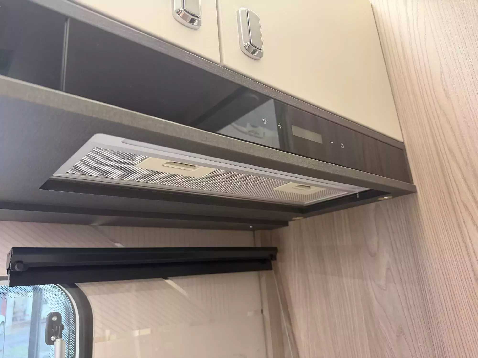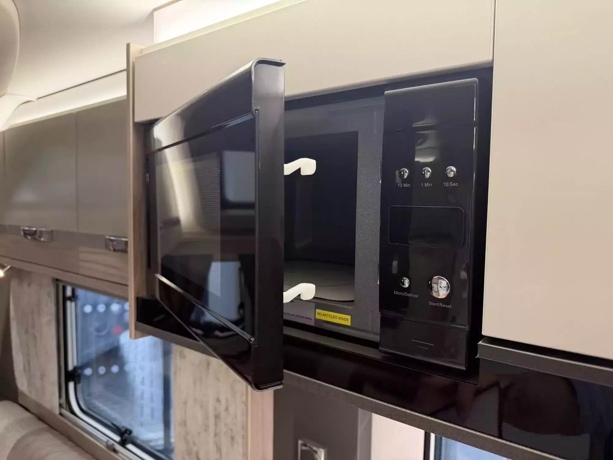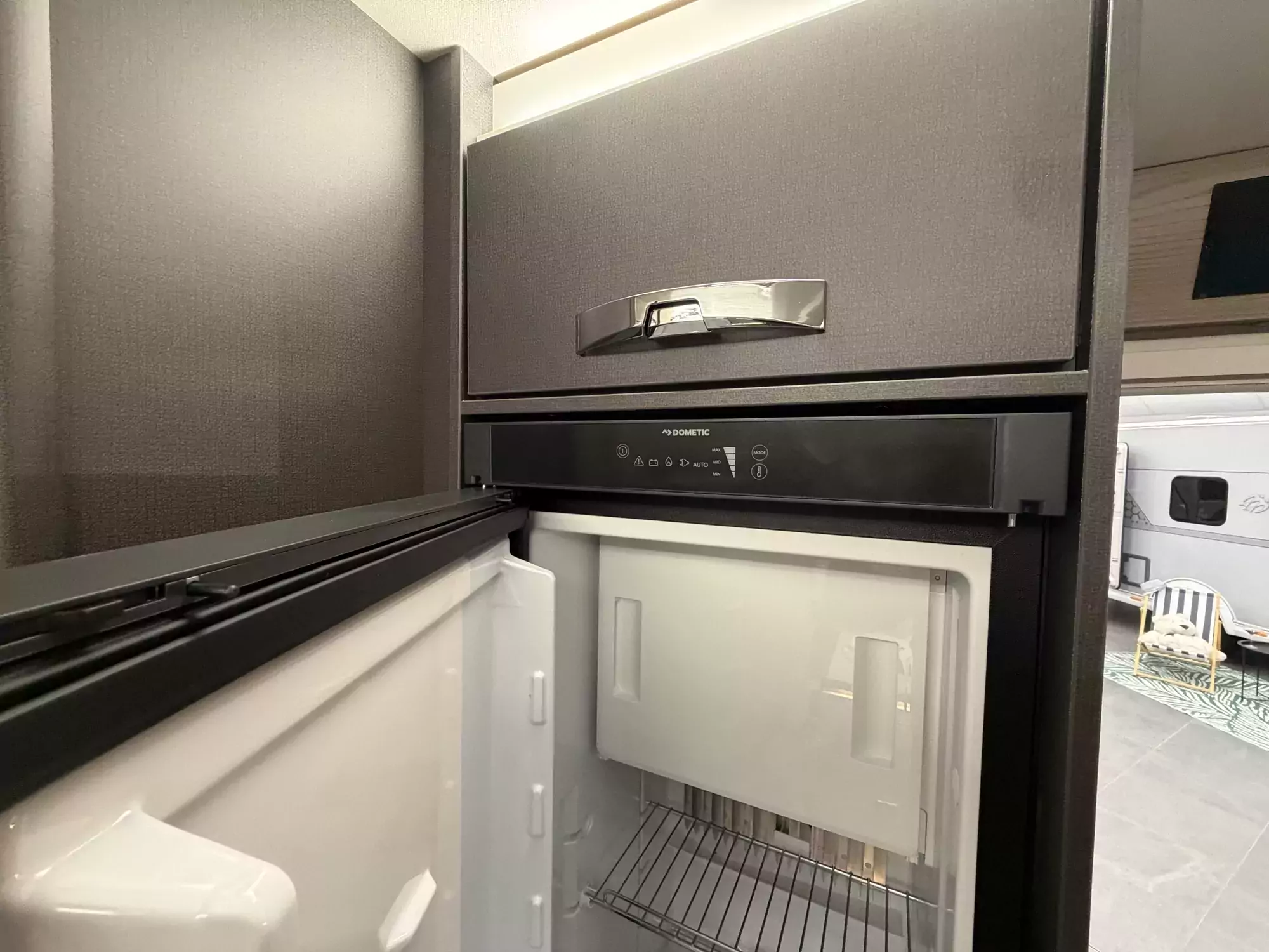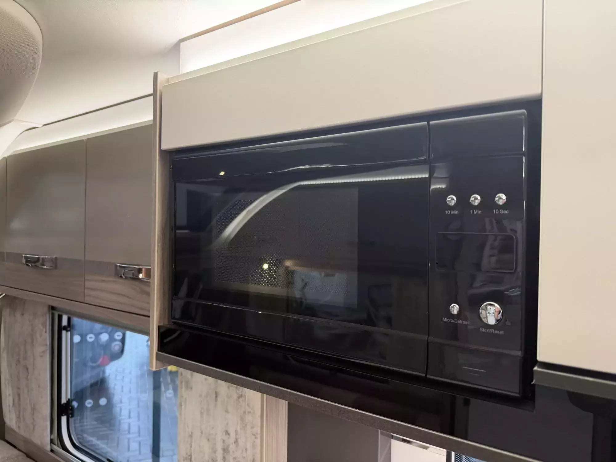 The well-equipped kitchen is located in the middle of the caravan and includes a hob, oven, microwave, and a large fridge/freezer. With ample worktop space and clever storage solutions, meal preparation is convenient and enjoyable, whether you're cooking a quick snack or a full dinner.