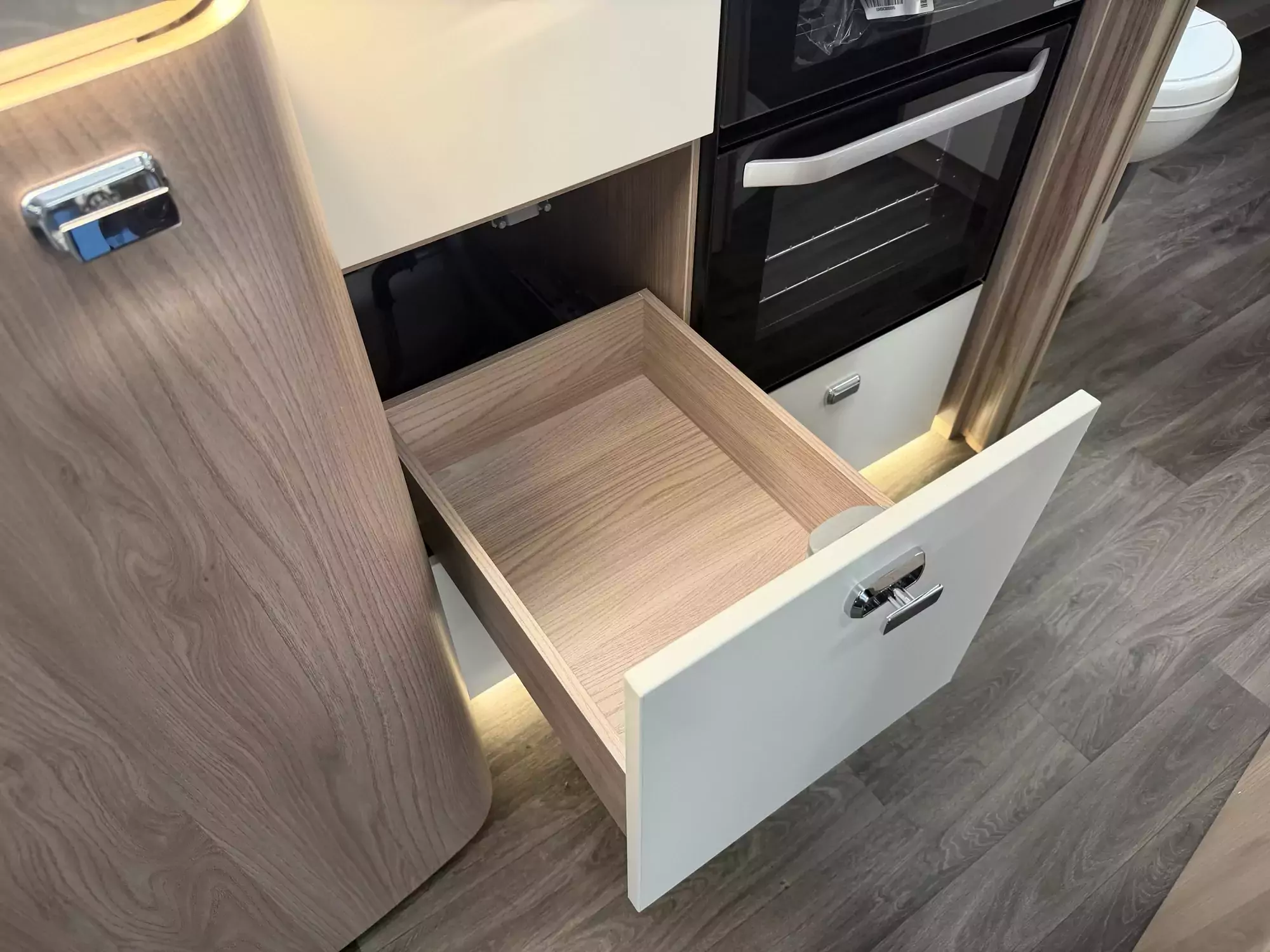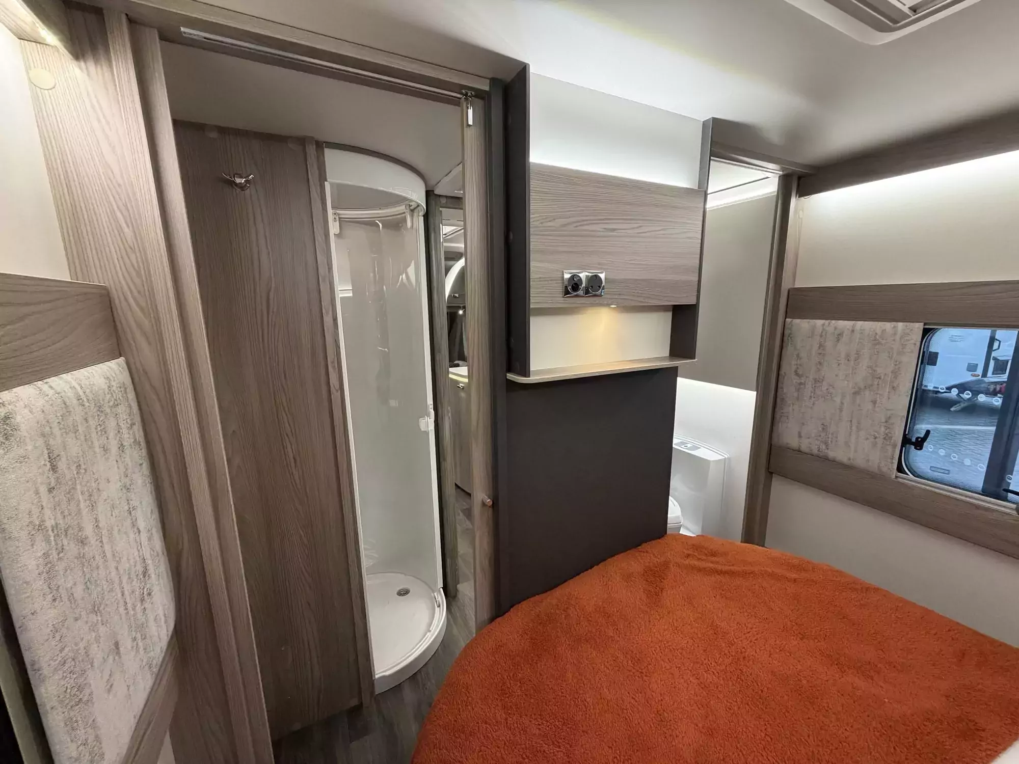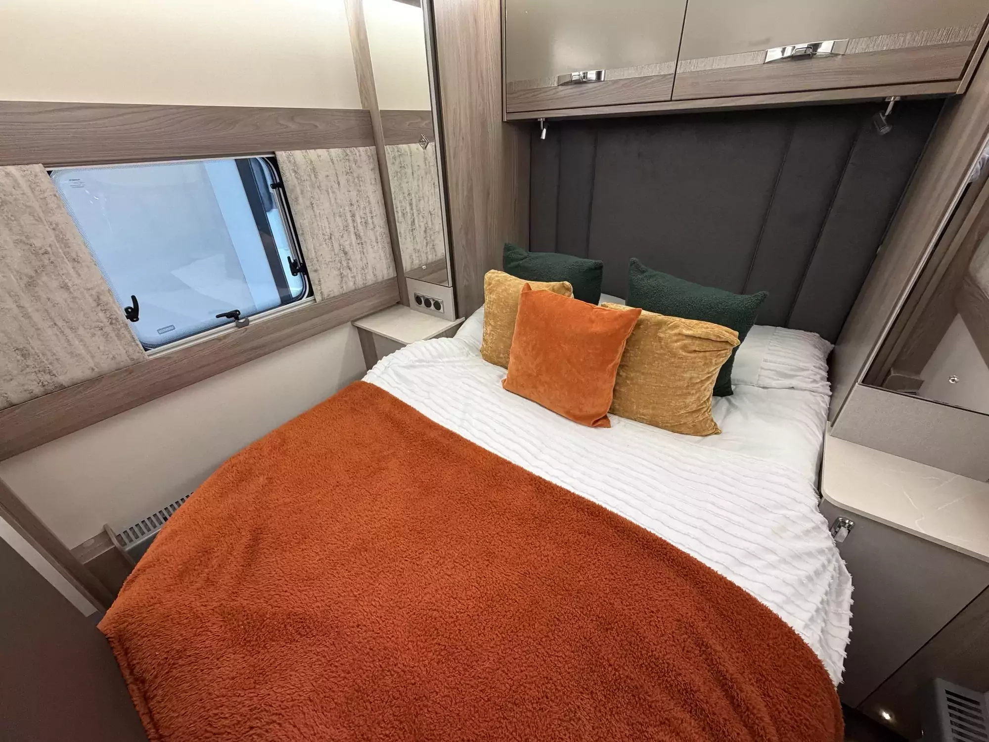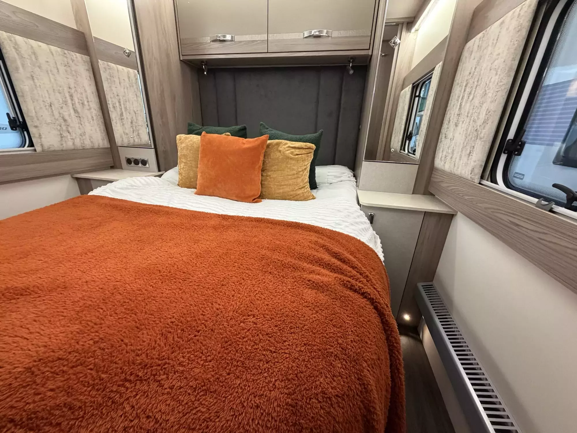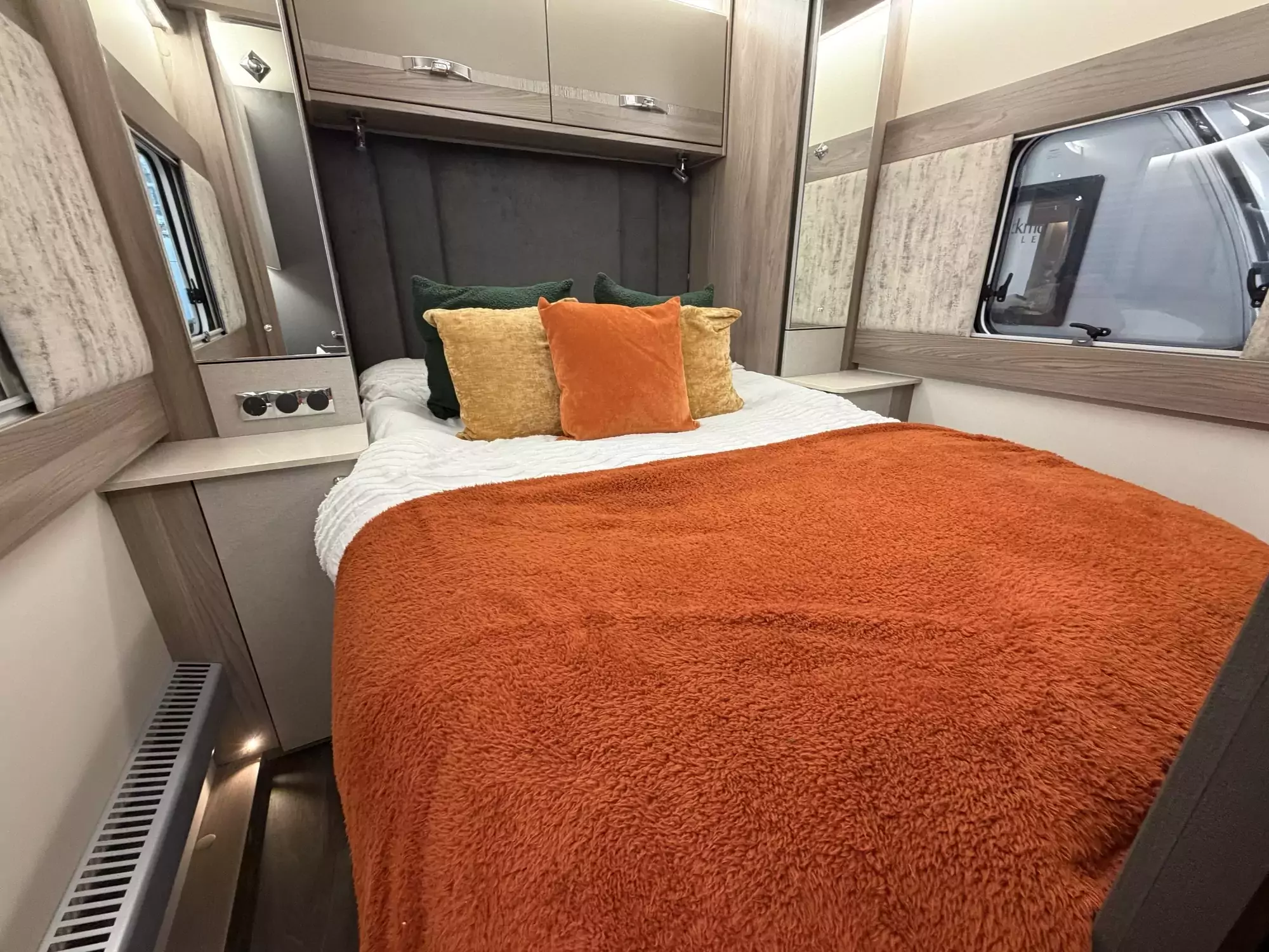 One of the key highlights of the Challenger 560 is its fixed island bed located at the rear, offering a comfortable and private sleeping area. The bed is surrounded by plenty of storage space, including overhead lockers and wardrobes on both sides, making it easy to keep the interior organized. This fixed-bed layout ensures convenience, allowing you to relax without having to reconfigure the space each night.