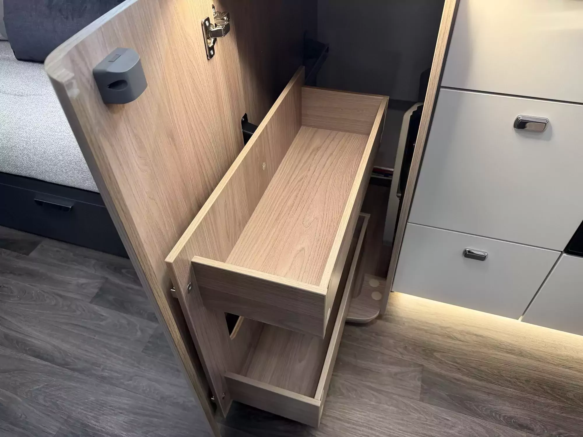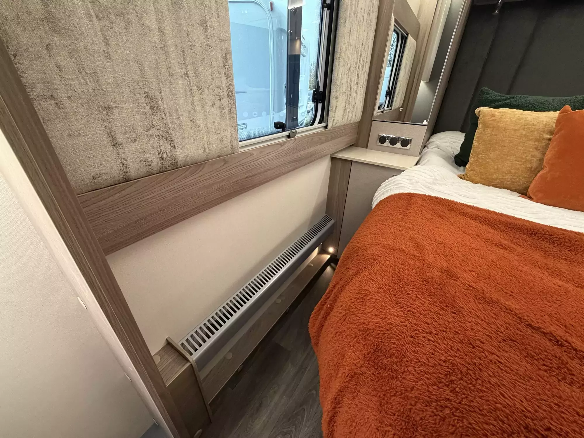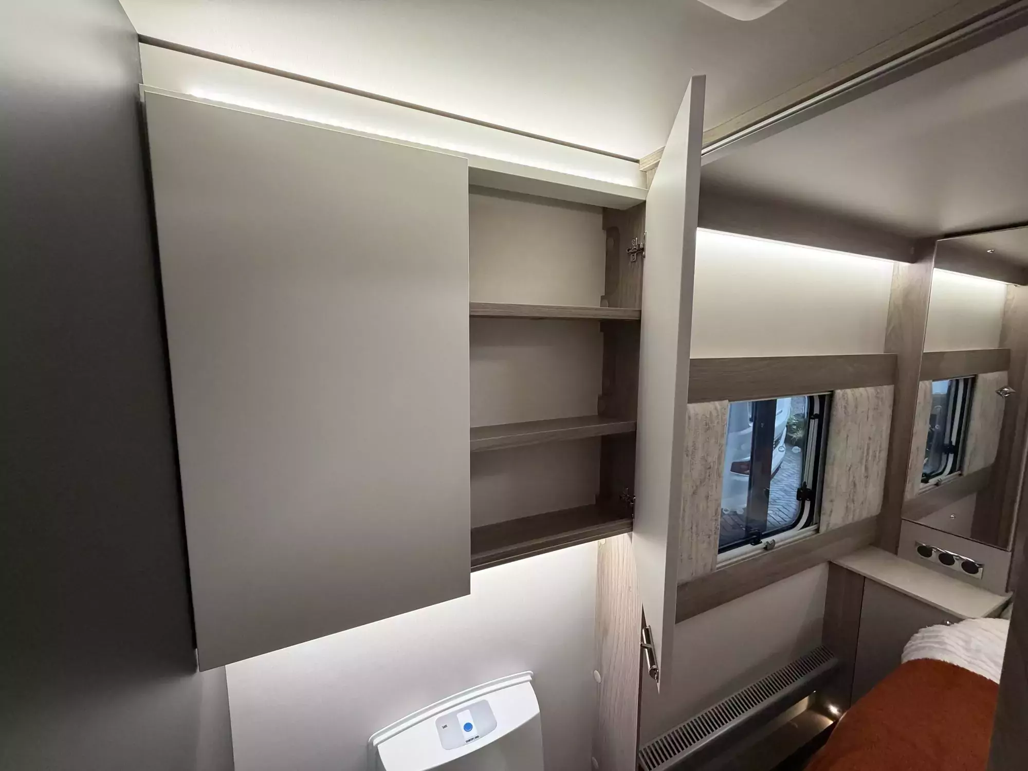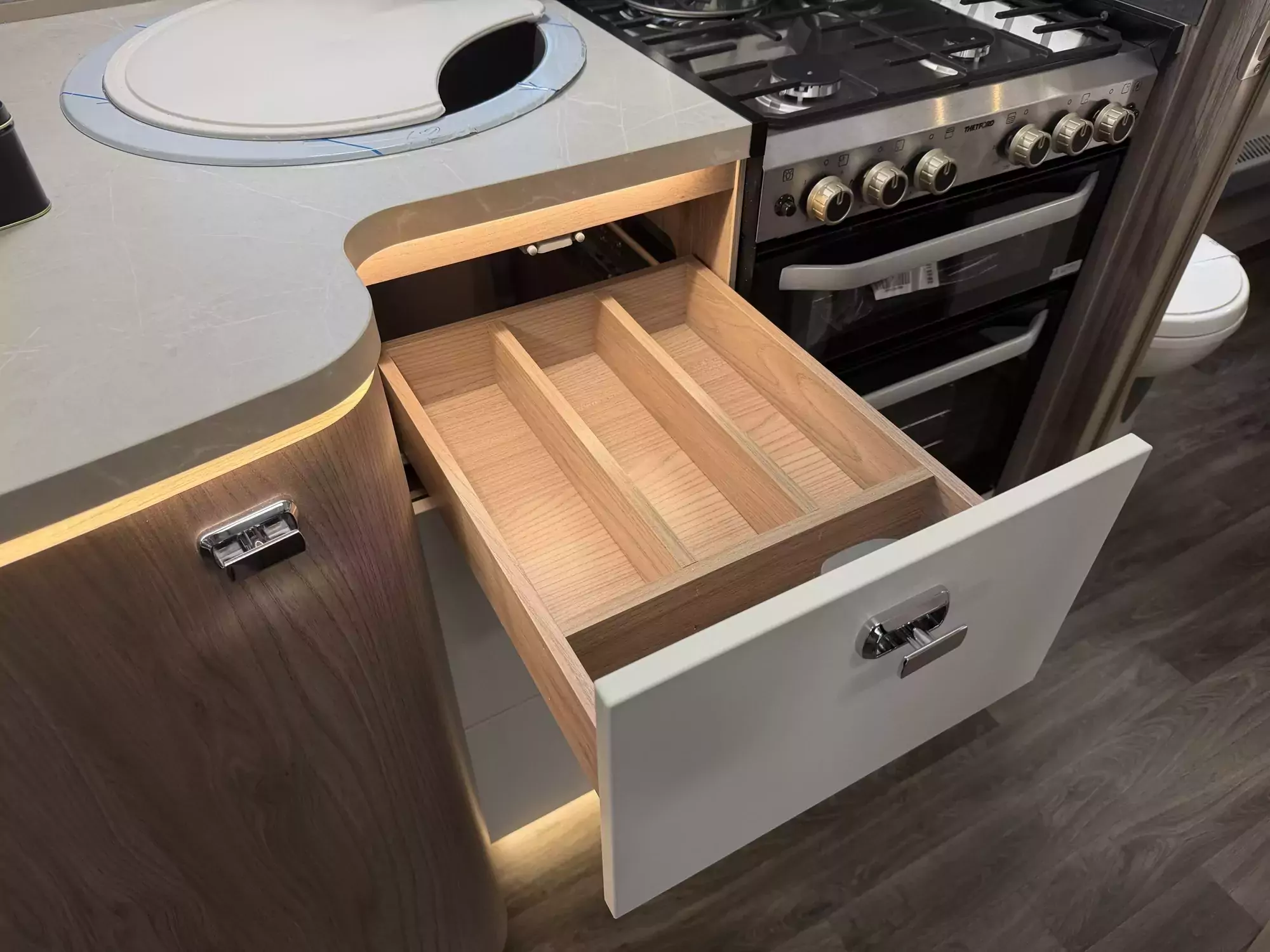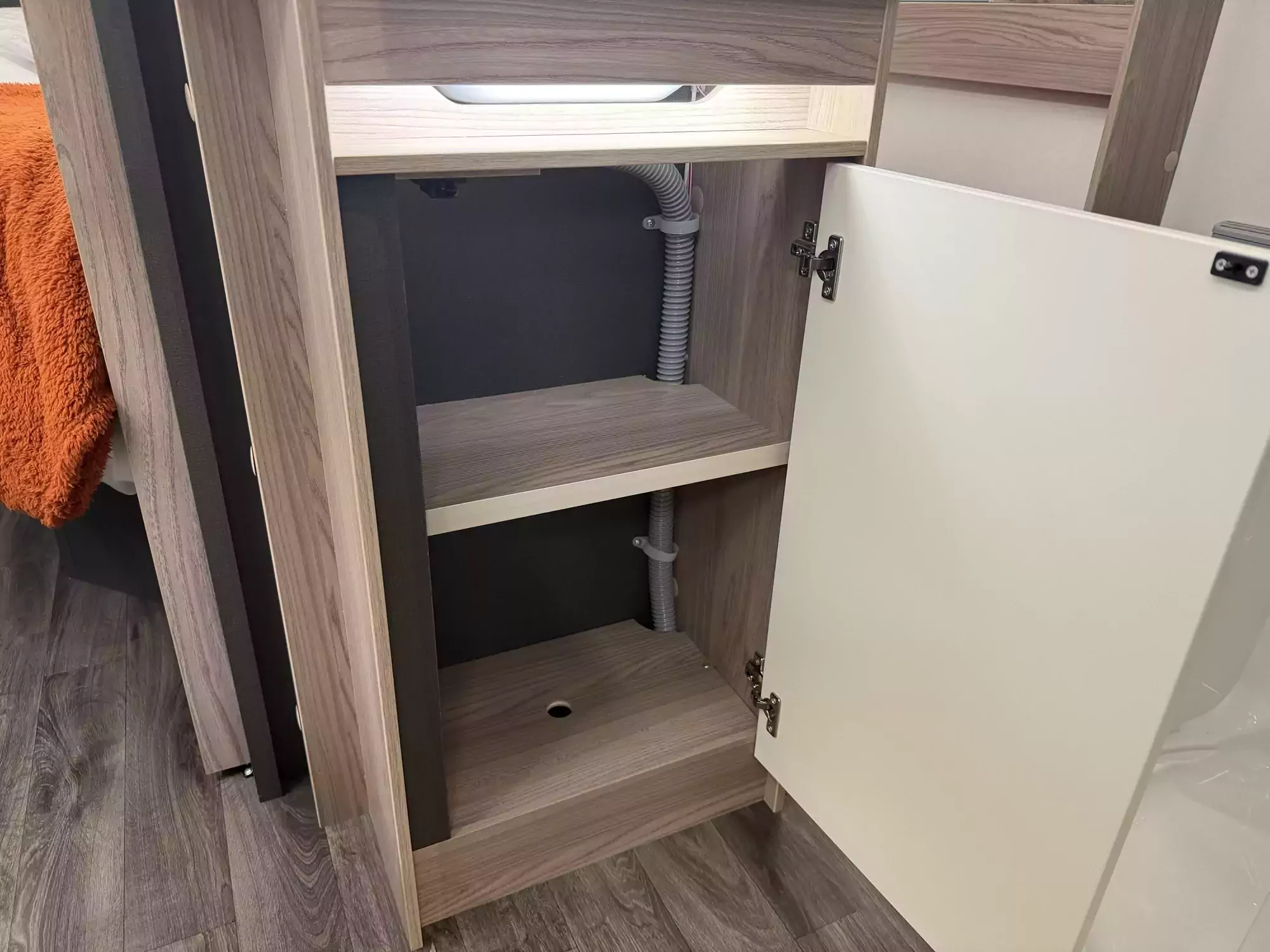 One of the key highlights of the Challenger 560 is its fixed island bed located at the rear, offering a comfortable and private sleeping area. The bed is surrounded by plenty of storage space, including overhead lockers and wardrobes on both sides, making it easy to keep the interior organized. This fixed-bed layout ensures convenience, allowing you to relax without having to reconfigure the space each night.