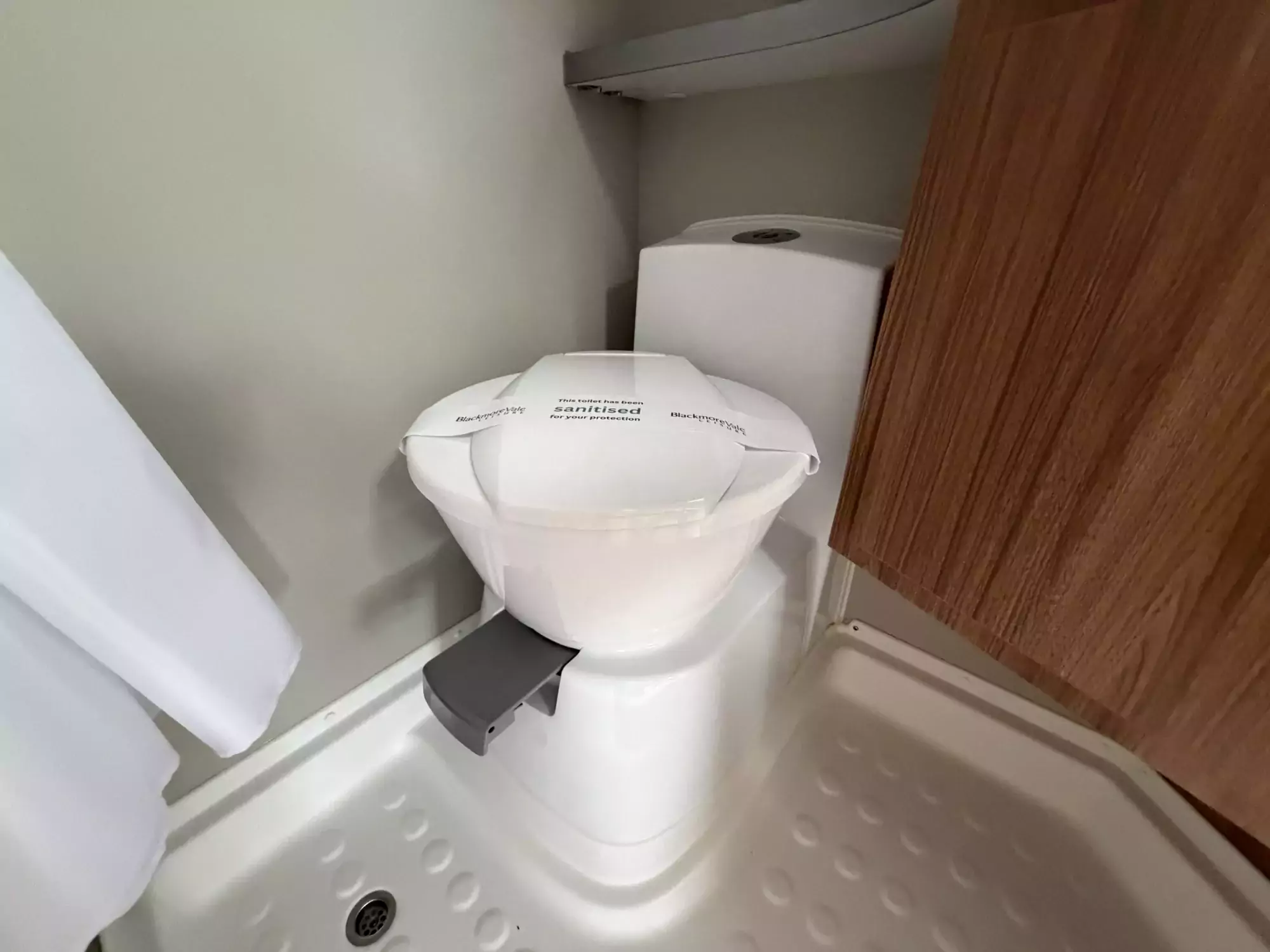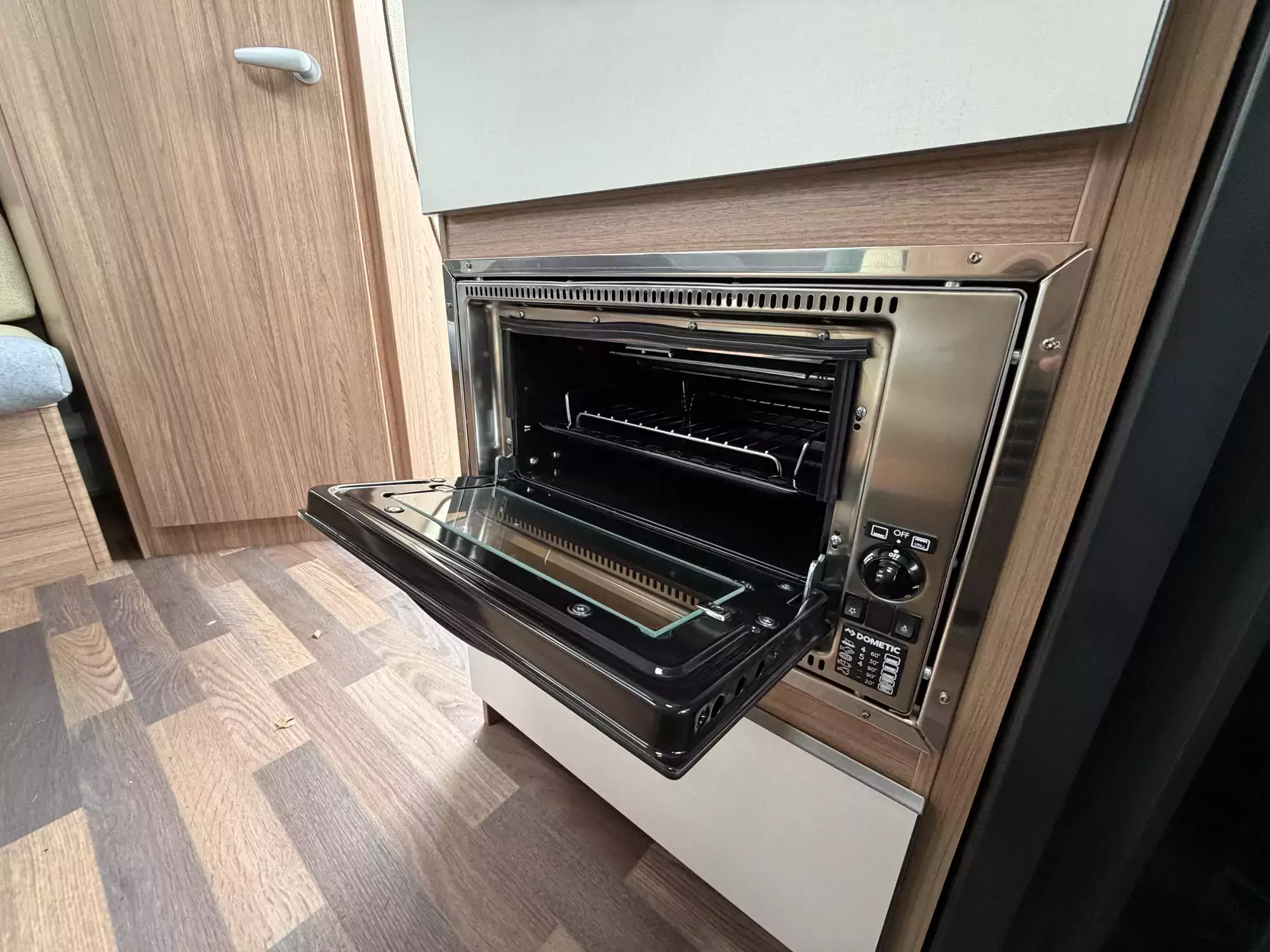 The kitchen block now comes standard with a gas oven, alongside the hob, sink, and fridge – perfect for preparing meals on the road. The washroom features a compact shower, wash basin, and cassette toilet, allowing you to freshen up easily without needing to leave the caravan.