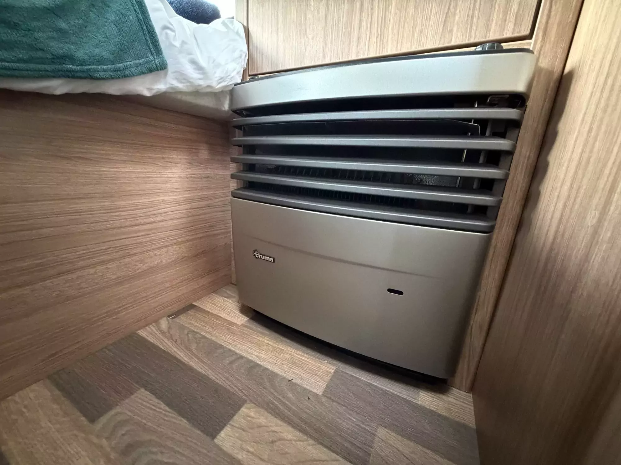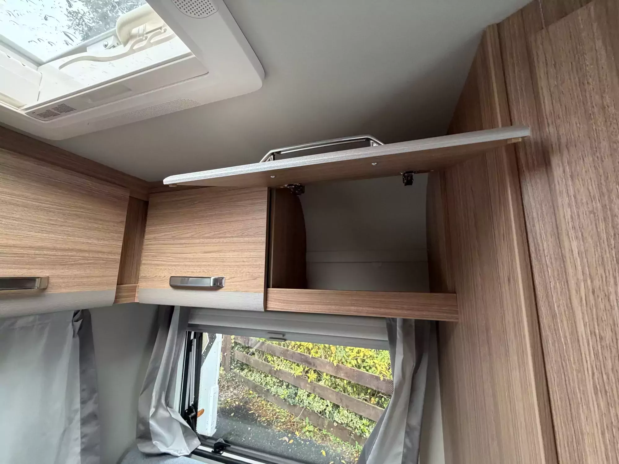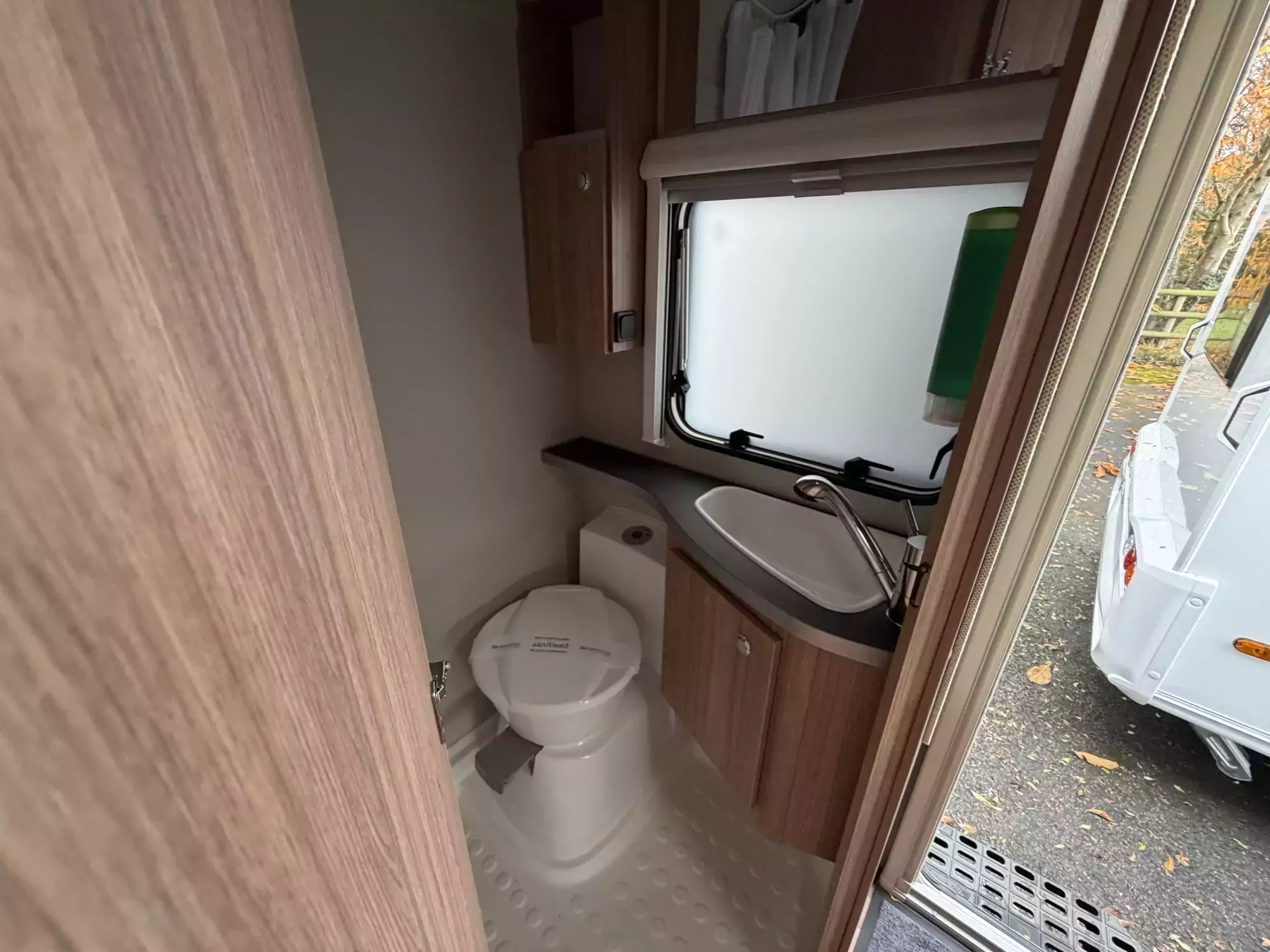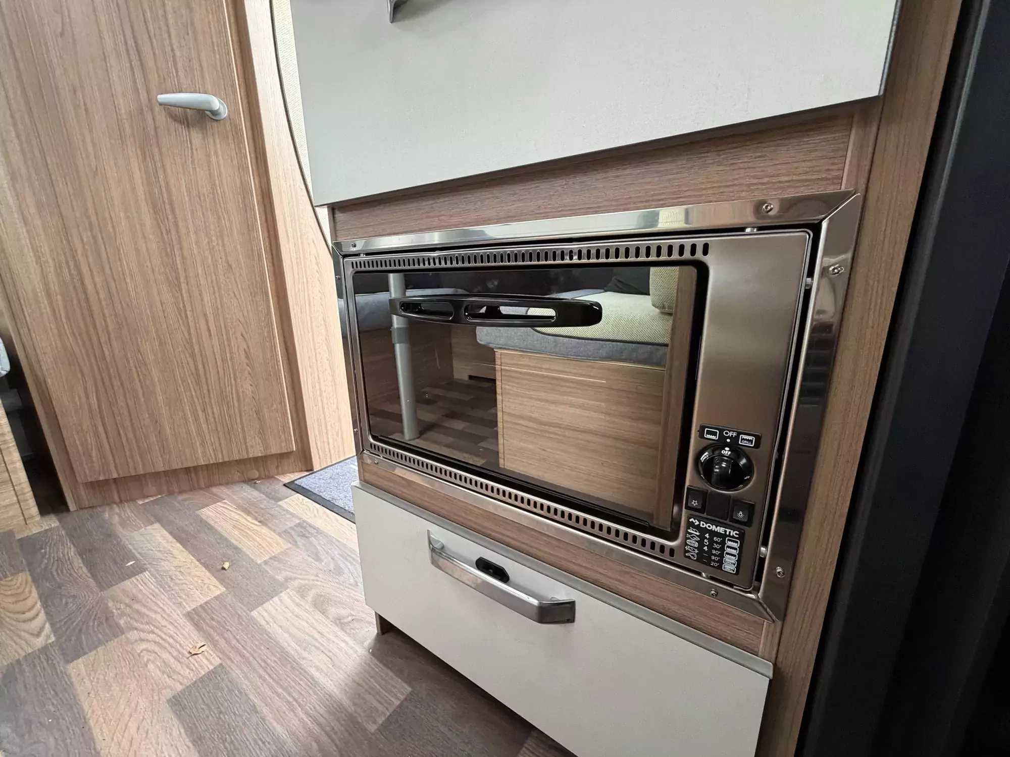The kitchen block now comes standard with a gas oven, alongside the hob, sink, and fridge – perfect for preparing meals on the road. The washroom features a compact shower, wash basin, and cassette toilet, allowing you to freshen up easily without needing to leave the caravan.