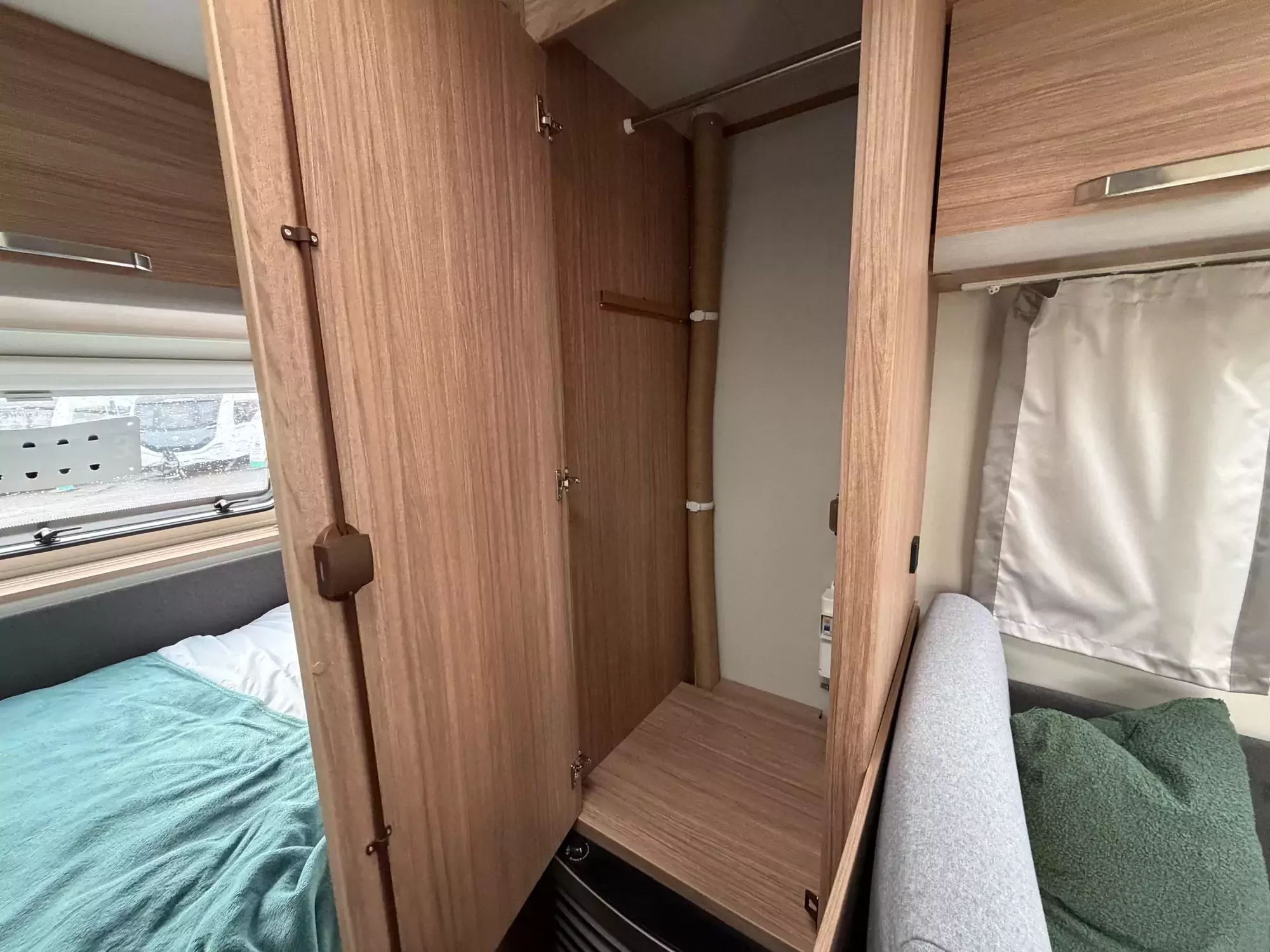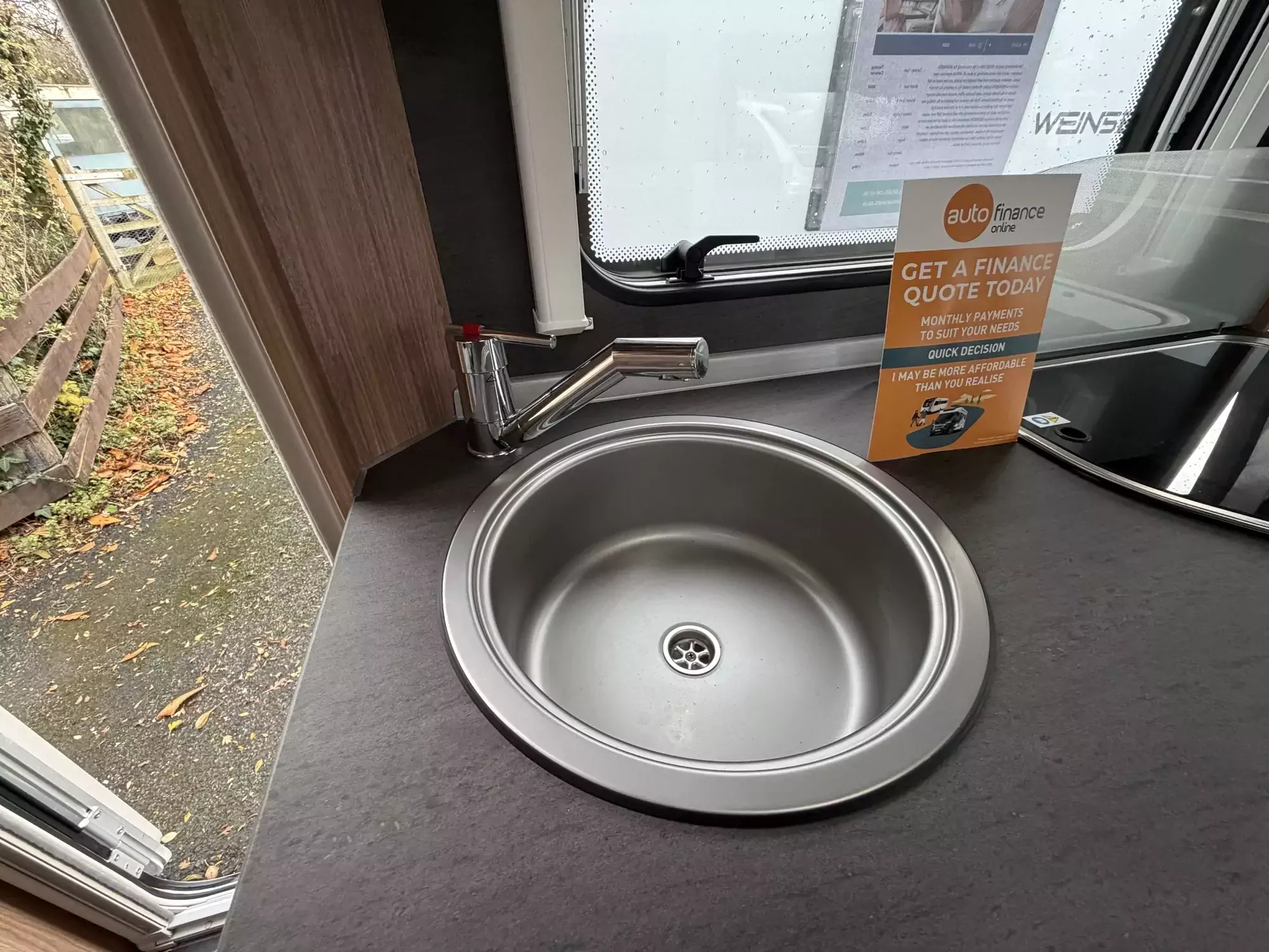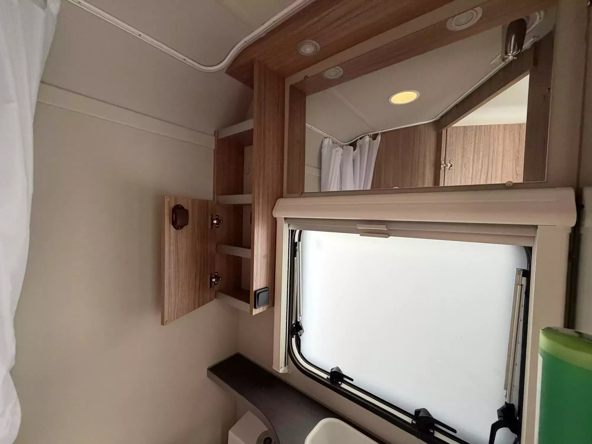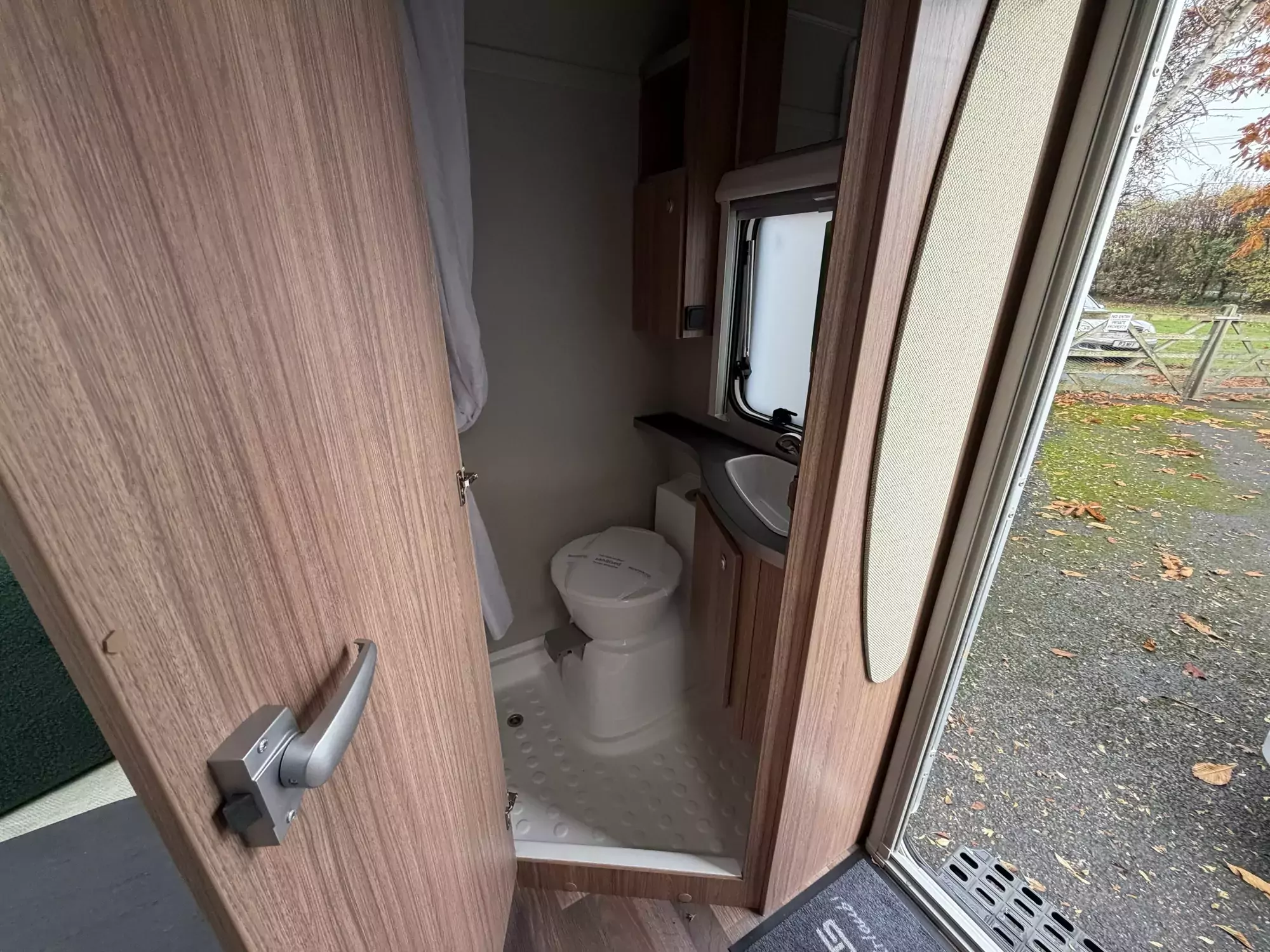 The kitchen block now comes standard with a gas oven, alongside the hob, sink, and fridge – perfect for preparing meals on the road. The washroom features a compact shower, wash basin, and cassette toilet, allowing you to freshen up easily without needing to leave the caravan.