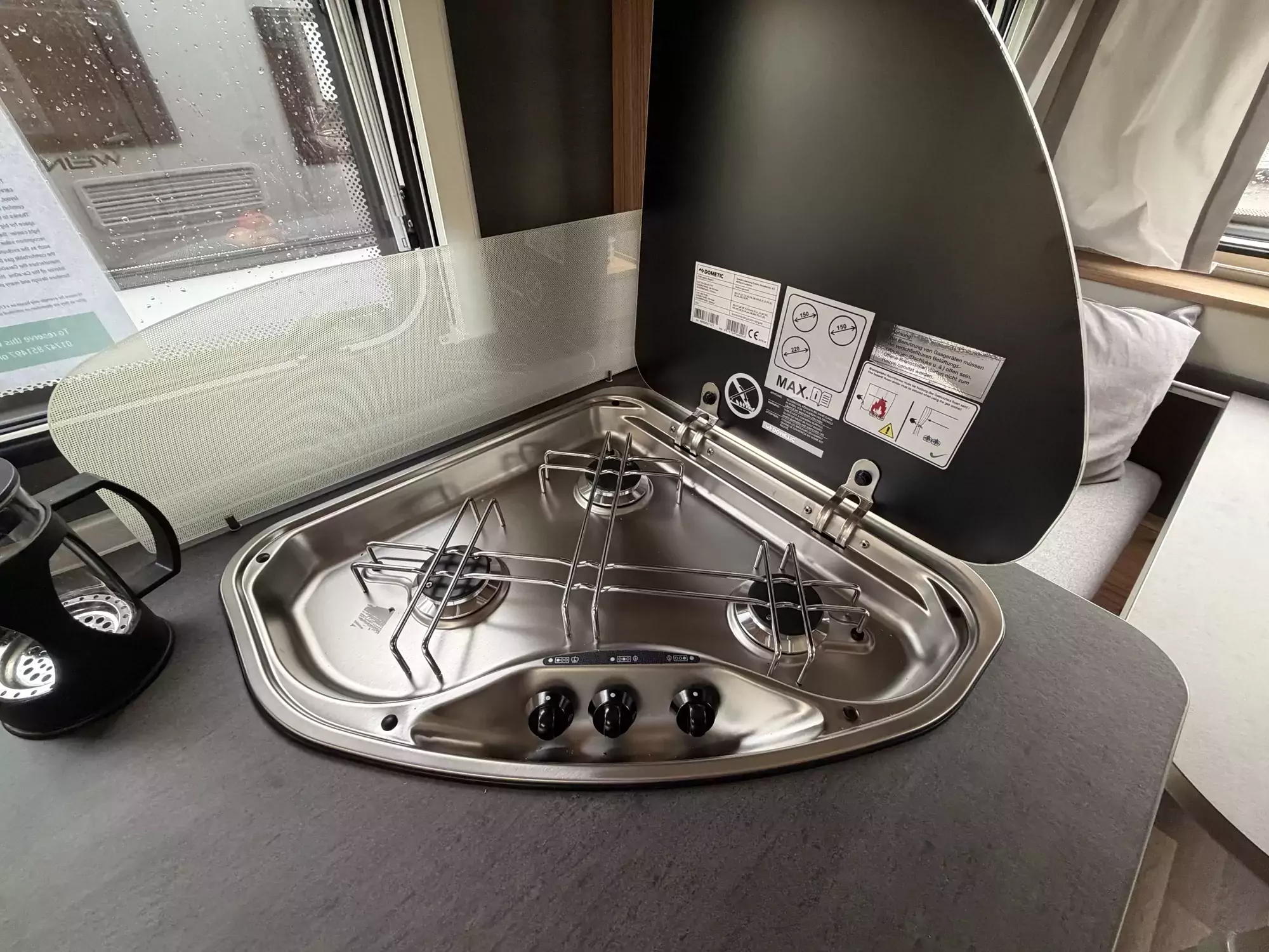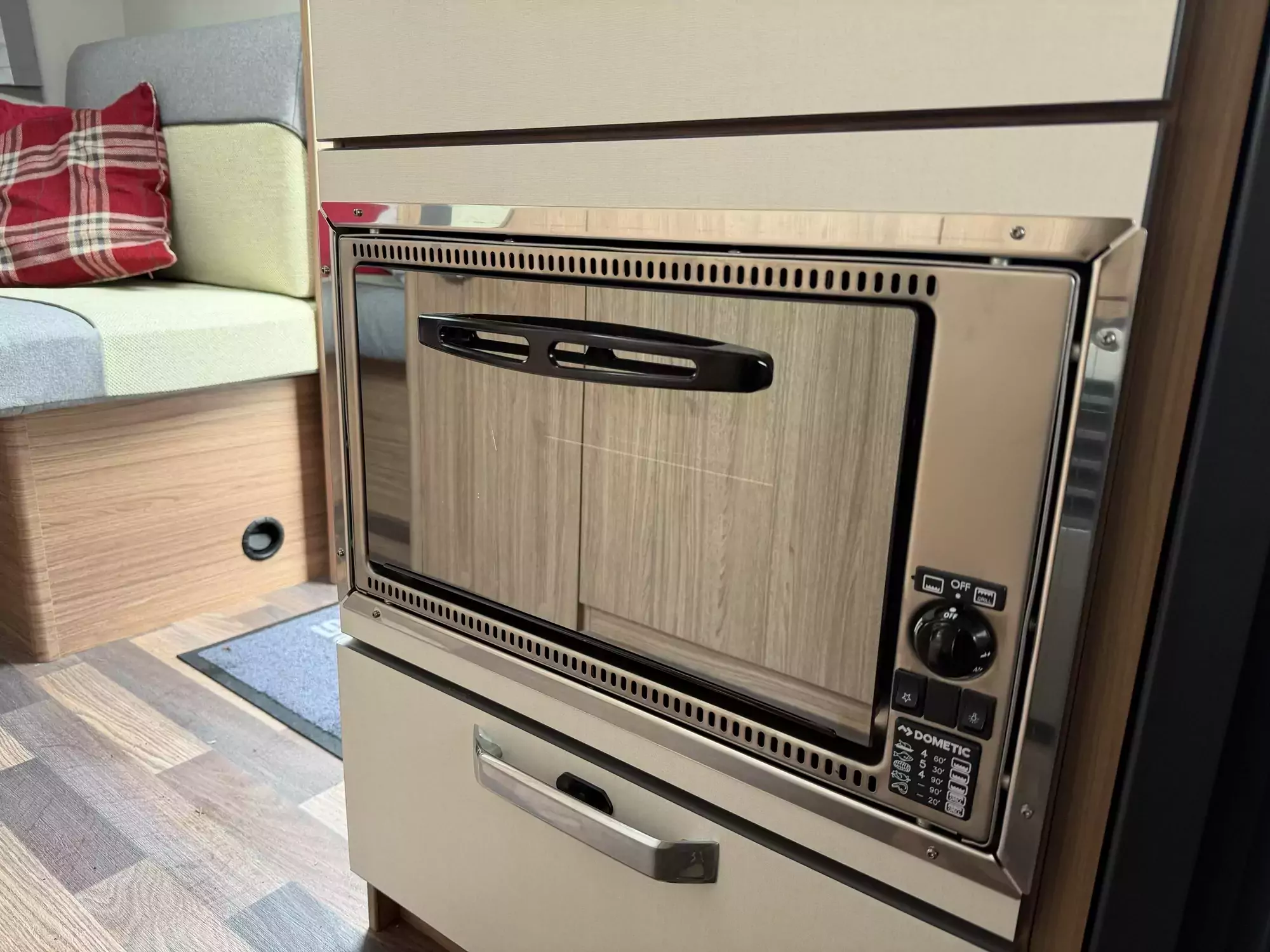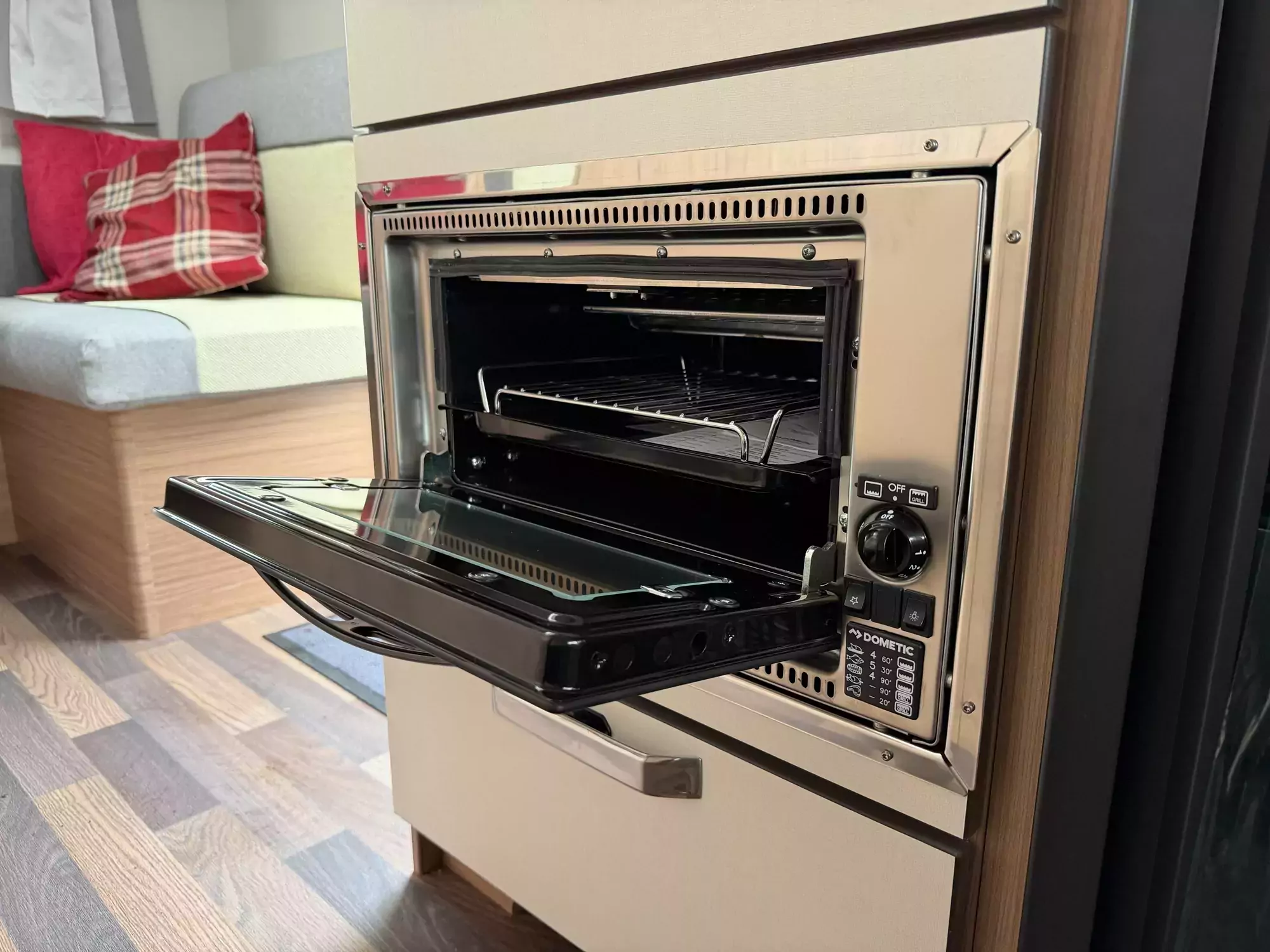 New for 2024 the Gas oven becomes a standard feature in the kitchen block along with the already resent Gas hob, sink and refrigerator. And finishing off the must haves is a small washroom, ideal for rinsing off sandy toes in the shower, brushing teeth in the wash basin, and meaning no need for trawling across the campsite in the middle of the night if you are caught short with the cassette toilet.