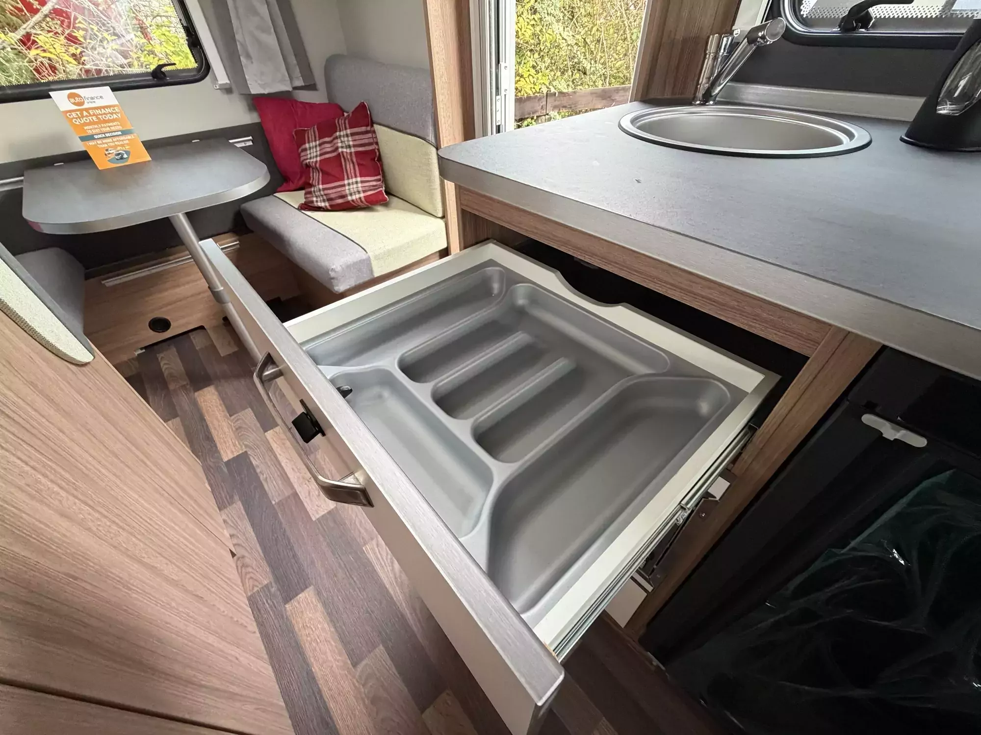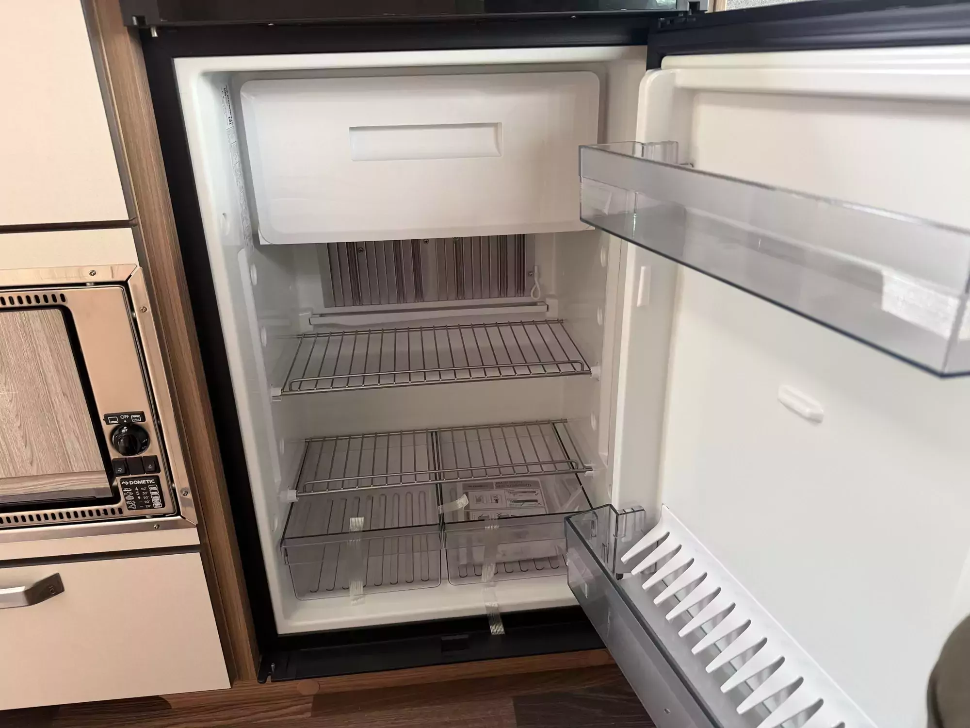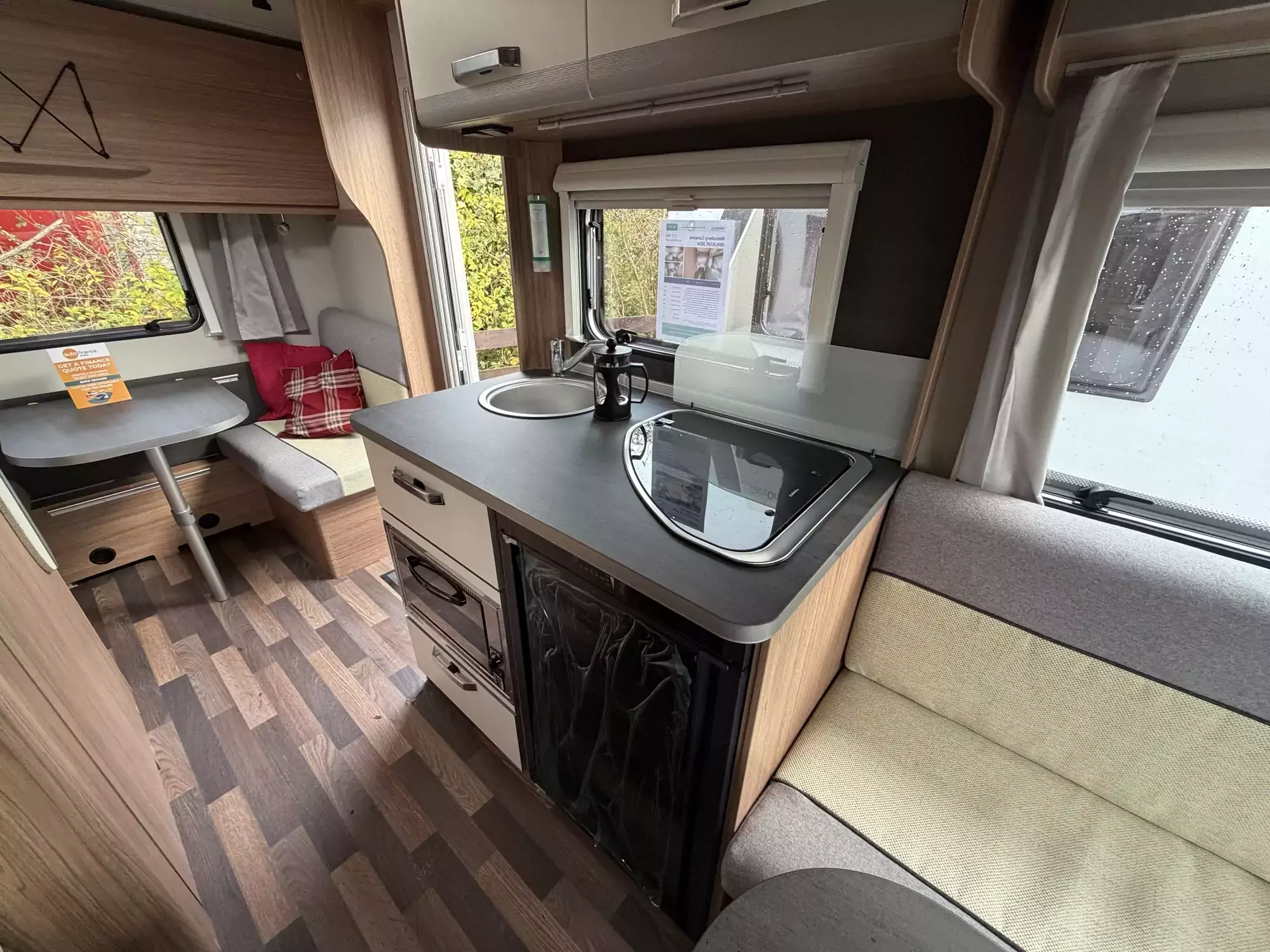 New for 2024 the Gas oven becomes a standard feature in the kitchen block along with the already resent Gas hob, sink and refrigerator. And finishing off the must haves is a small washroom, ideal for rinsing off sandy toes in the shower, brushing teeth in the wash basin, and meaning no need for trawling across the campsite in the middle of the night if you are caught short with the cassette toilet.