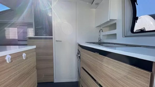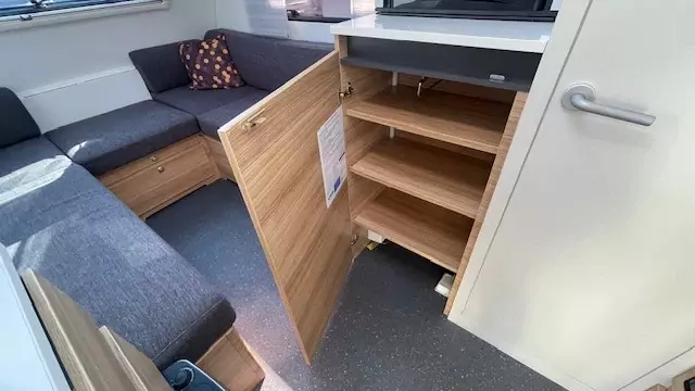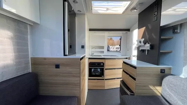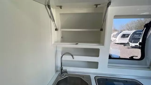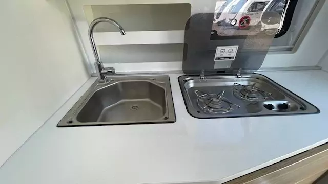 Step inside to discover a well‑appointed interior with comfortable seating that easily converts to generous sleeping for up to 2 people. The smart kitchen layout includes a hob, oven/grill and fridge — perfect for preparing meals on family holidays, while a practical washroom with shower, toilet and basin caters to everyday touring needs. Storage is cleverly integrated throughout to keep gear organised on long trips or weekend getaways. Built with quality materials and thoughtful design, this caravan balances durability with lightweight convenience.
