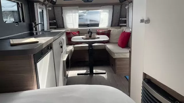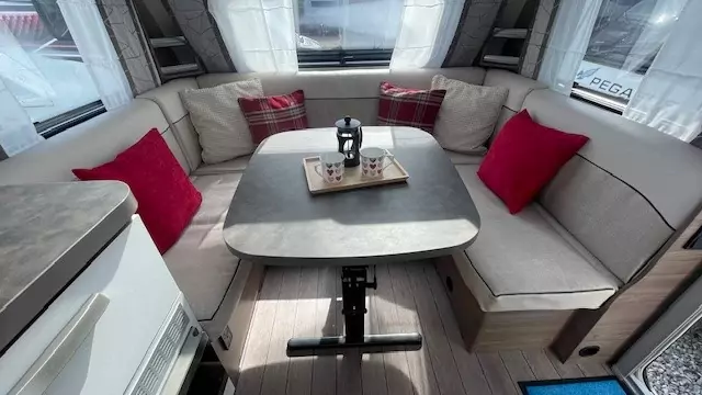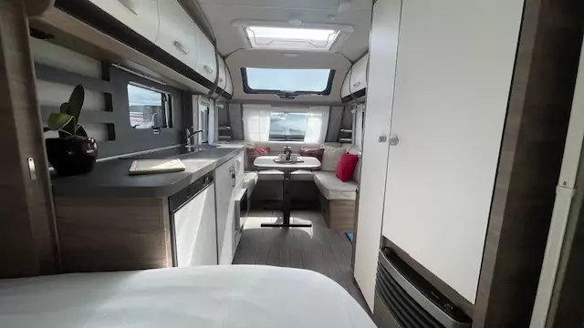 The 2021 Knaus Sport 500 UF is a 4 berth single axle caravan designed for versatility and a light towing weight. It has a large u-shaped lounge at the front, that converts into a double bed and a fixed french bed in the rear.