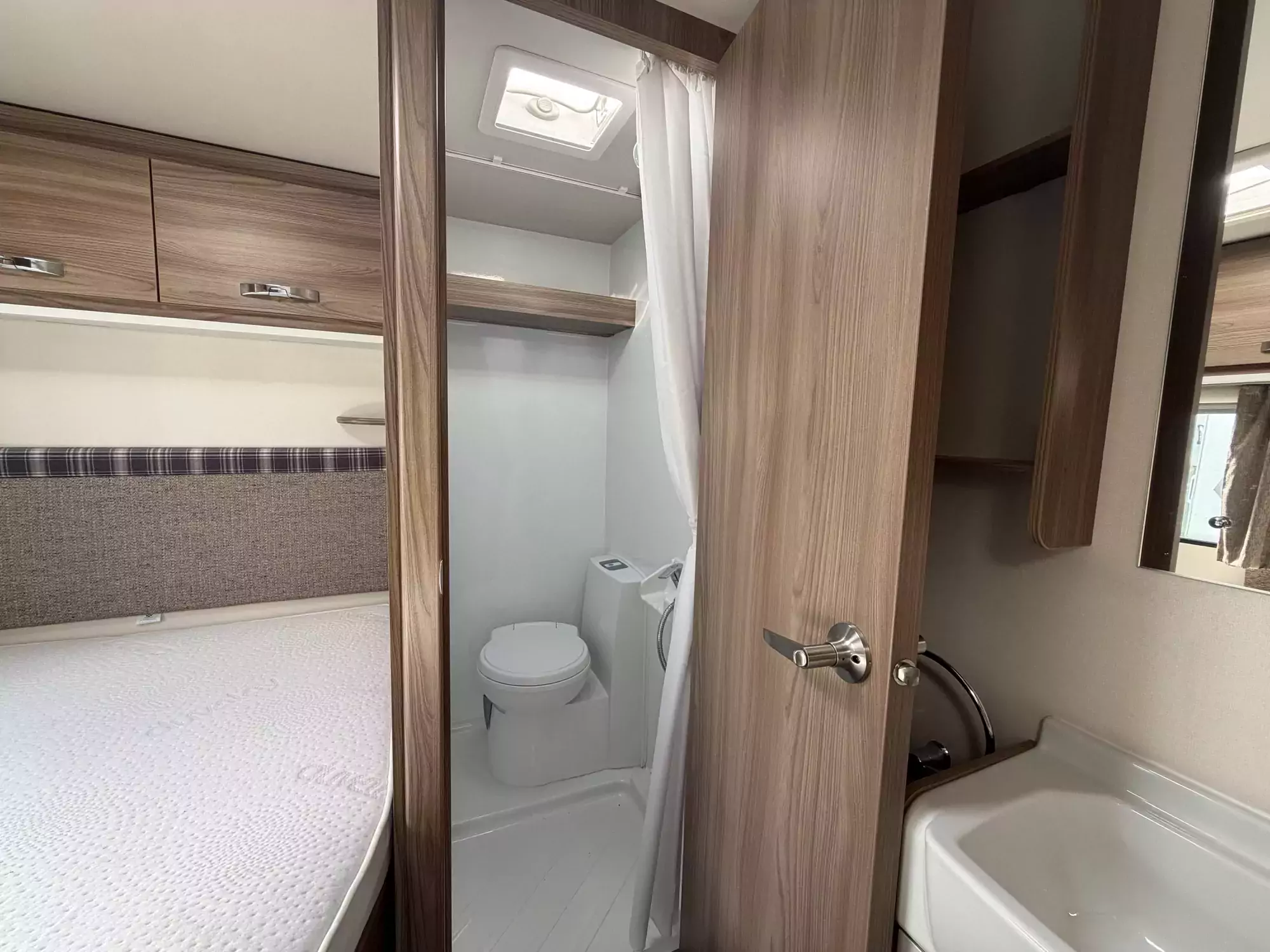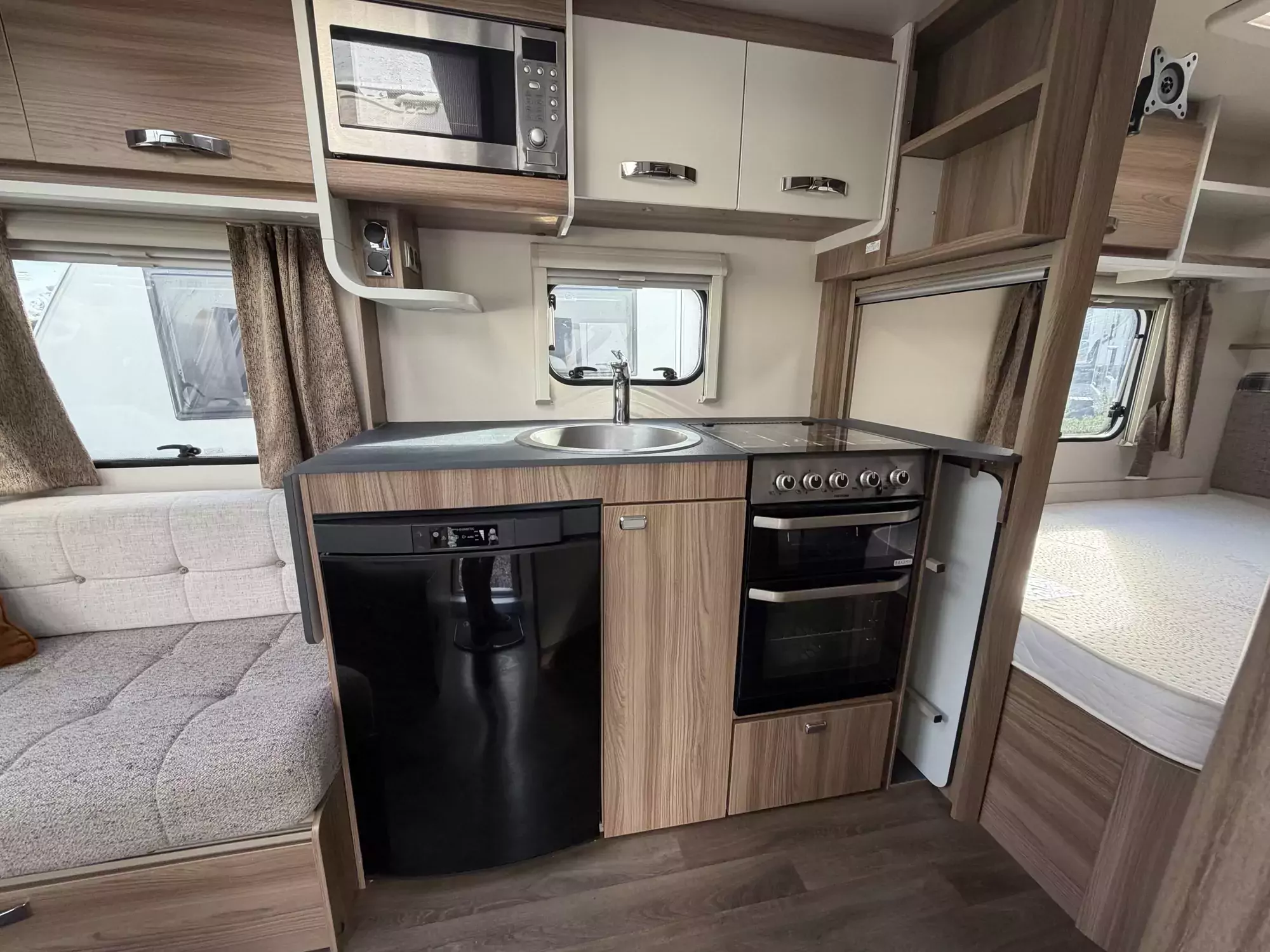 The Sprite Alpine 4 features a well-equipped kitchen with a Dometic fridge, 3-burner hob, oven, and separate grill. The integrated washroom includes essential facilities, ensuring practicality on the road.