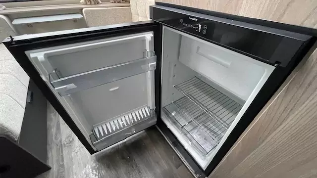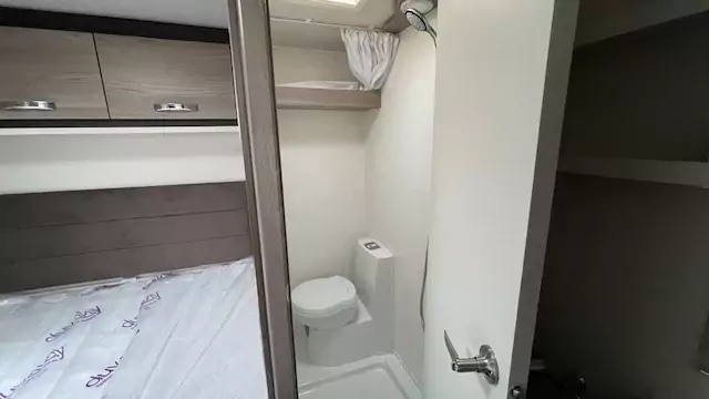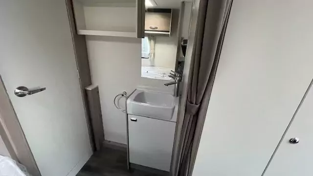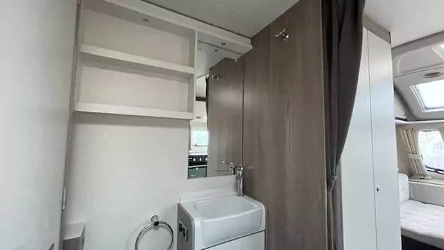 The well equipped kitchen comprises hob and oven, stainless steel sink with mixer and 98l under-counter fridge with freezer compartment, and the washroom style bathroom completes the offering with flushable cassette toilet, washbasin with vanity area, and built in hot shower system.