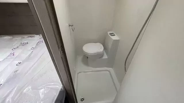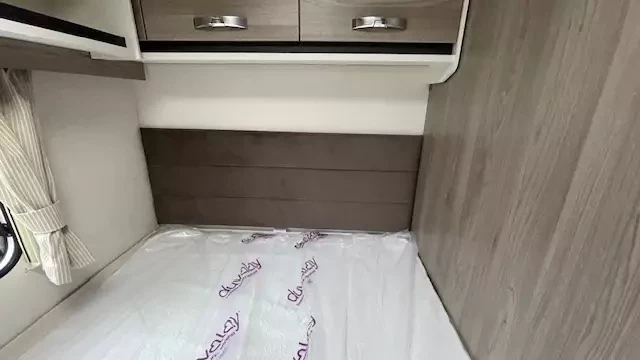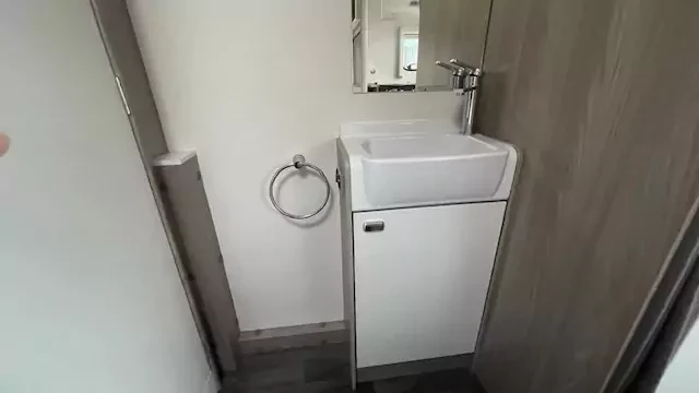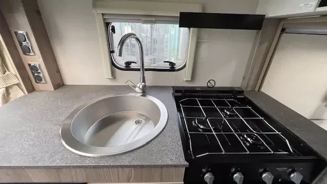 The well equipped kitchen comprises hob and oven, stainless steel sink with mixer and 98l under-counter fridge with freezer compartment, and the washroom style bathroom completes the offering with flushable cassette toilet, washbasin with vanity area, and built in hot shower system.