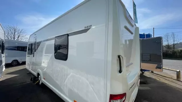 The 2022 Swift Challenger 560 SE is a popular 4 berth, single axle touring caravan featuring a desirable rear island bed and mid washroom layout. Built with SMART construction, it includes Alde wet central heating, a solar panel, and a well-equipped kitchen. It is designed for luxury touring, suitable for couples or families.