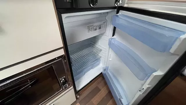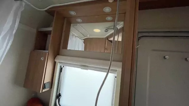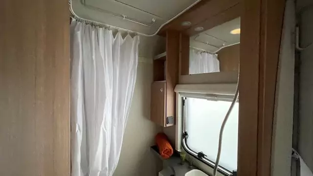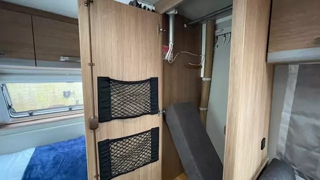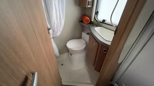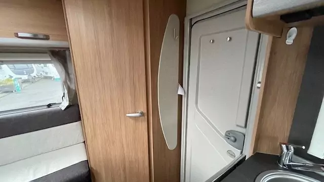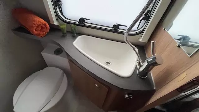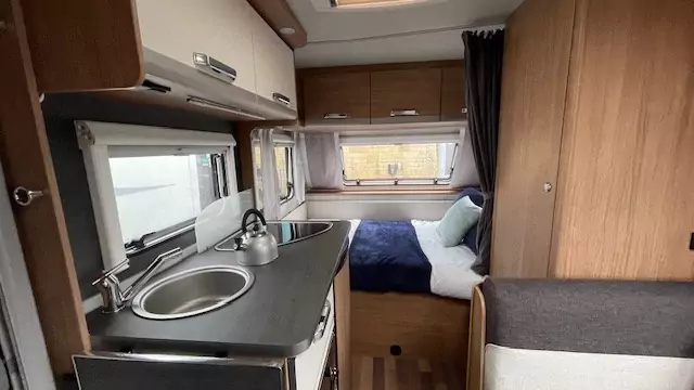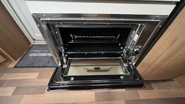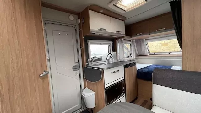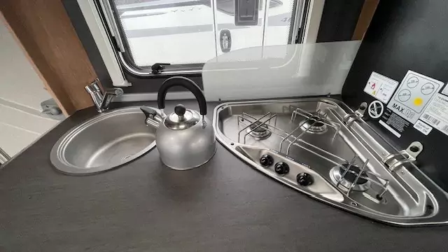 The kitchen block now comes standard with a gas oven, alongside the hob, sink, and fridge – perfect for preparing meals on the road. The washroom features a compact shower, wash basin, and cassette toilet, allowing you to freshen up easily without needing to leave the caravan.